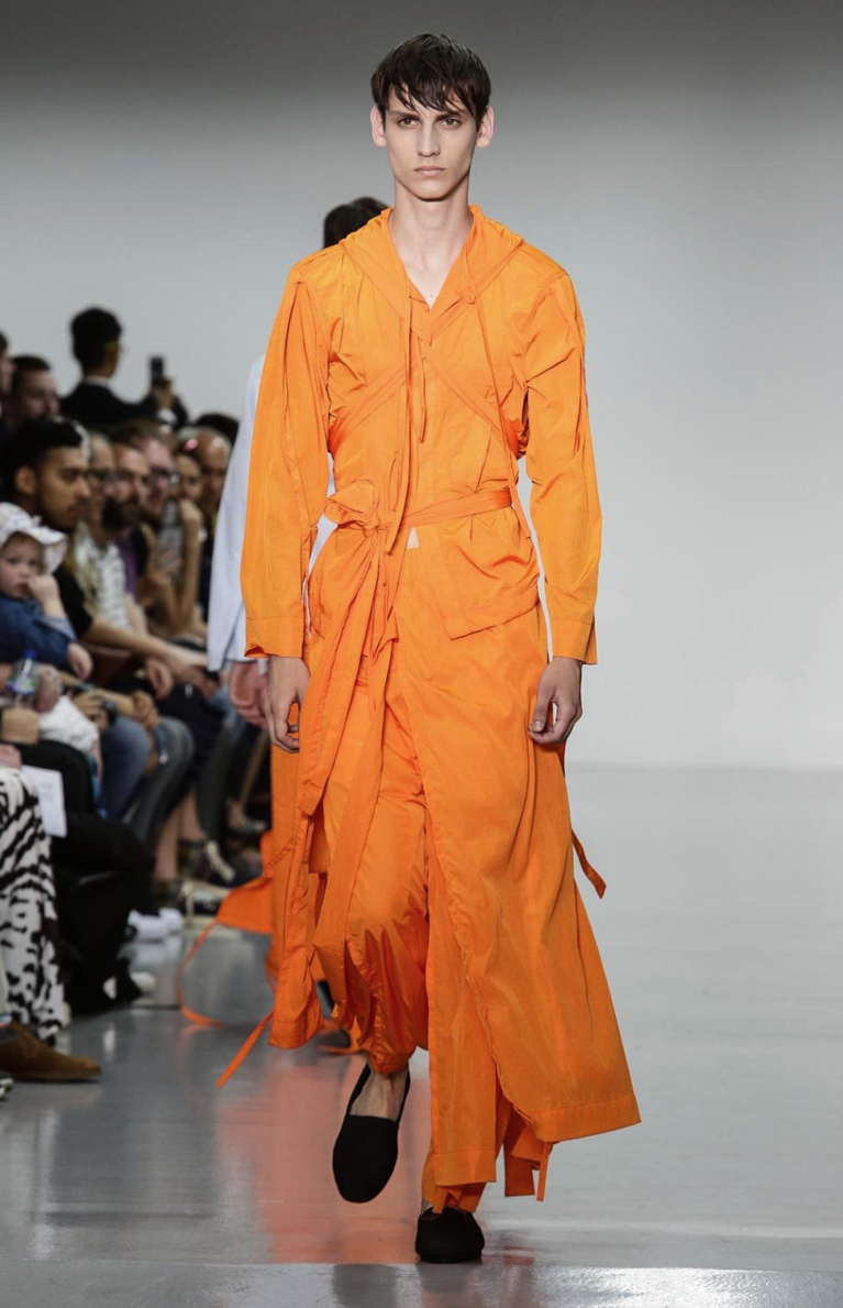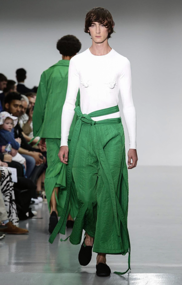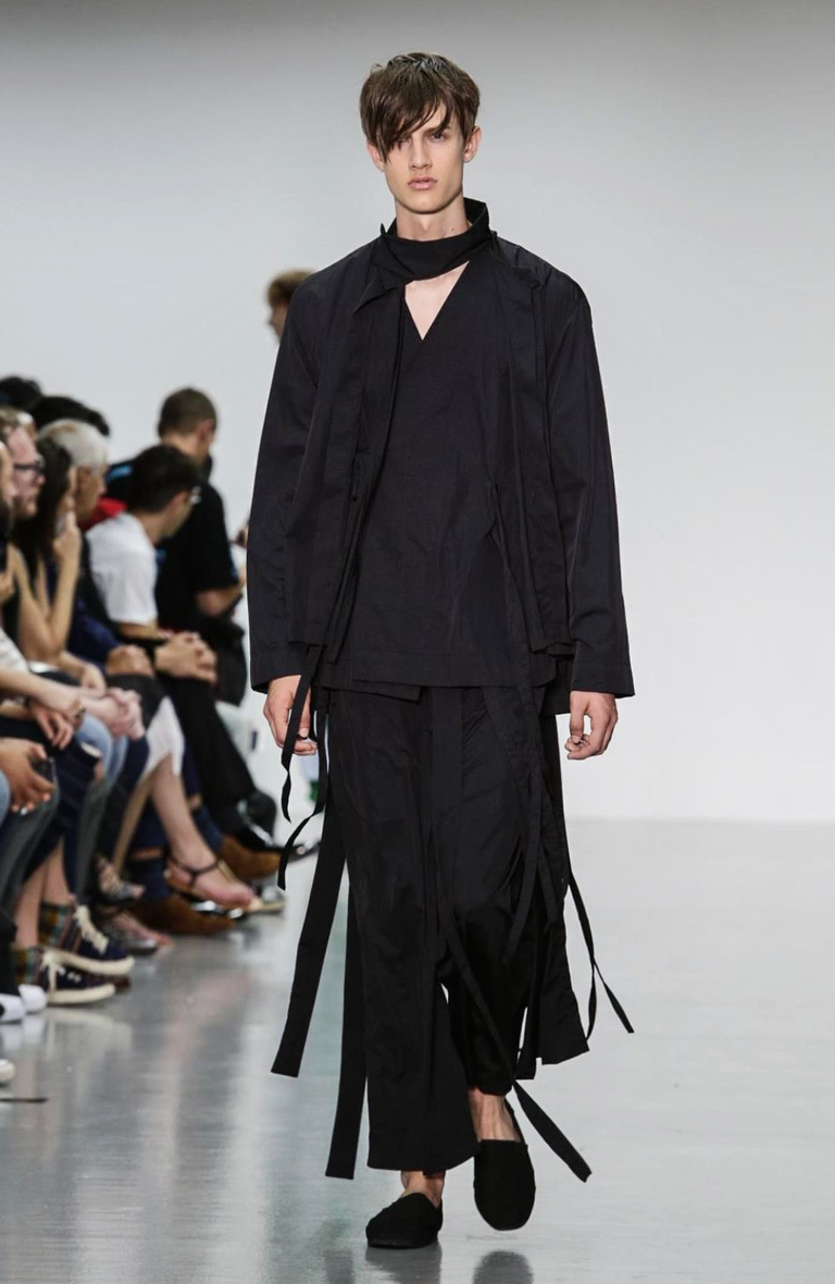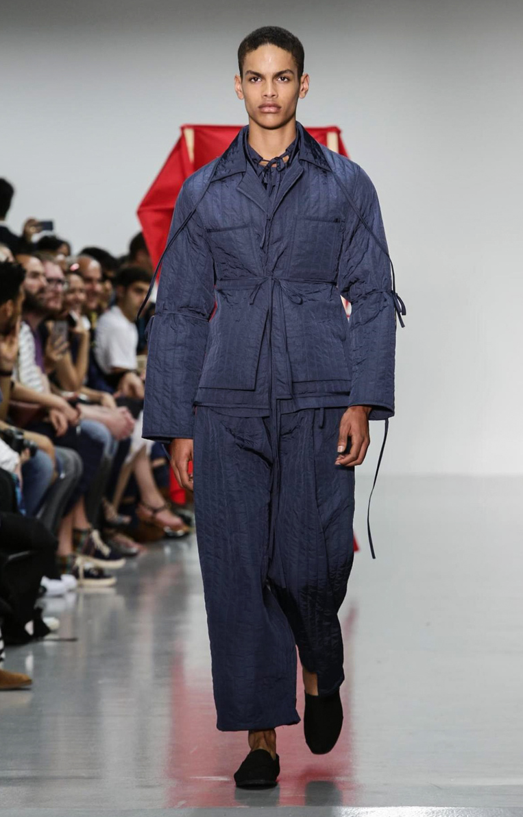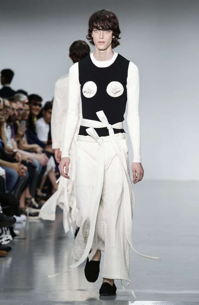 Topman Design’s eclectic show, neatly enough, came bundled with a mix-tape left on every seat. At Craig Green‘s, a few hundred yards away in the basement of Bloomsbury House, music played an equally critical role — this time, courtesy of a soundtrack of violins, skating and whirring in ripples and peaks of sound as Green’s models floated through the white-tiled space. Three seasons in (not counting his MAN apprenticeship), the designer’s aesthetic is already firmly established, somewhere in an interzone between Japanese workwear, medieval armour and ethereal ceremonial robes; an aesthetic that’s recently been rewarded by a finalist’s place in this year’s LVMH competition, and celebrated in a stunningly kinetic Nick Knight campaign released just a few days ago.