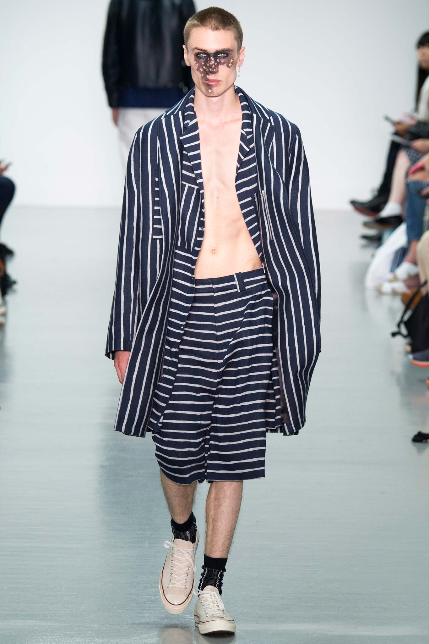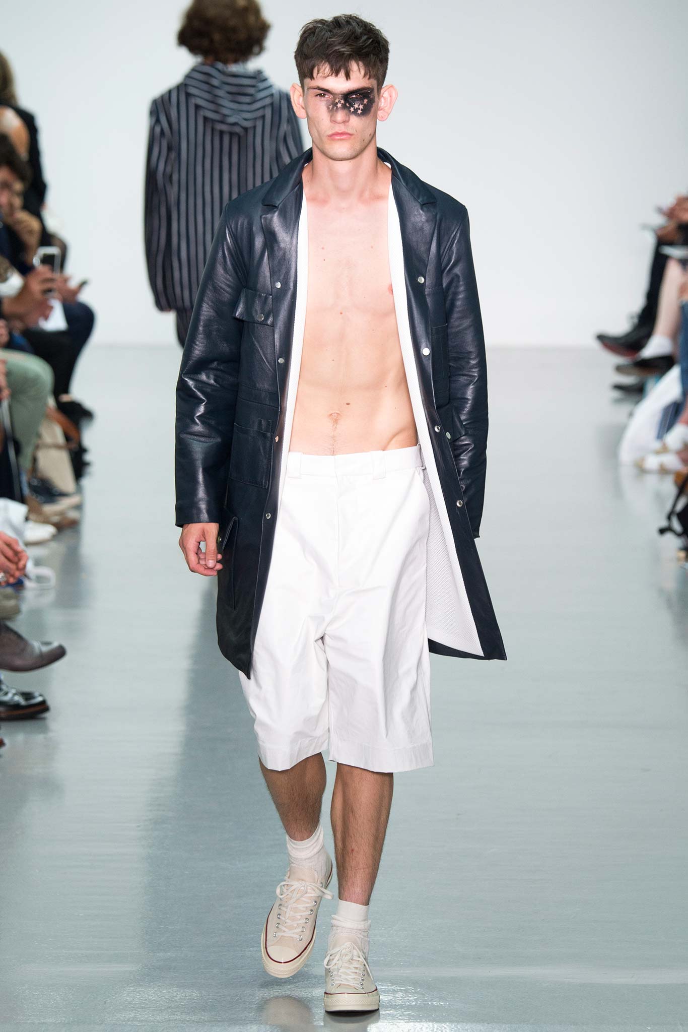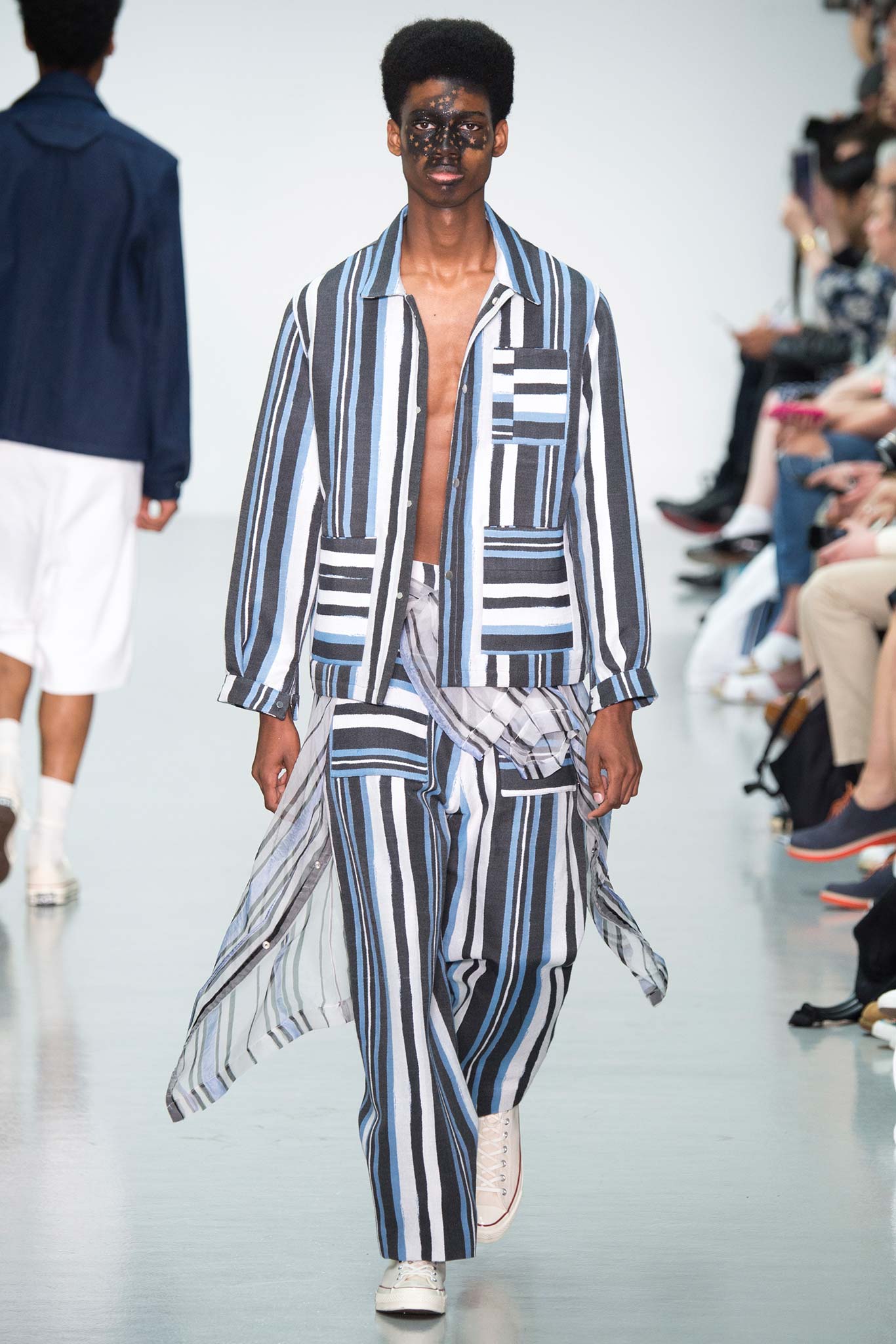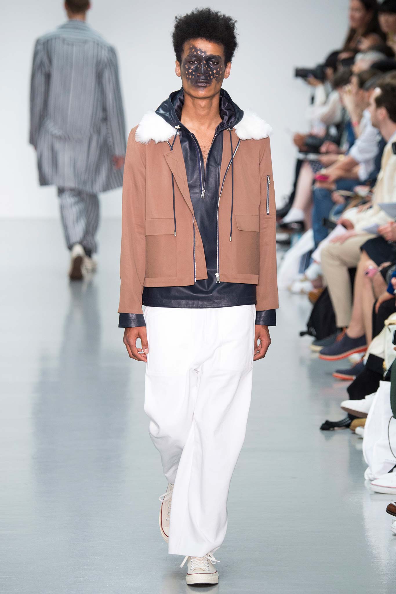 This time around, the trigger was fear, harking back to childhood nightmares of baddies and ghosts. That expressed itself in hand-scrawled stripes and flapping bogeyman silhouettes, in murky shades of cocoa, slate, denim, and midnight blue. The workwear details which have been cropping up in collection after collection this week were here too, with sleek leather utility vests worn under drab macs.
