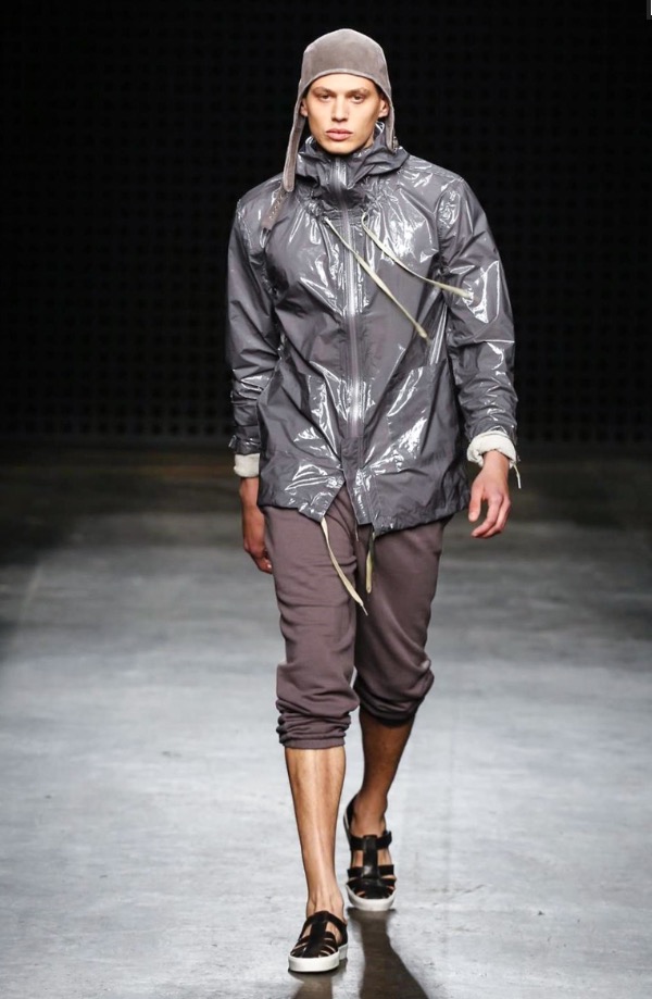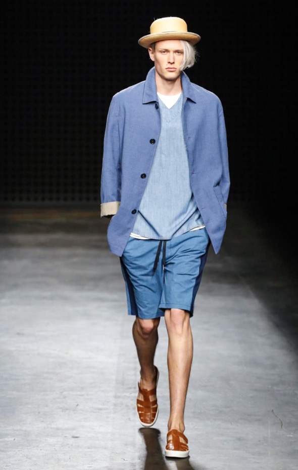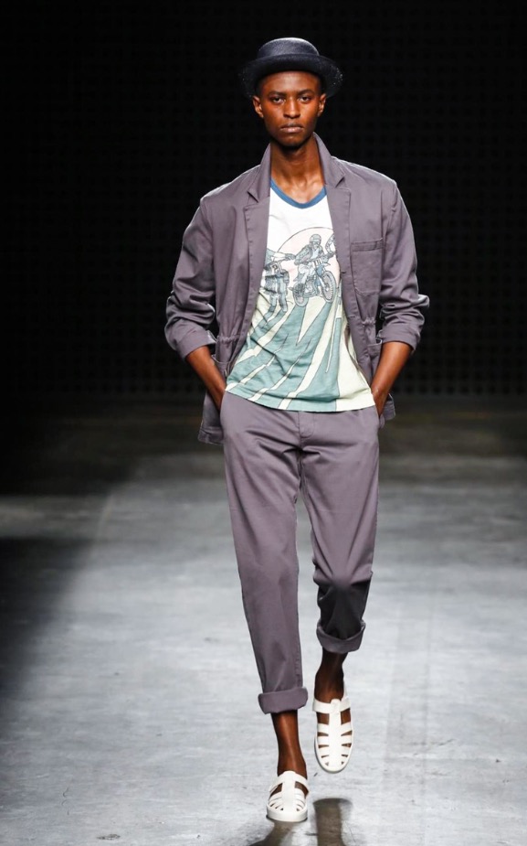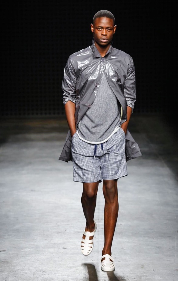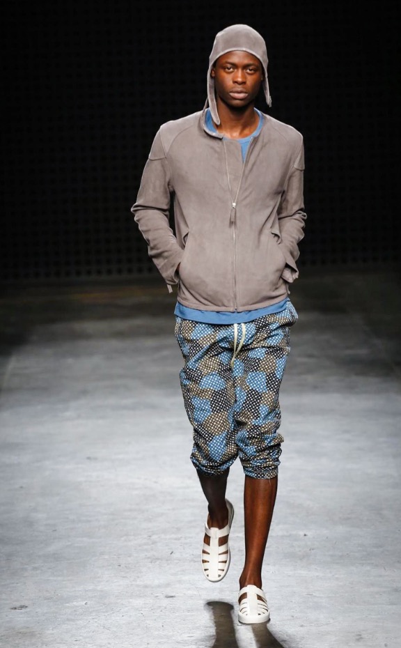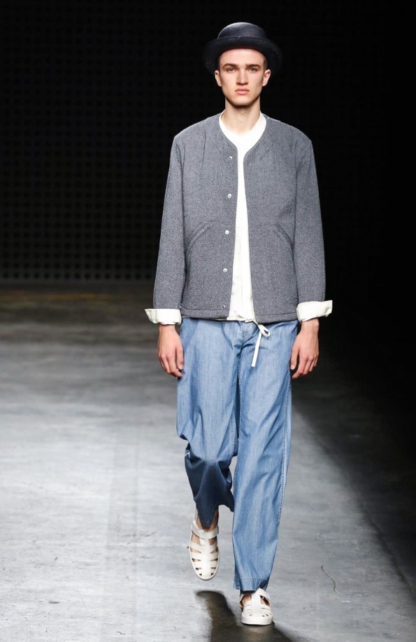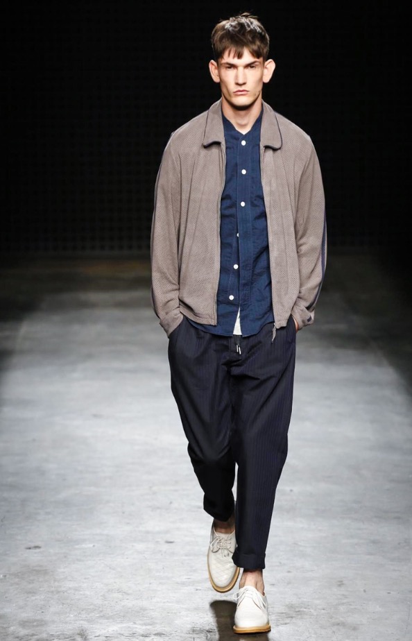 So there were low-slung boiler suits, broadly-cut trousers and trailing shirts, blended with supple suede jackets and easy athletic shorts. After last season’s harsh bursts of yellow, the palette was pared back to bleached neutrals and soft greys, echoing the gentle silhouettes of the garments themselves. It seems trite to throw the word “wearable” at YMC’s garments; realistic and comfortingly familiar, yes – but their approach was no less authentic for that.