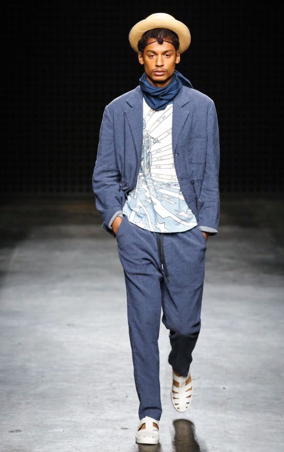 What was interesting, then, about YMC‘s show was how their new season’s vision followed that same language. Well into their third decade, YMC are part of the establishment here – but an establishment formed in the radical heat of the Nineties, which started many of London’s ongoing conversations around the modern masculine wardrobe. Their show notes explicitly referenced oriental work-wear; but unlike, say, Green’s work, the garments that circled the Sorting Office runway (round columns boxed out with heavy black grids) incorporated that influence far more delicately.