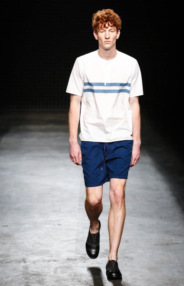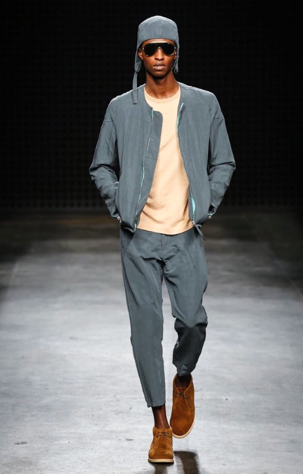 So there were low-slung boiler suits, broadly-cut trousers and trailing shirts, blended with supple suede jackets and easy athletic shorts. After last season’s harsh bursts of yellow, the palette was pared back to bleached neutrals and soft greys, echoing the gentle silhouettes of the garments themselves. It seems trite to throw the word “wearable” at YMC’s garments; realistic and comfortingly familiar, yes – but their approach was no less authentic for that.