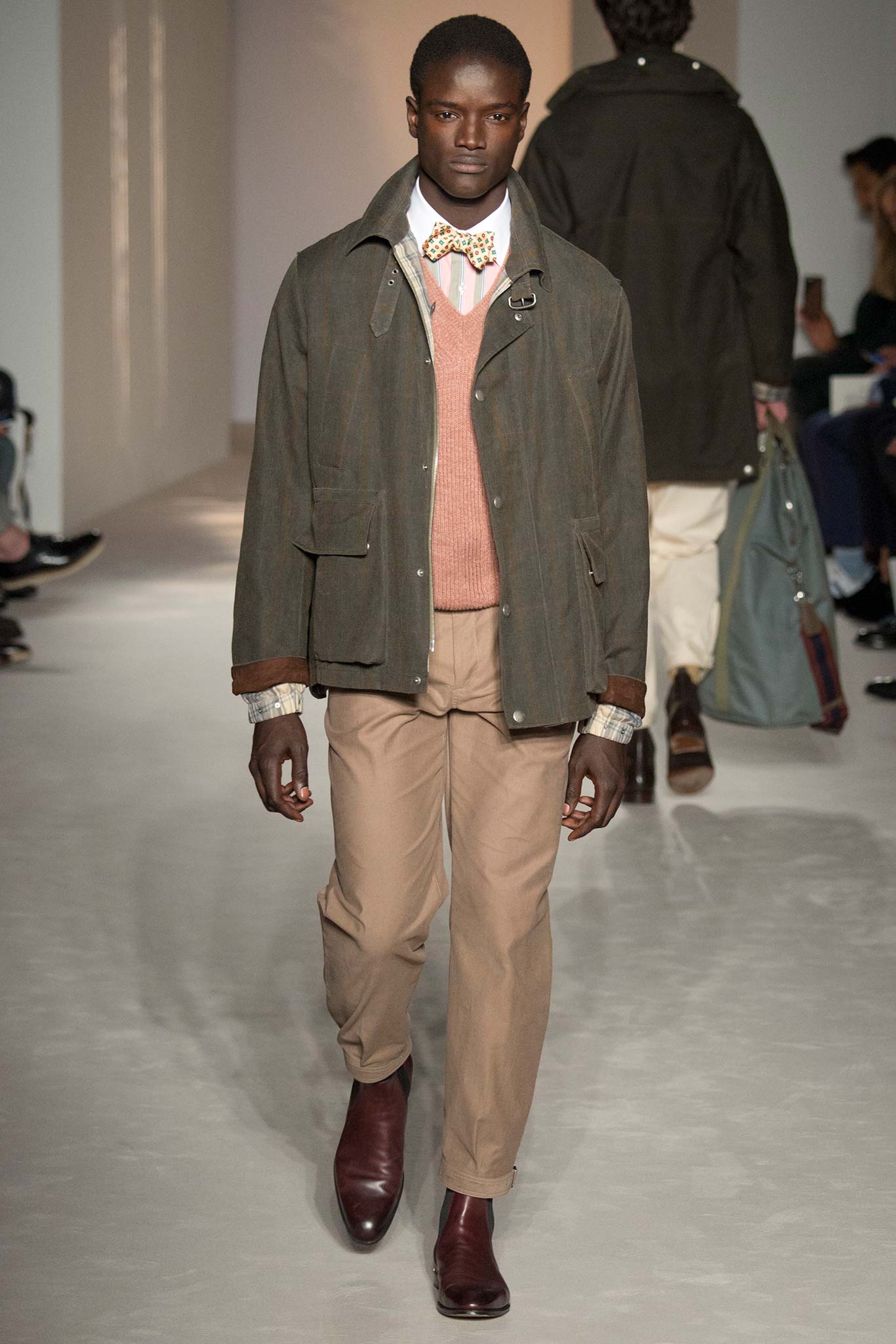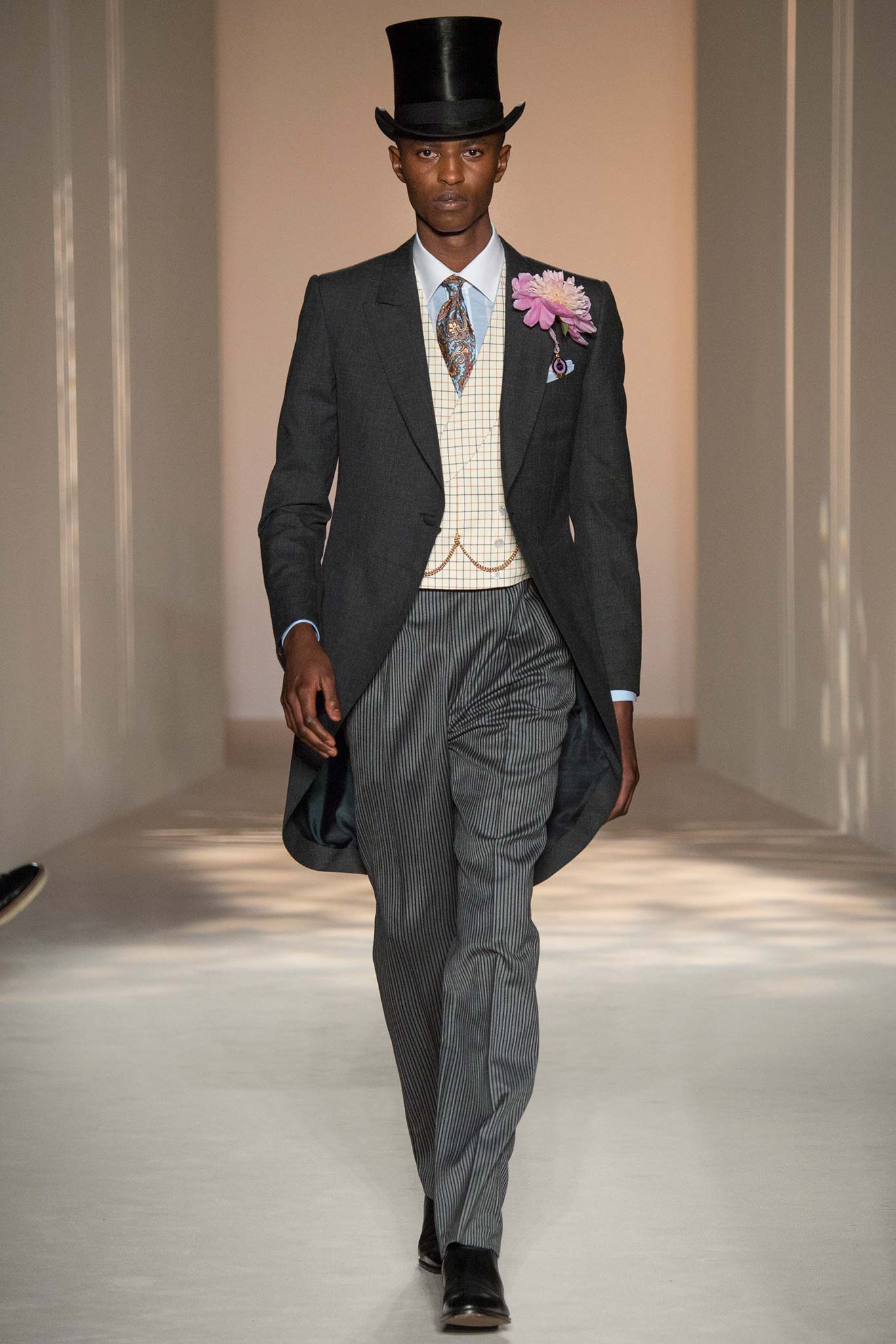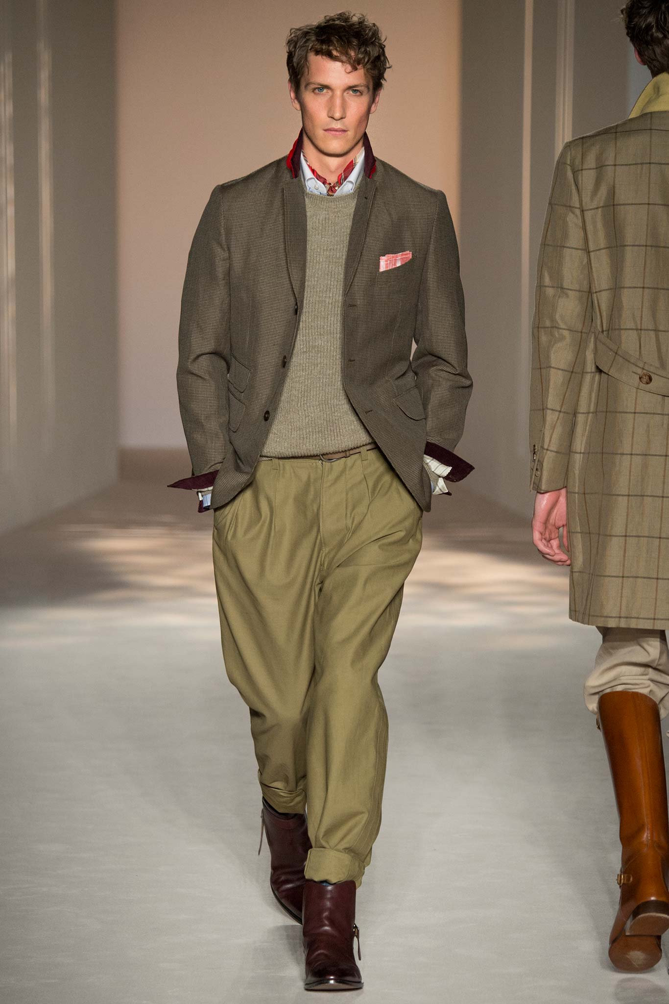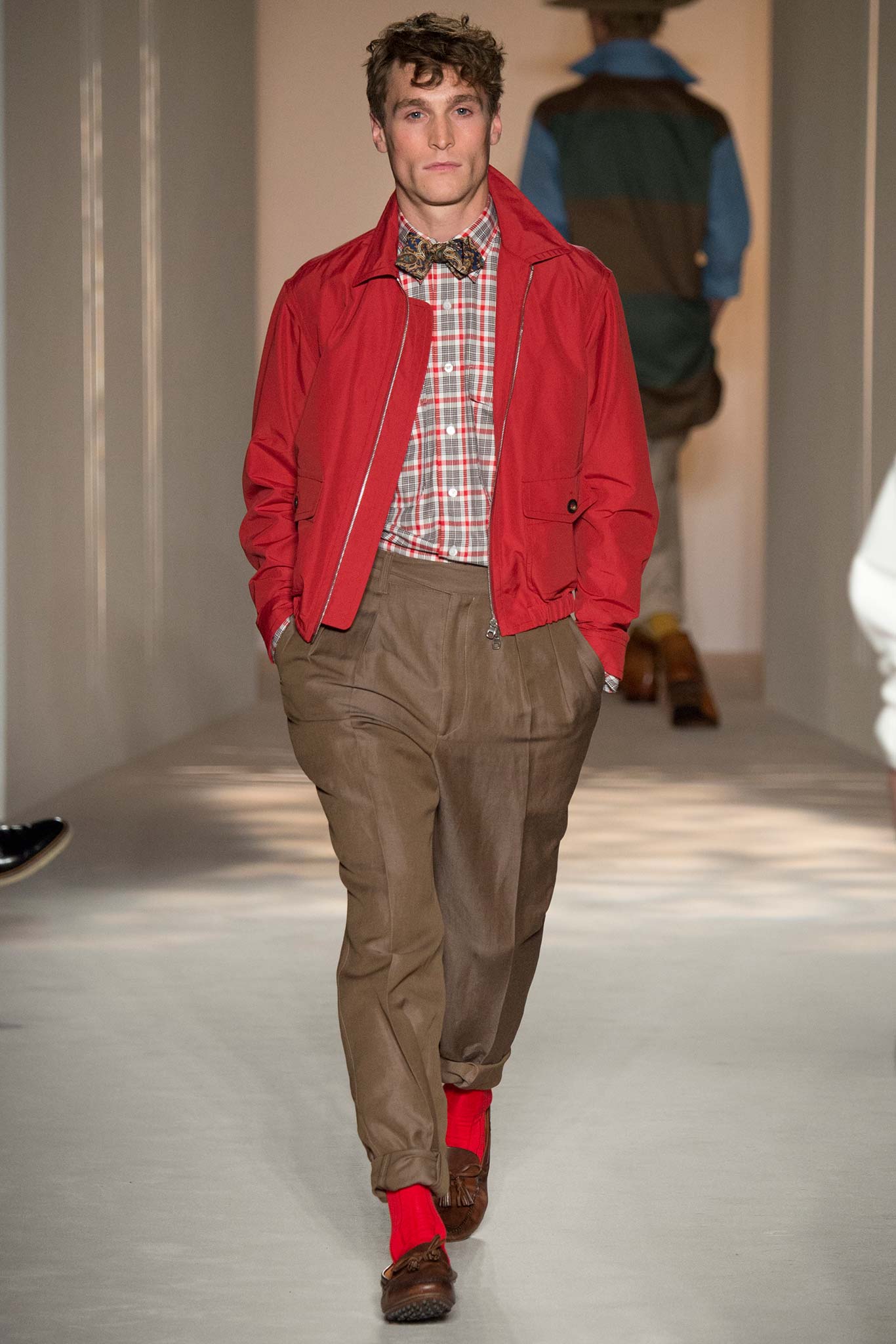 “It’s about British classicness, town and country, and Edward VIII. I didn’t want it to be super-styled,” said Ray, whose lineup spanned generations, seasons and times of day. There were morning suits and top hats, jaunty V-neck sweaters layered under plaid jackets – think Eddie Redmayne at Cambridge – and hunting jackets, all of which could easily transform the nouveau riche into lords — or, at the very least, clubbable members of the upper classes.