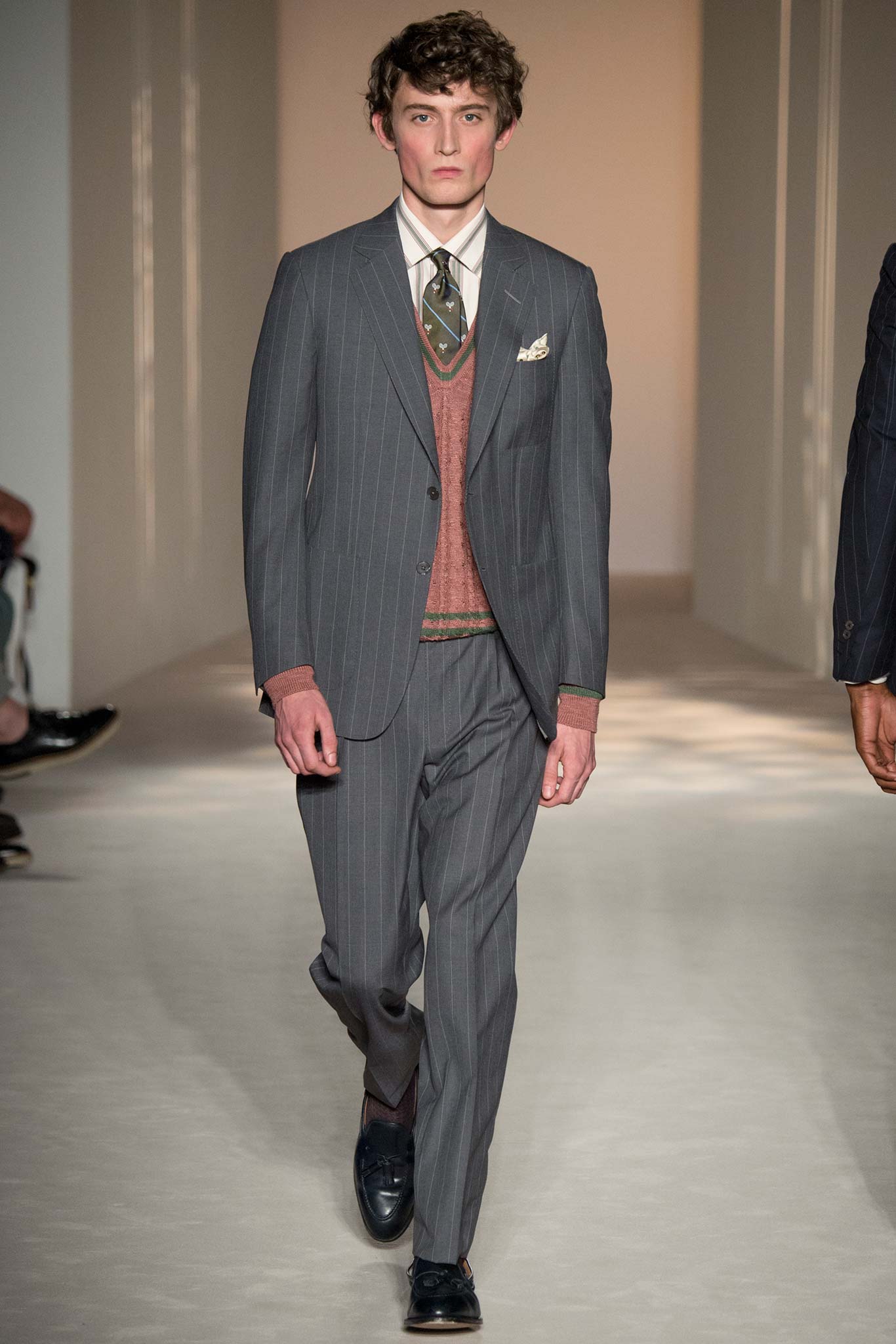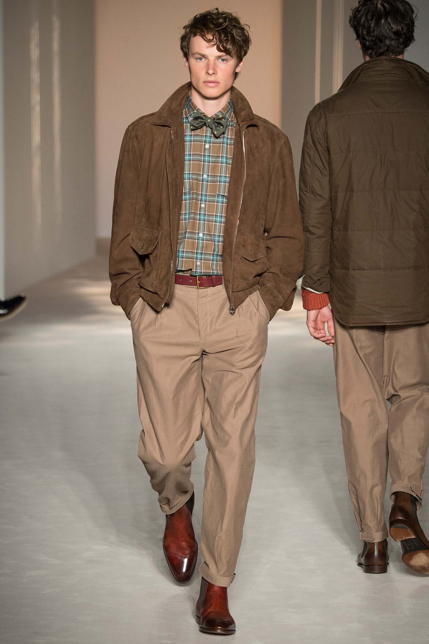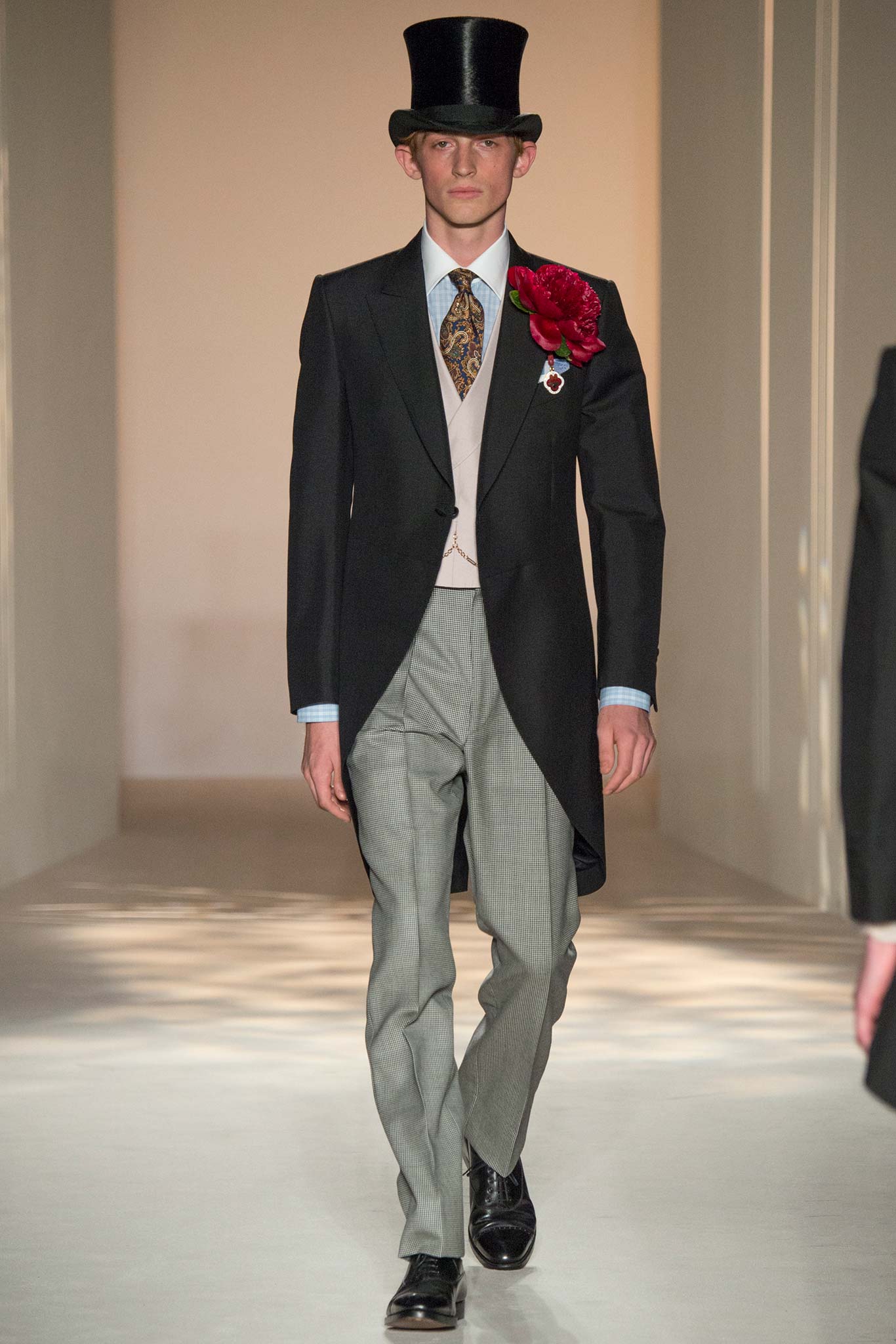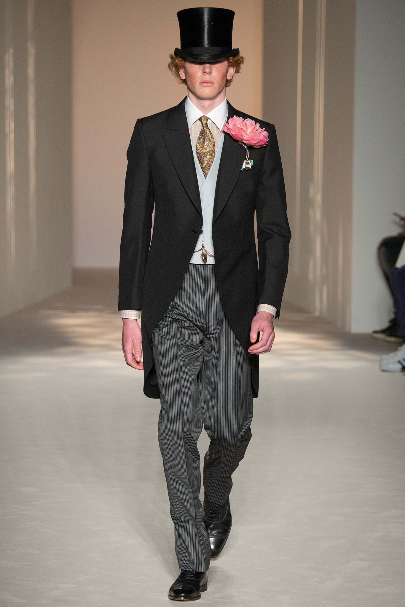 “It’s about British classicness, town and country, and Edward VIII. I didn’t want it to be super-styled,” said Ray, whose lineup spanned generations, seasons and times of day. There were morning suits and top hats, jaunty V-neck sweaters layered under plaid jackets – think Eddie Redmayne at Cambridge – and hunting jackets, all of which could easily transform the nouveau riche into lords — or, at the very least, clubbable members of the upper classes.