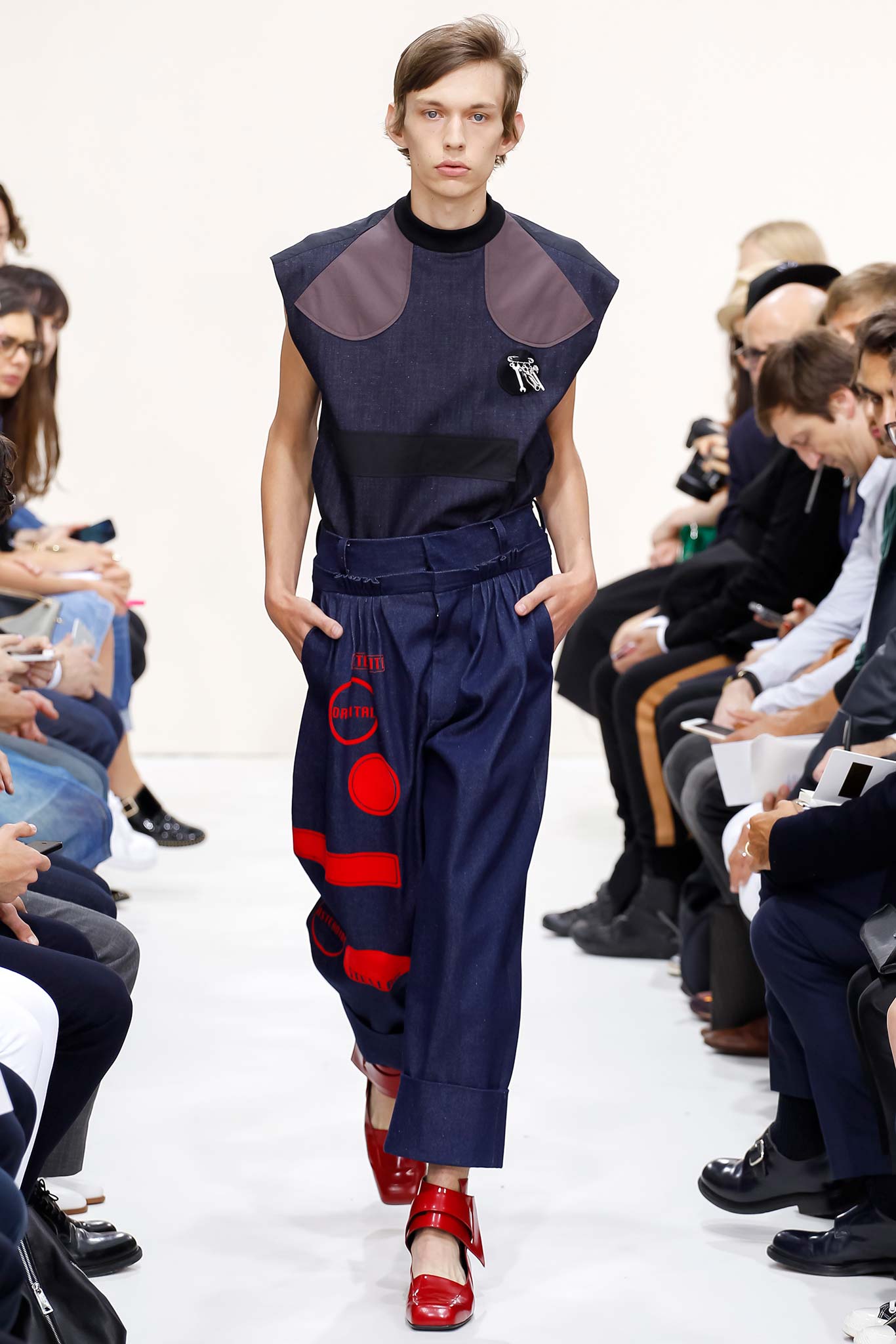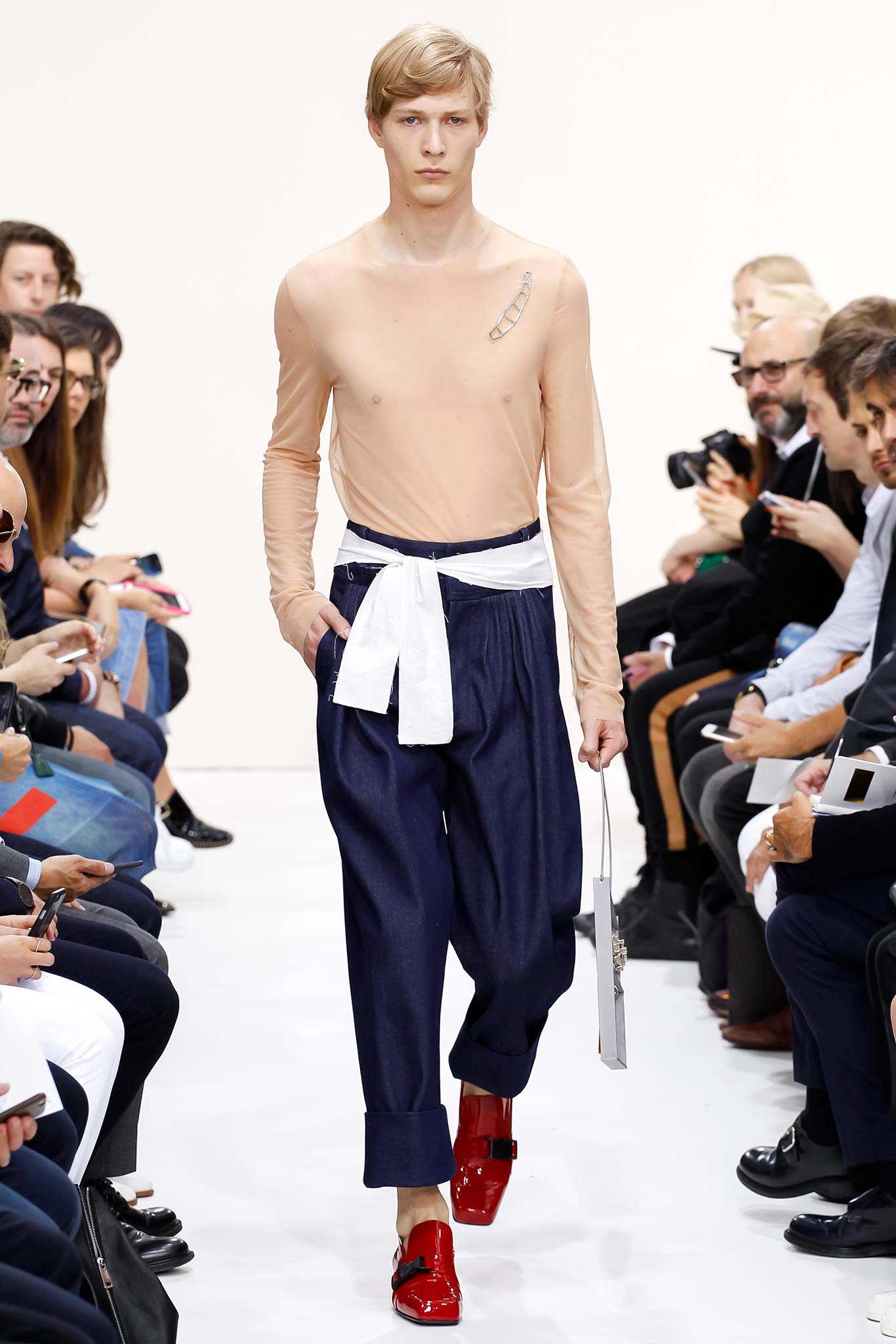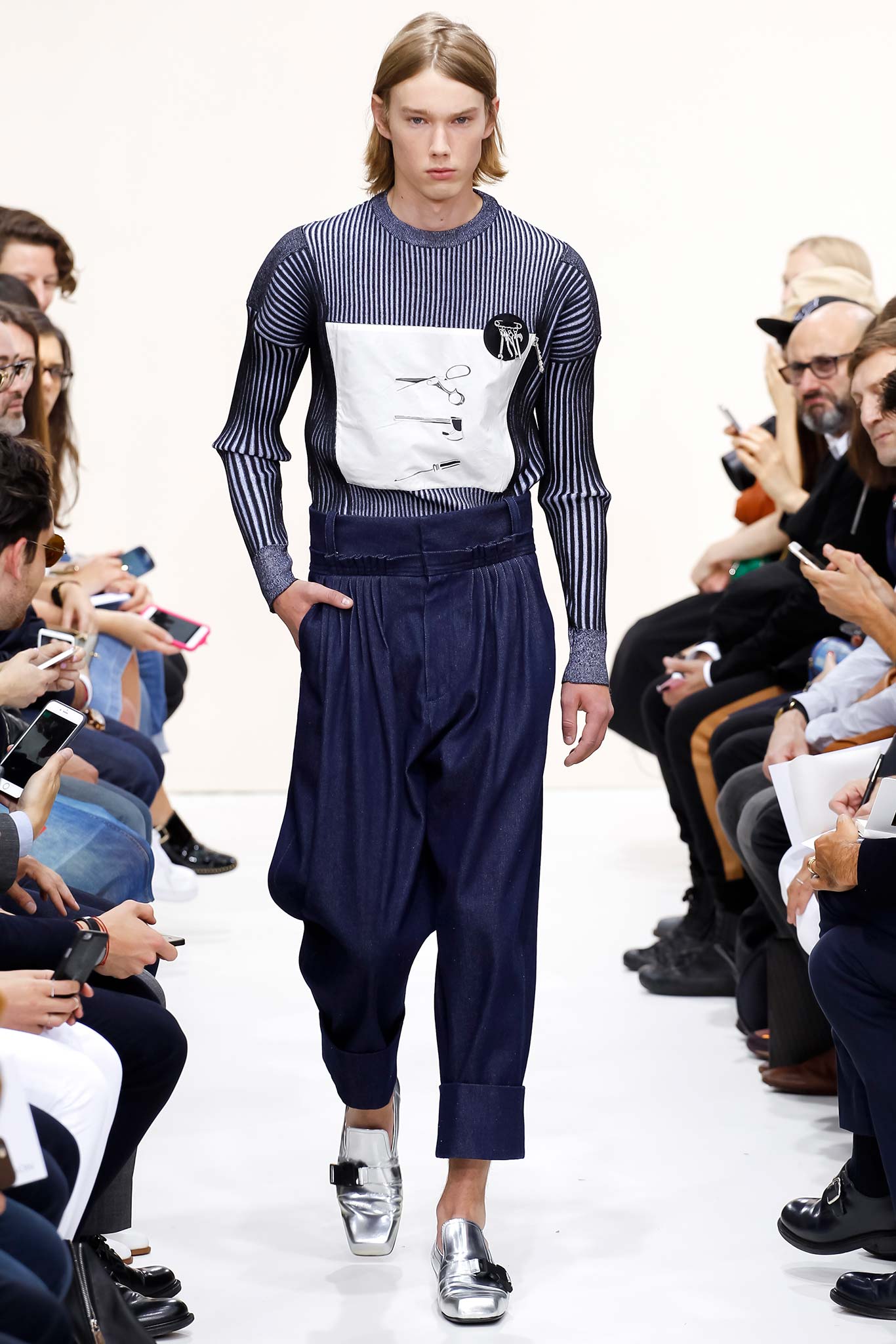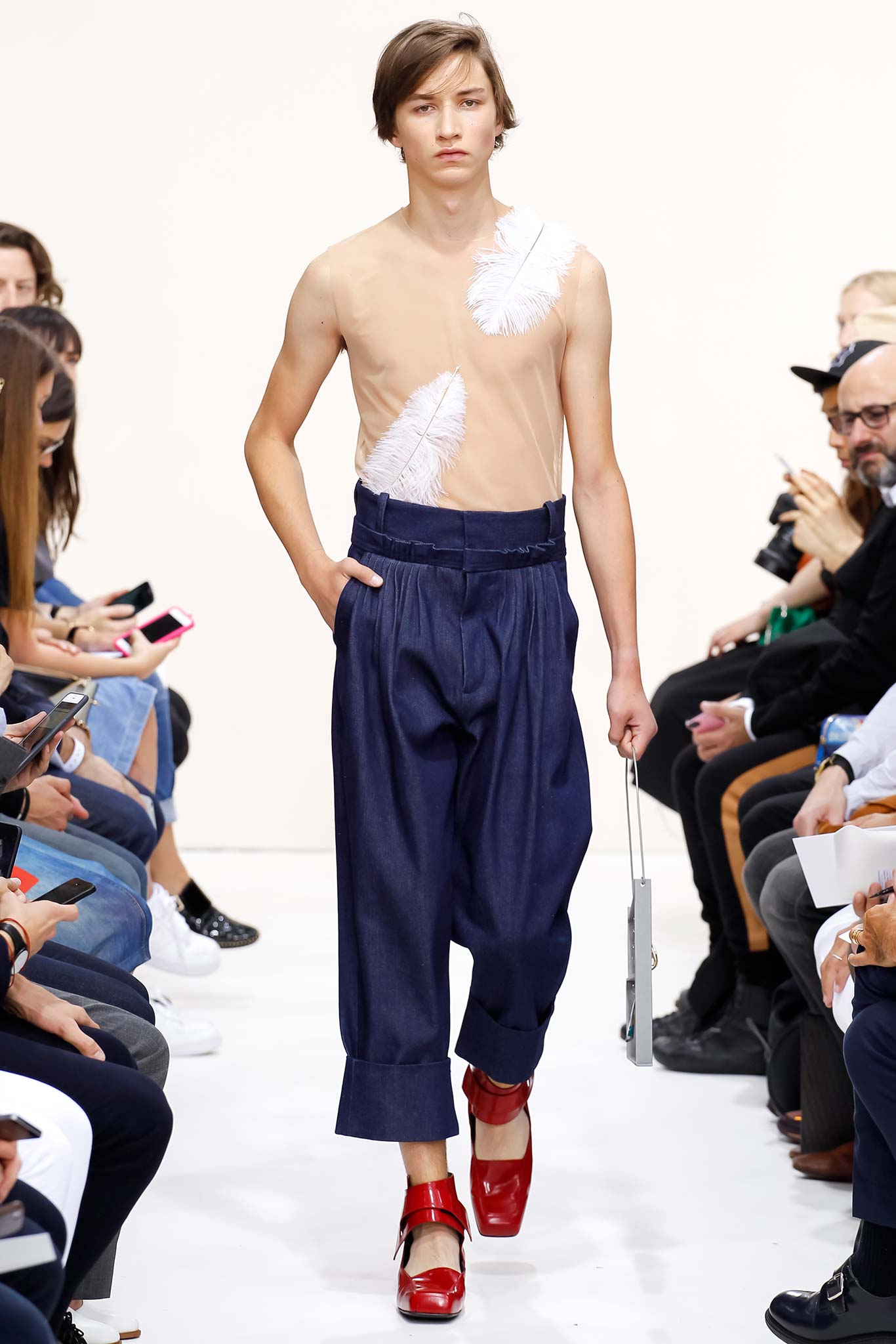 Former themes of ‘70s subculture, Futurism, and mundanity took a red shift this season with a collection that read like an homage to the chosen ‘uns: endangered artisans rescued from a post-apocalyptic world to be based in a space station in the distant future is one way to make sense of it. Heavyweight denim was emblazoned with words like “orbital” and “stellar.” Gentle creatures that would not have seemed out of place in an Egon Schiele painting glided down the clinically white show space, with an abstracted toolbox in hand and a set of favourite tools stitched onto their left chests, close to their heart. A second look at the toolbox revealed everyday trinkets like a whistle, a bottle opener, and even a particular self-pleasuring object. Crossword puzzles appropriated onto structured knits bring to mind unremarkable Sunday afternoons at home, passing time. Themes of banality were matched with a move towards Essentialism, intended to strip Anderson’s world to its bare necessities. Nude was opted wherever possible, leaving bare skin to emerge through fragile tulle, echoing the artisan’s introspective psyches. White flume was added for a touch of artistic flourish while roomy Judo trousers gave a brush of utility.