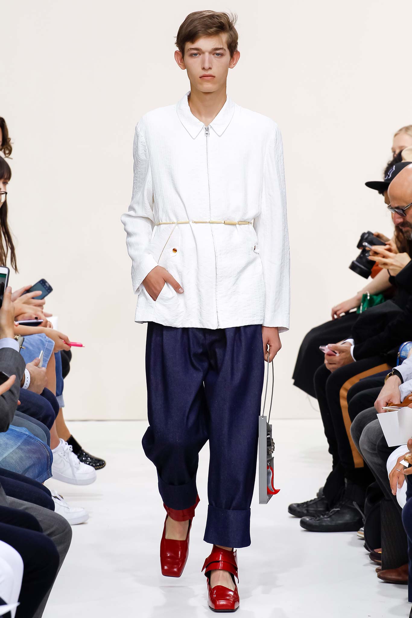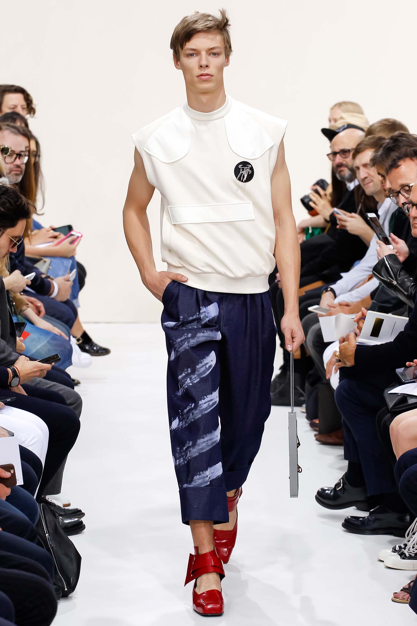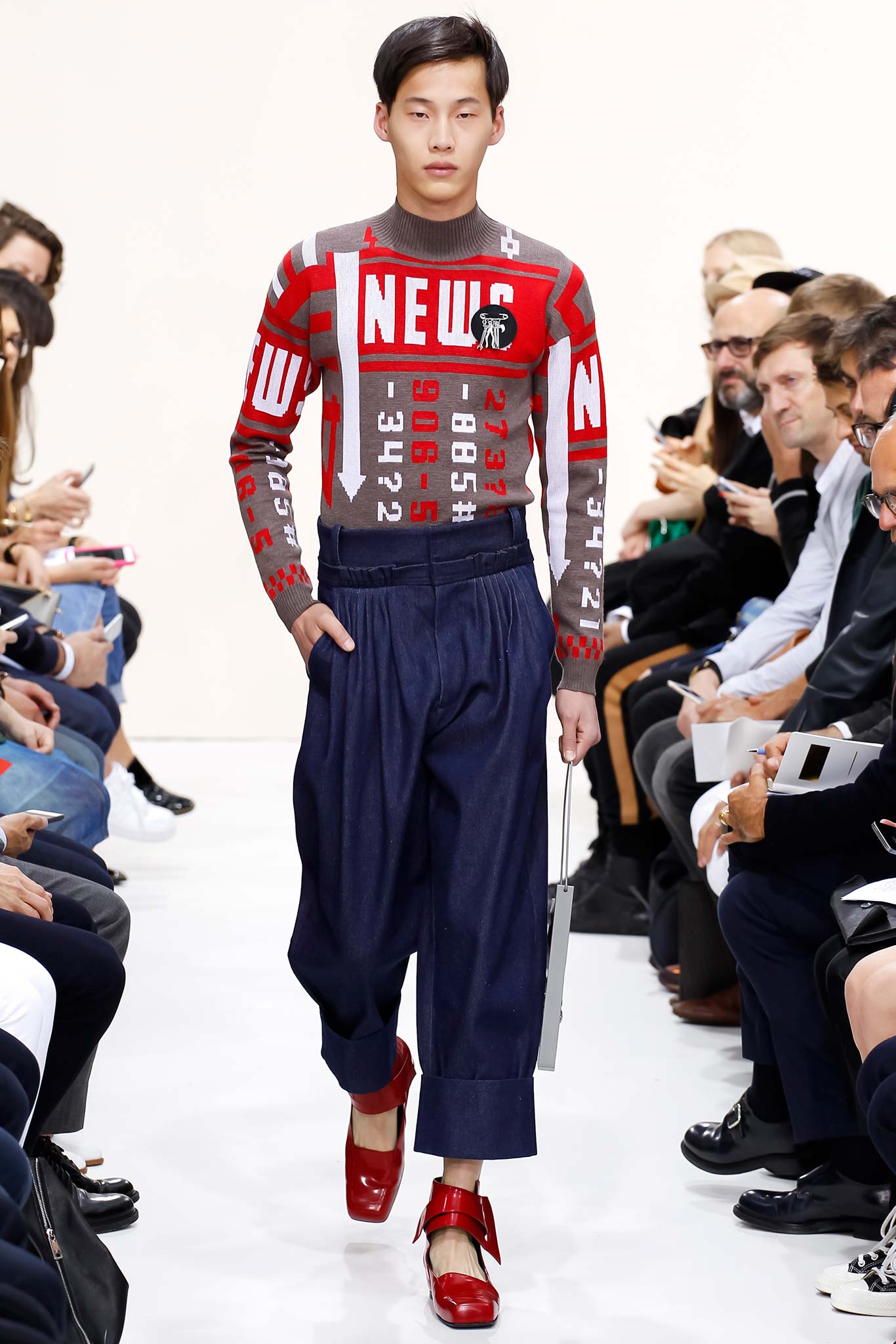 Former themes of ‘70s subculture, Futurism, and mundanity took a red shift this season with a collection that read like an homage to the chosen ‘uns: endangered artisans rescued from a post-apocalyptic world to be based in a space station in the distant future is one way to make sense of it. Heavyweight denim was emblazoned with words like “orbital” and “stellar.” Gentle creatures that would not have seemed out of place in an Egon Schiele painting glided down the clinically white show space, with an abstracted toolbox in hand and a set of favourite tools stitched onto their left chests, close to their heart. A second look at the toolbox revealed everyday trinkets like a whistle, a bottle opener, and even a particular self-pleasuring object. Crossword puzzles appropriated onto structured knits bring to mind unremarkable Sunday afternoons at home, passing time. Themes of banality were matched with a move towards Essentialism, intended to strip Anderson’s world to its bare necessities. Nude was opted wherever possible, leaving bare skin to emerge through fragile tulle, echoing the artisan’s introspective psyches. White flume was added for a touch of artistic flourish while roomy Judo trousers gave a brush of utility.