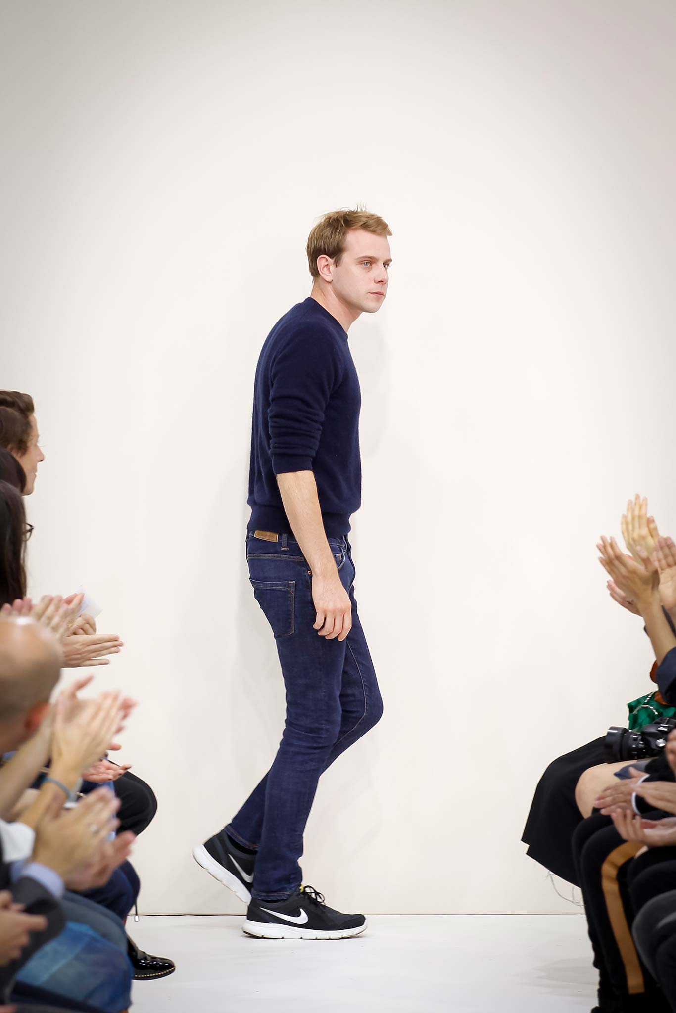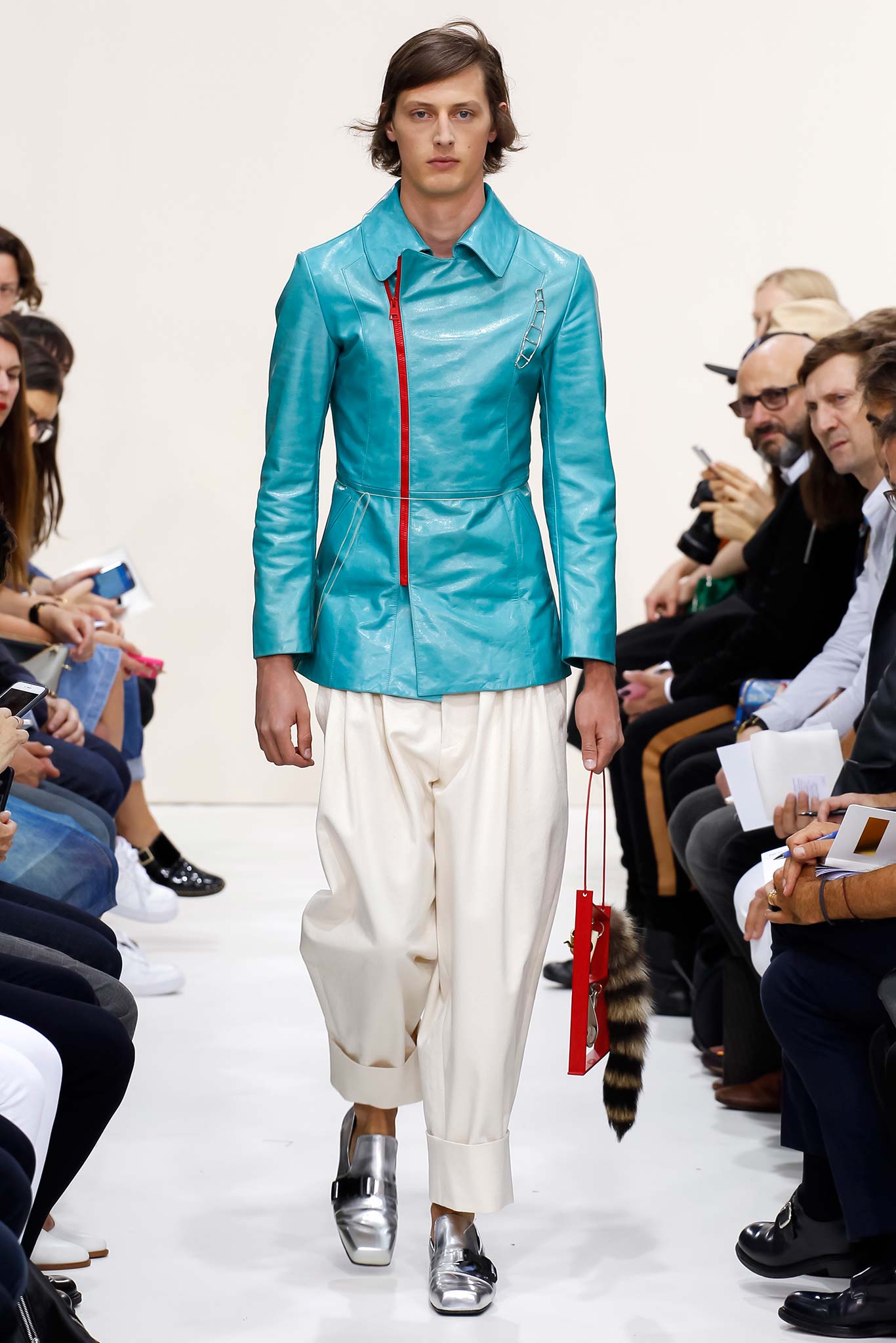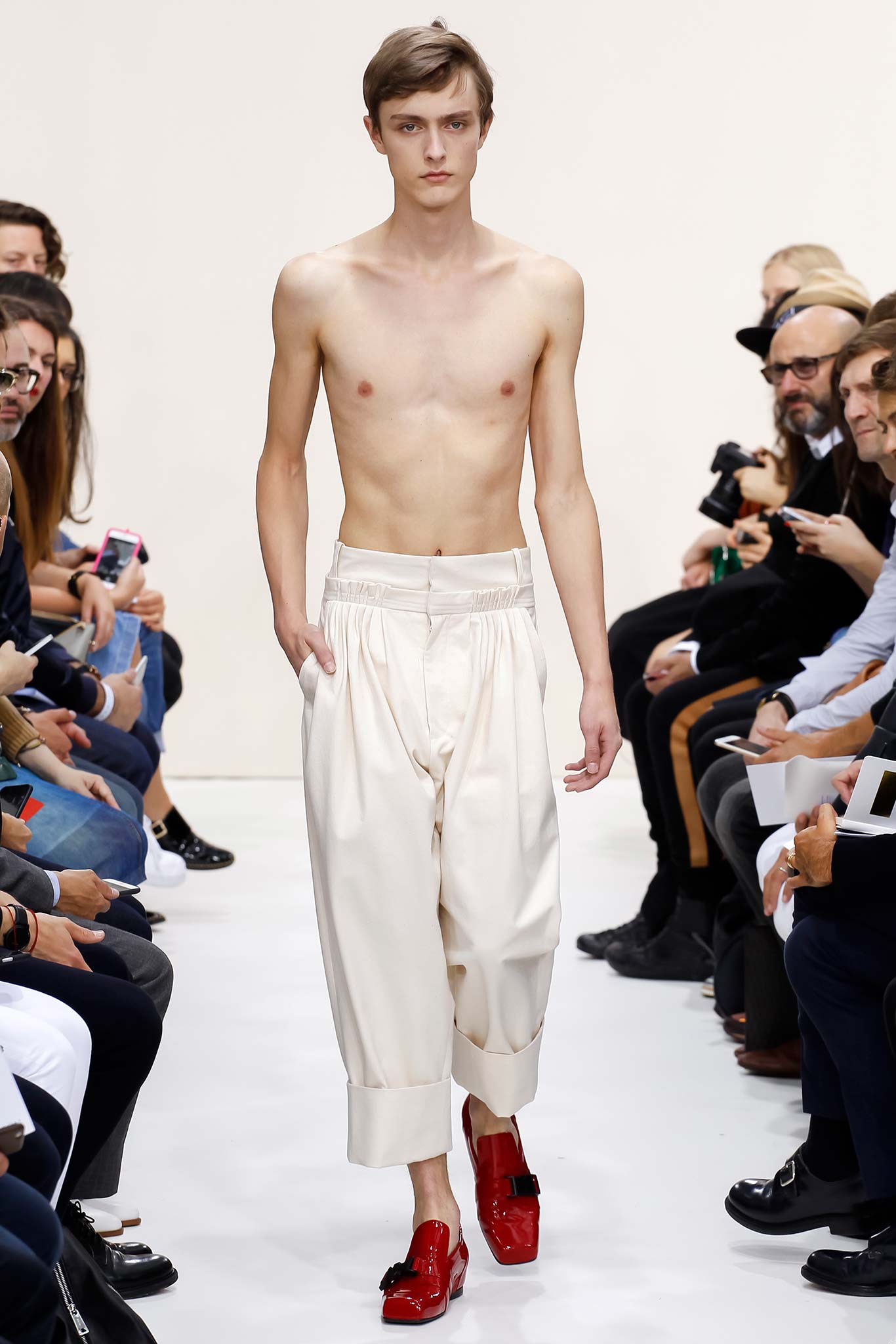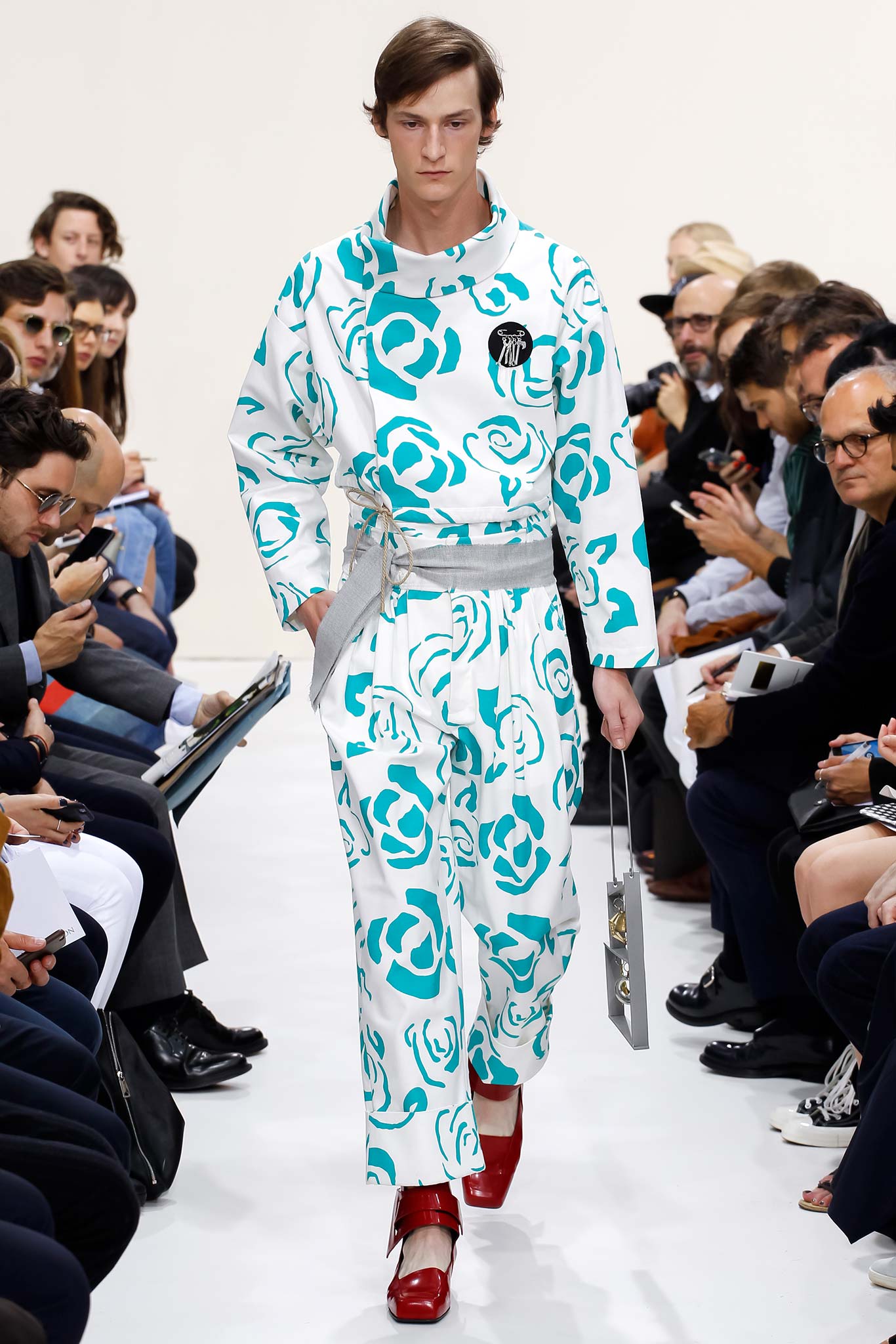 Former themes of ‘70s subculture, Futurism, and mundanity took a red shift this season with a collection that read like an homage to the chosen ‘uns: endangered artisans rescued from a post-apocalyptic world to be based in a space station in the distant future is one way to make sense of it. Heavyweight denim was emblazoned with words like “orbital” and “stellar.” Gentle creatures that would not have seemed out of place in an Egon Schiele painting glided down the clinically white show space, with an abstracted toolbox in hand and a set of favourite tools stitched onto their left chests, close to their heart. A second look at the toolbox revealed everyday trinkets like a whistle, a bottle opener, and even a particular self-pleasuring object. Crossword puzzles appropriated onto structured knits bring to mind unremarkable Sunday afternoons at home, passing time. Themes of banality were matched with a move towards Essentialism, intended to strip Anderson’s world to its bare necessities. Nude was opted wherever possible, leaving bare skin to emerge through fragile tulle, echoing the artisan’s introspective psyches. White flume was added for a touch of artistic flourish while roomy Judo trousers gave a brush of utility.