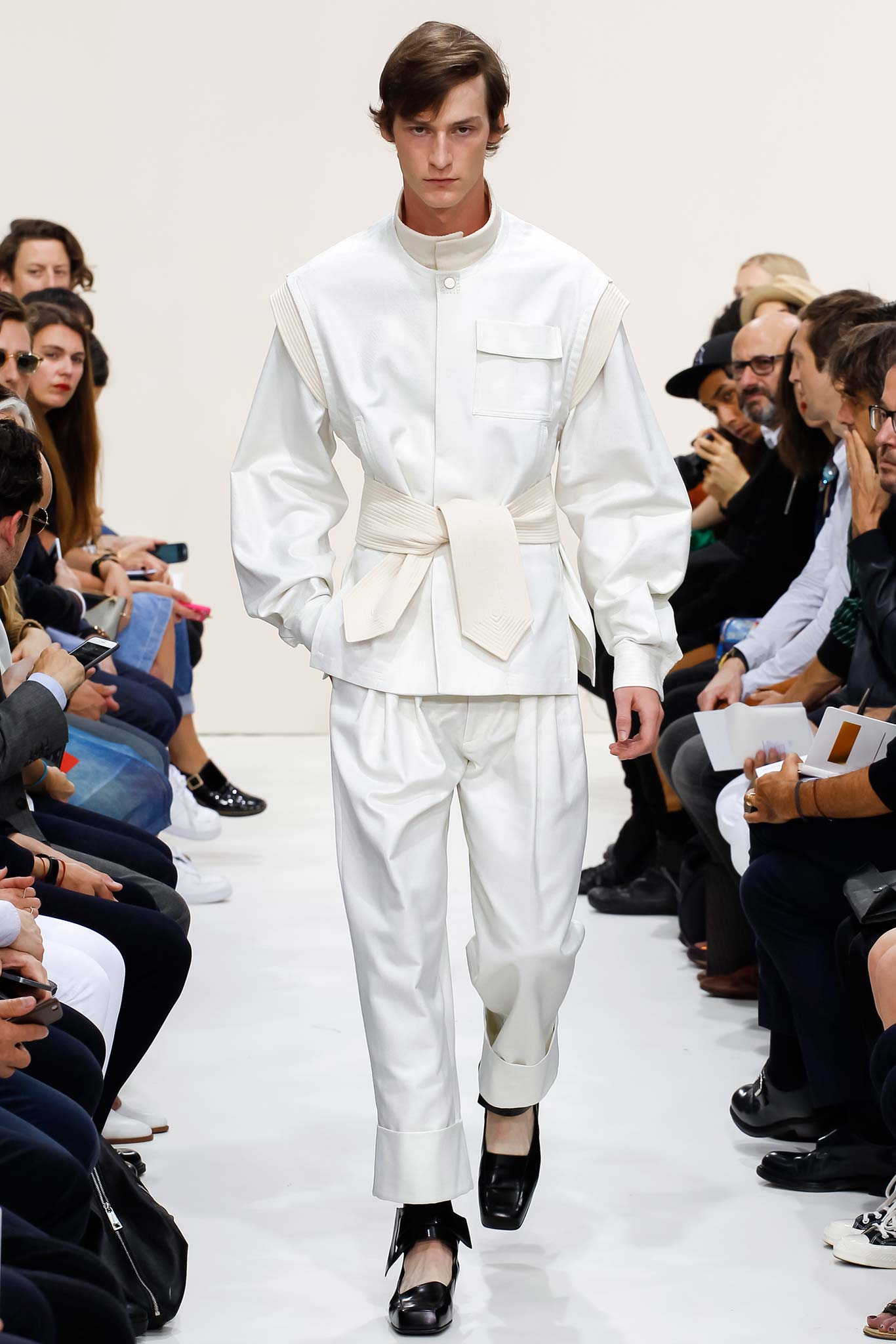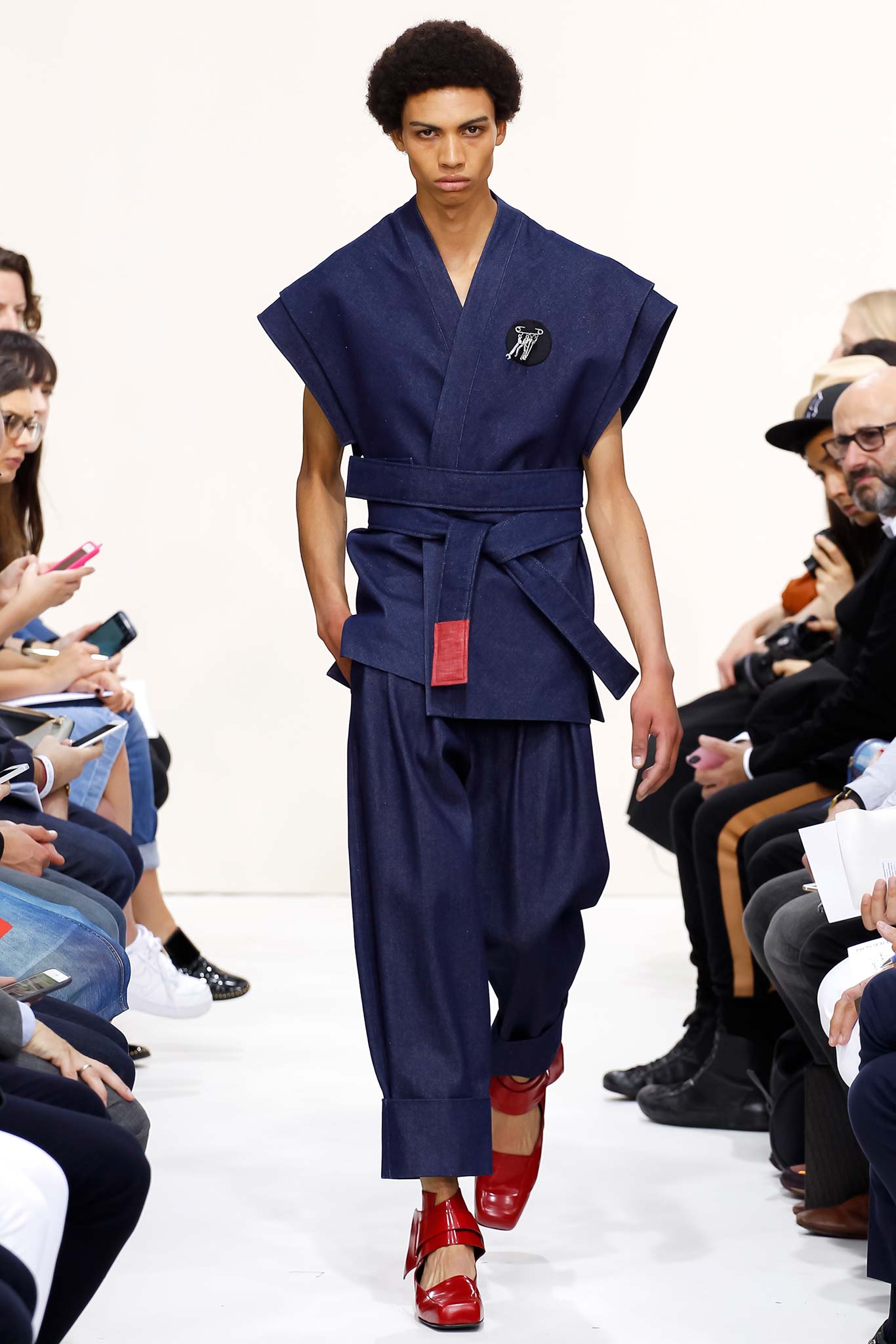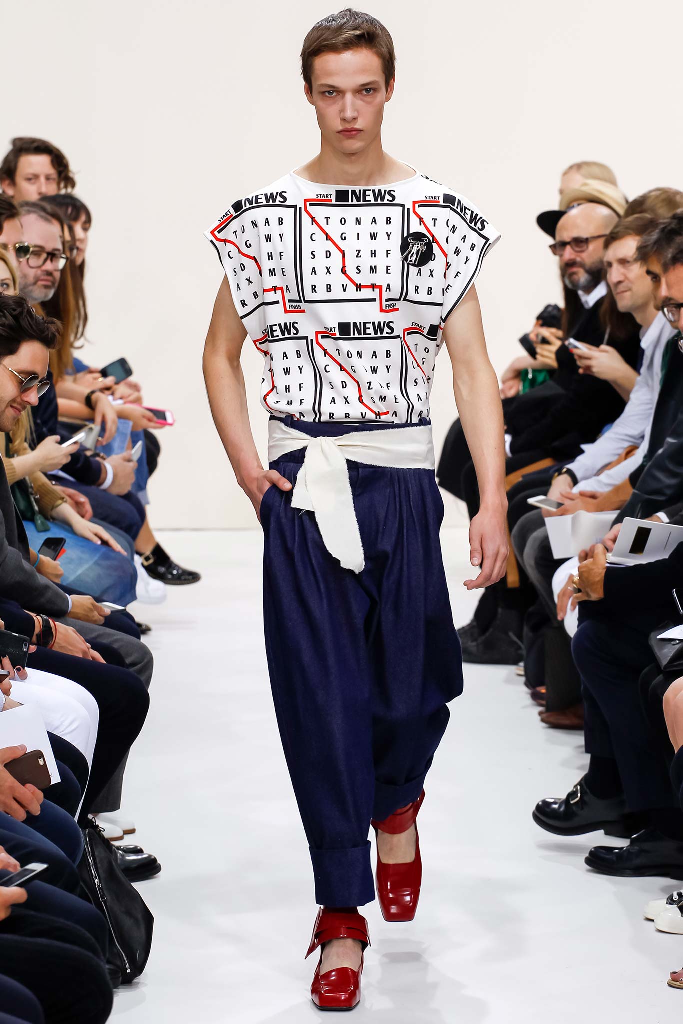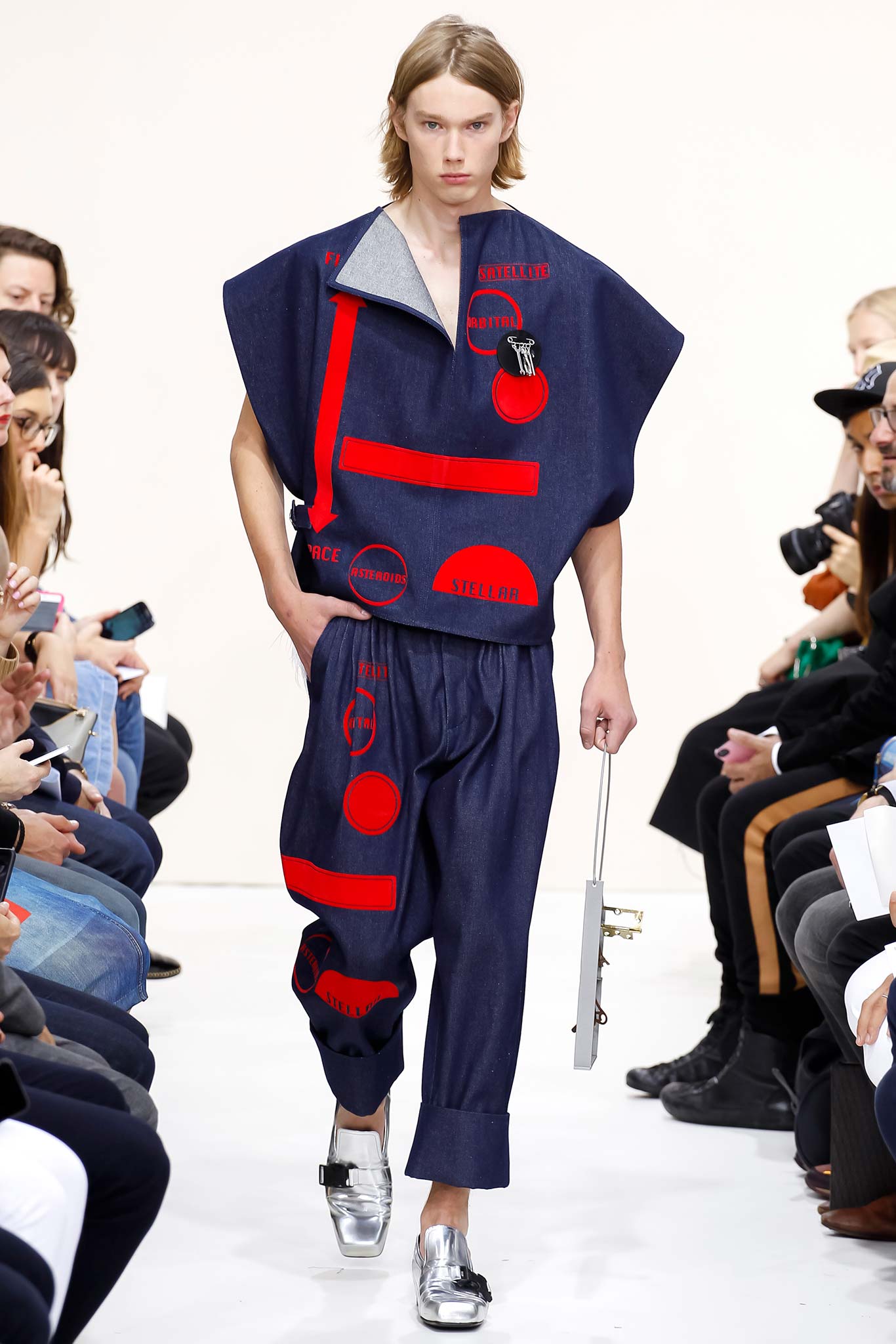 Former themes of ‘70s subculture, Futurism, and mundanity took a red shift this season with a collection that read like an homage to the chosen ‘uns: endangered artisans rescued from a post-apocalyptic world to be based in a space station in the distant future is one way to make sense of it. Heavyweight denim was emblazoned with words like “orbital” and “stellar.” Gentle creatures that would not have seemed out of place in an Egon Schiele painting glided down the clinically white show space, with an abstracted toolbox in hand and a set of favourite tools stitched onto their left chests, close to their heart. A second look at the toolbox revealed everyday trinkets like a whistle, a bottle opener, and even a particular self-pleasuring object. Crossword puzzles appropriated onto structured knits bring to mind unremarkable Sunday afternoons at home, passing time. Themes of banality were matched with a move towards Essentialism, intended to strip Anderson’s world to its bare necessities. Nude was opted wherever possible, leaving bare skin to emerge through fragile tulle, echoing the artisan’s introspective psyches. White flume was added for a touch of artistic flourish while roomy Judo trousers gave a brush of utility.