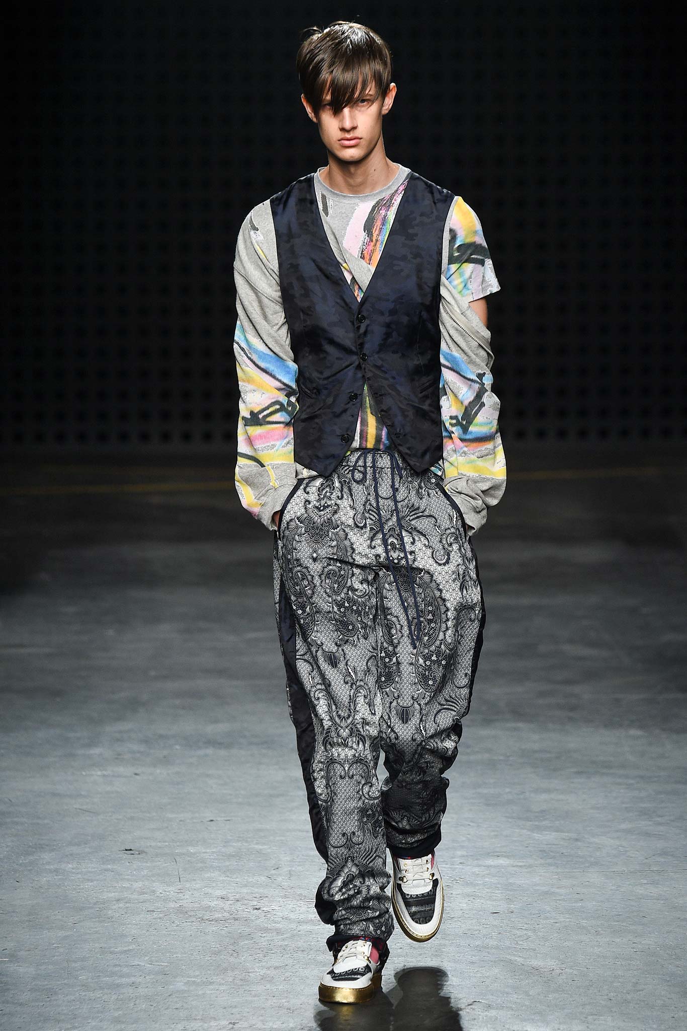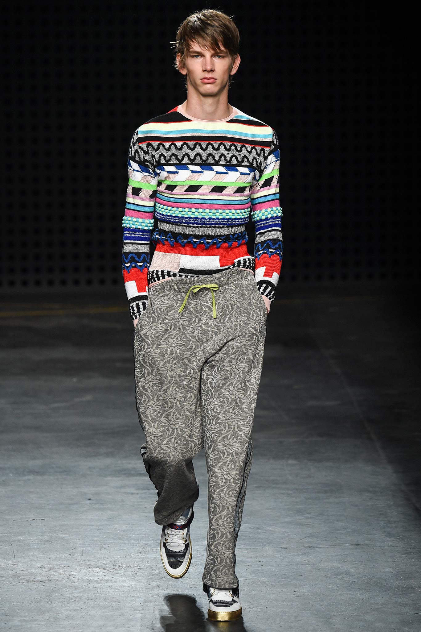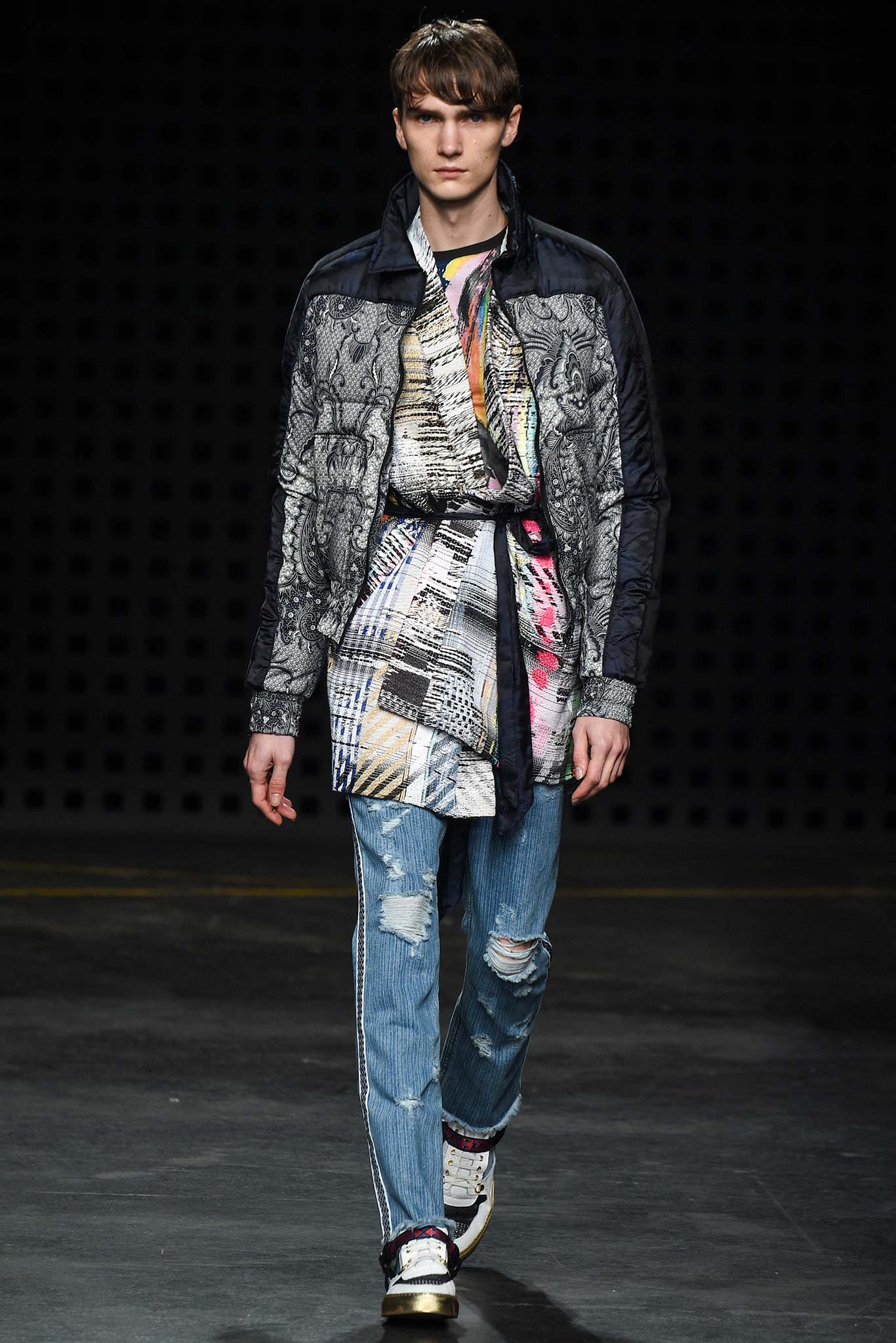 “I was looking at people who are so natural in their clothing, they think they’re blending in, but they’re totally not. There’s a real freedom to it,” said James Long. The flag bearer for London-centric individuality and creative license found interest in the antithesis to what’s in vogue. The look was one of Goldsmith kids, so at one with their sense of self, chugging a pint of beer inconspicuously in an unknown pub in Peckham, but still managing to make it a thing. They are the types that bring the party with them, turning their lo-fi regular hangout into the next “it” spot overnight. Tossing together ruffles, patchwork denim, riotous hand-painted swashes, tie dye, and patterned knits into a lethal cocktail of textures; the deliciously spontaneous styling was reminiscent of the morning after a legendary night out. Models still had glitter smeared on their brows as they walked down with unabashed ease.