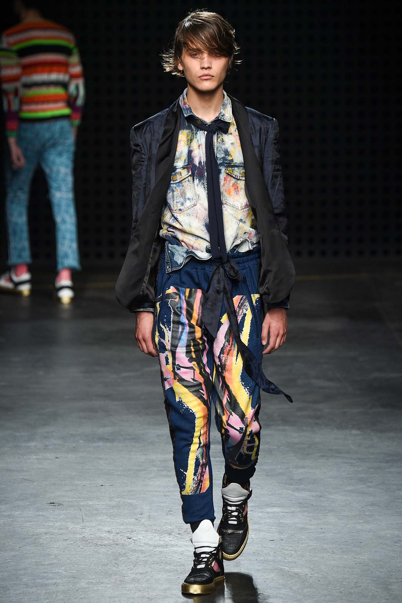 “I was looking at people who are so natural in their clothing, they think they’re blending in, but they’re totally not. There’s a real freedom to it,” said James Long. The flag bearer for London-centric individuality and creative license found interest in the antithesis to what’s in vogue. The look was one of Goldsmith kids, so at one with their sense of self, chugging a pint of beer inconspicuously in an unknown pub in Peckham, but still managing to make it a thing. They are the types that bring the party with them, turning their lo-fi regular hangout into the next “it” spot overnight. Tossing together ruffles, patchwork denim, riotous hand-painted swashes, tie dye, and patterned knits into a lethal cocktail of textures; the deliciously spontaneous styling was reminiscent of the morning after a legendary night out. Models still had glitter smeared on their brows as they walked down with unabashed ease.