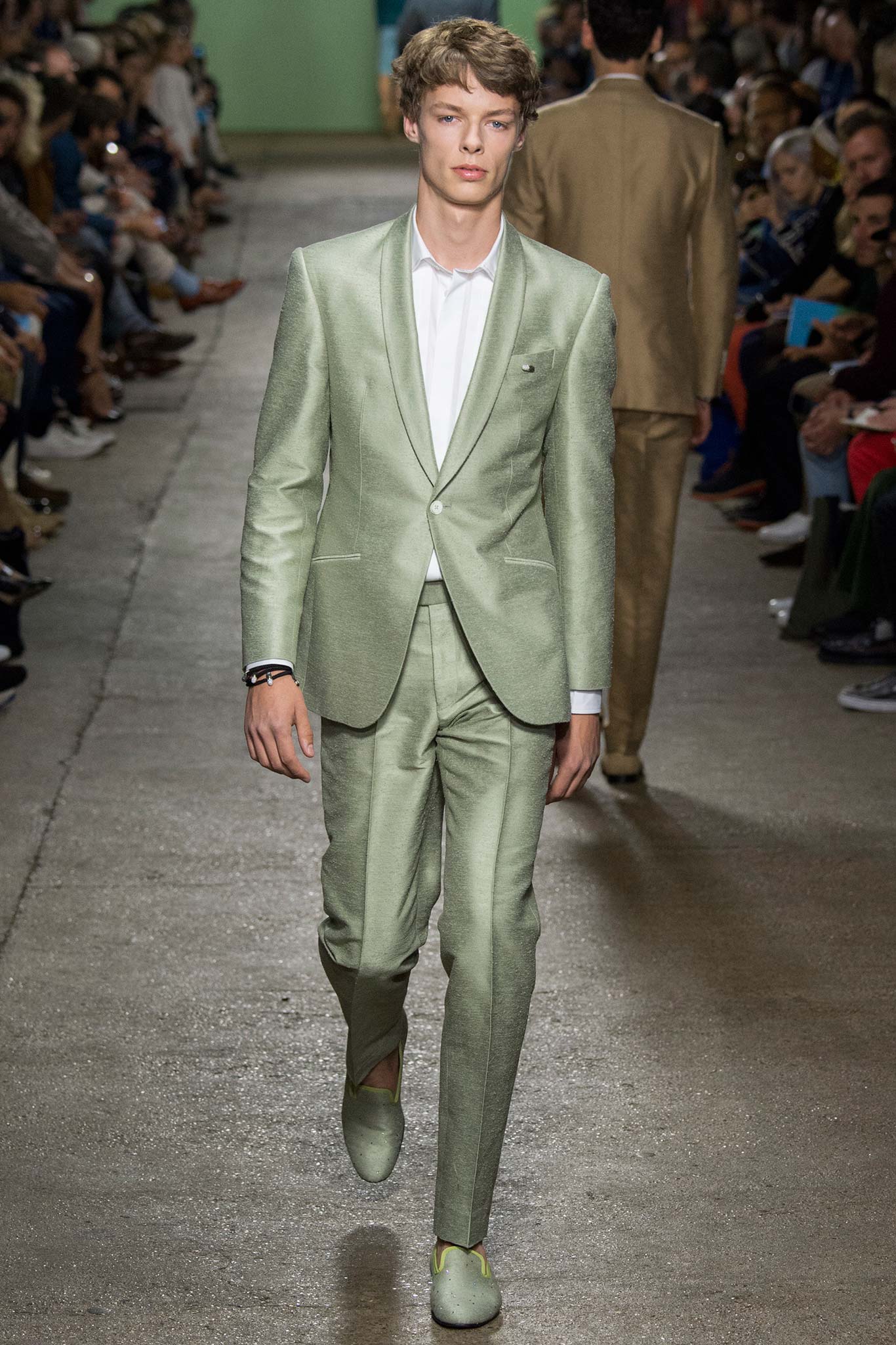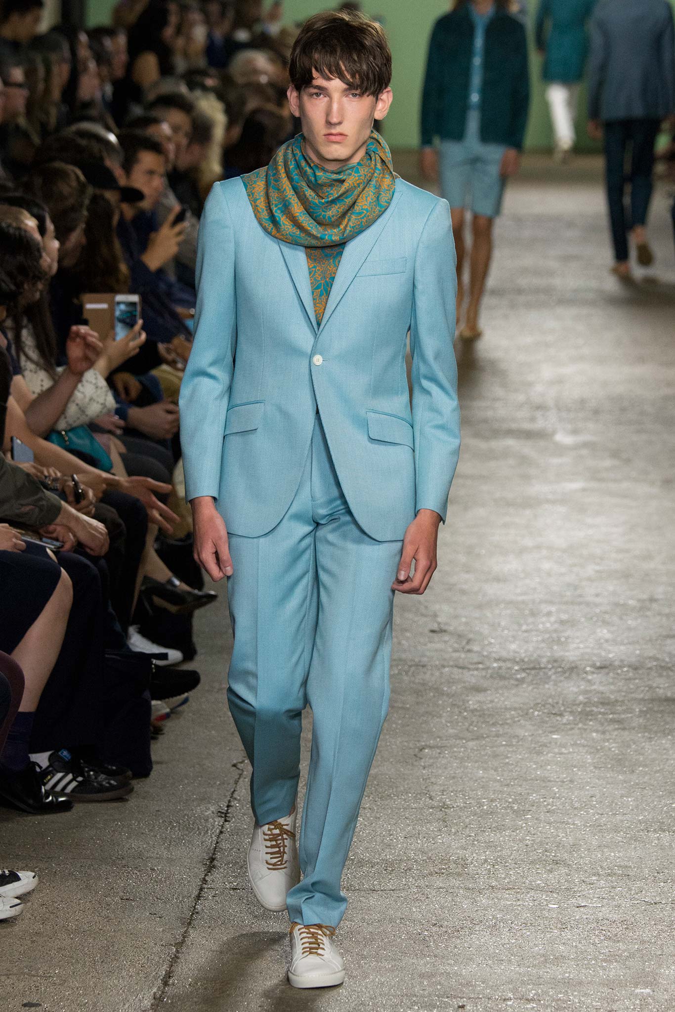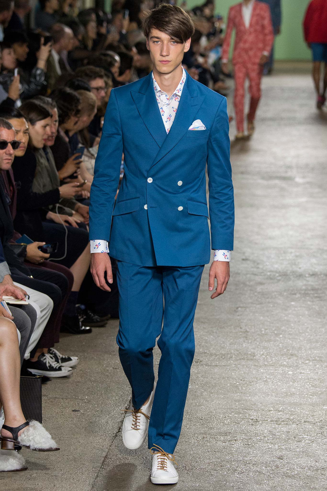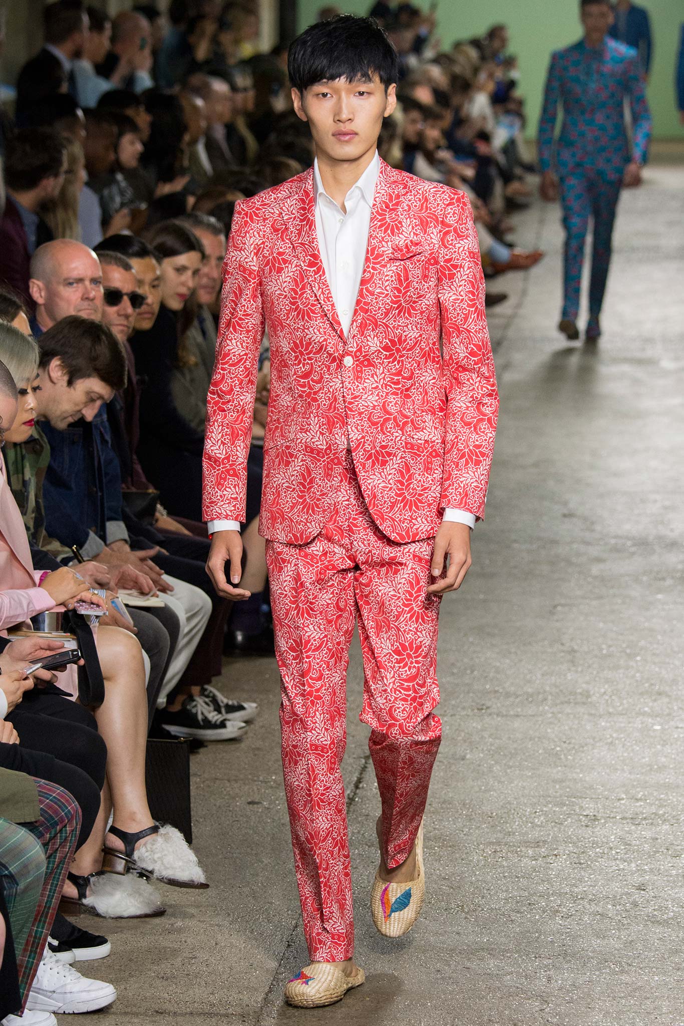 The bulk of the schedule’s menswear shows are based around the Old Sorting Office in Holborn, a strange stretch of mid-town real estate that has little connection to the fashion industry; that all takes place much further east, in the lines of north-south streets that follow the city’s ever-changing frontiers. But walking from Holborn to the Richard James show this morning was a walk back through menswear history – from Covent Garden in the Nineties to Sixties Soho, to pre-war Savile Row and on to Jermyn Street and the gentleman’s clubs of Pall Mall. There, amidst statues of portly Victorian generals and smugly triumphant explorers, Richard James unveiled their latest collection in a long underground space overlooking St. James’ Park.