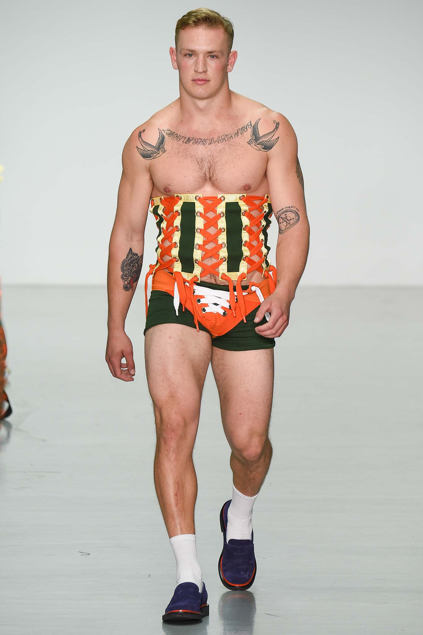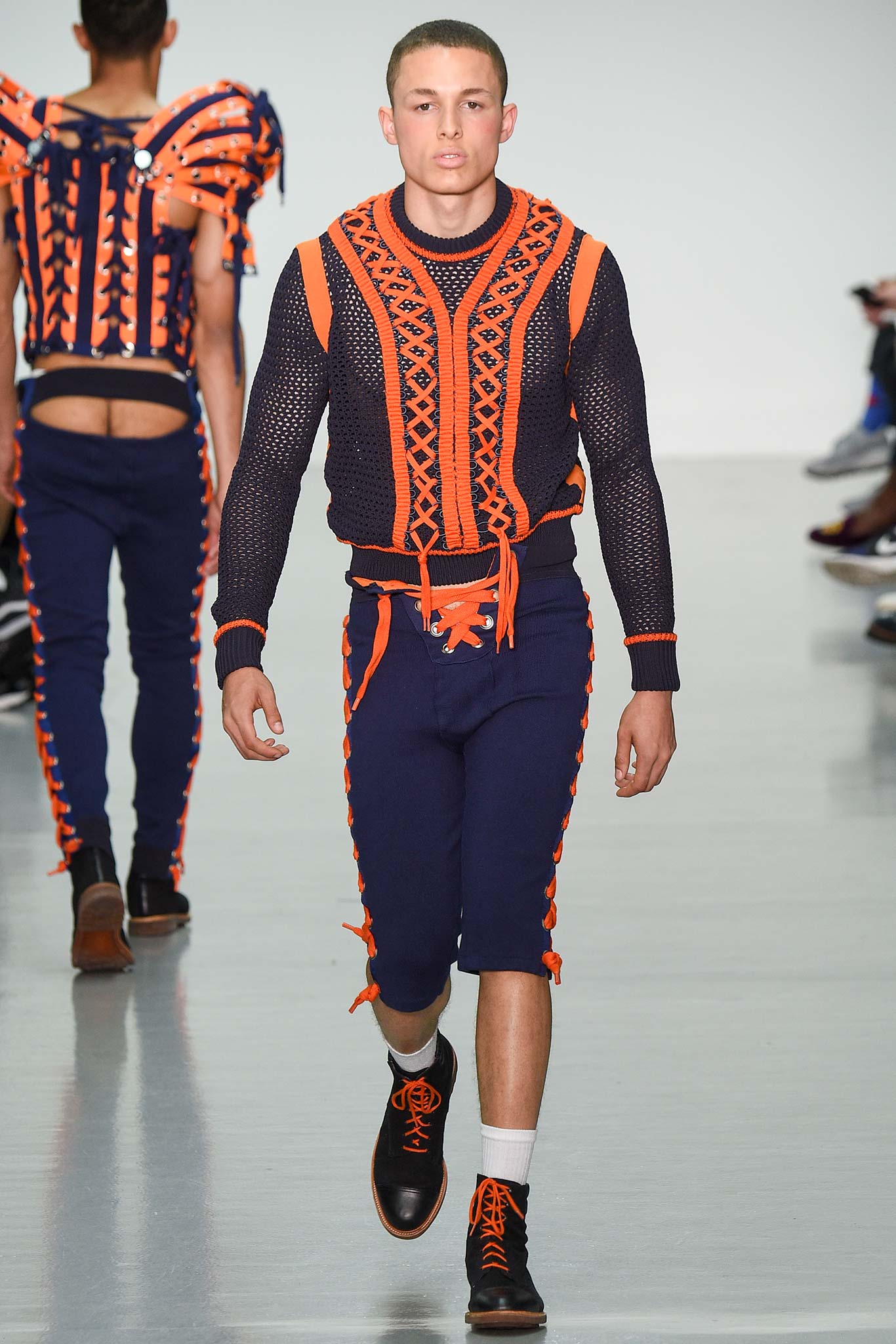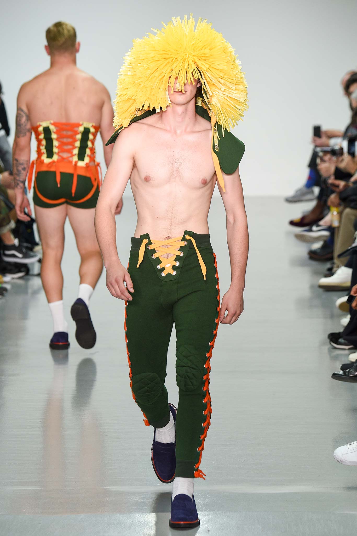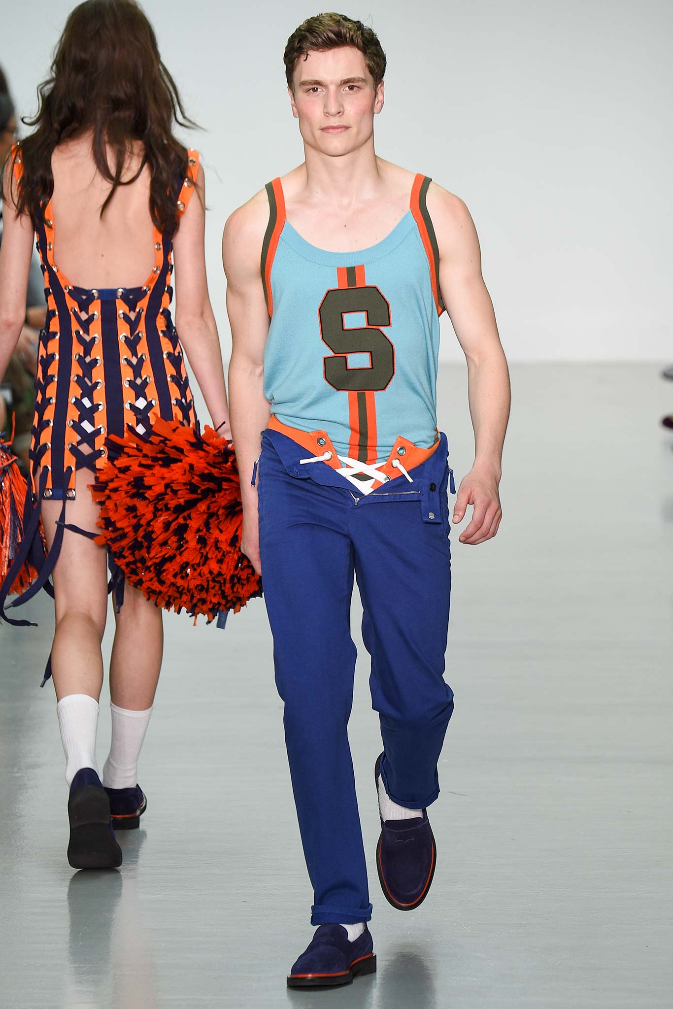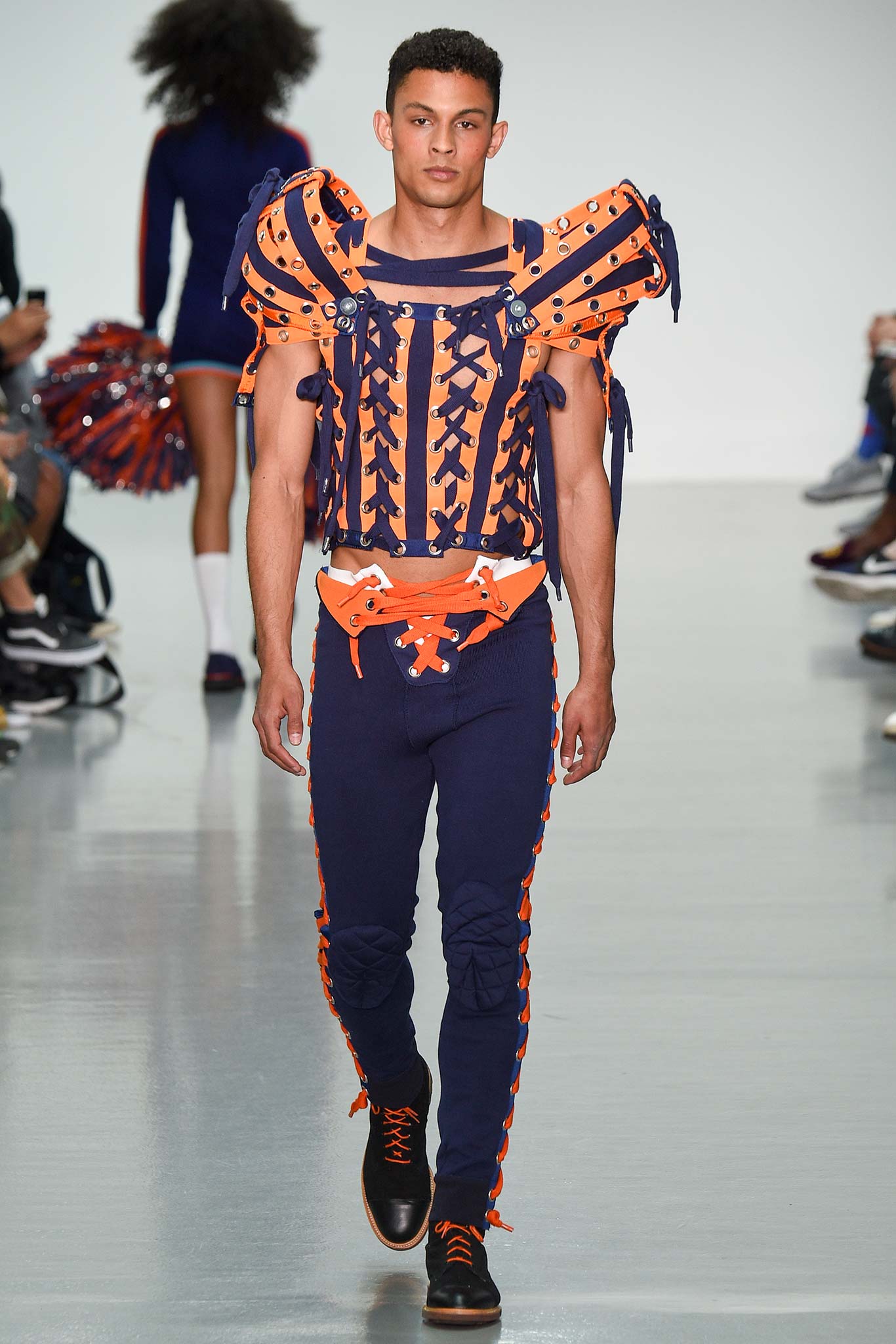 “Jocks are bastards” was more or less the substance of the J.D. Salinger quote from The Catcher in the Rye that prefaced the Sibling threesome’s spring manifesto. But the show that followed was more pitcher than catcher, more wry than rye. If it was an ode to college football—complete with a handful of cheerleaders poured or laced into second-skin sportswear—you have to imagine a college where Russ Meyer was dean. And quite why three iconoclastic Brits with a past eye to punkish fun-poking should latch onto this particular subject was only partially clarified by the manifesto’s blithe reference to “the desecration of male subcultures.”