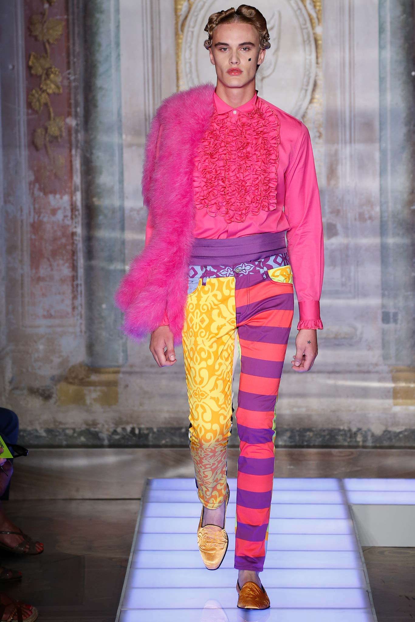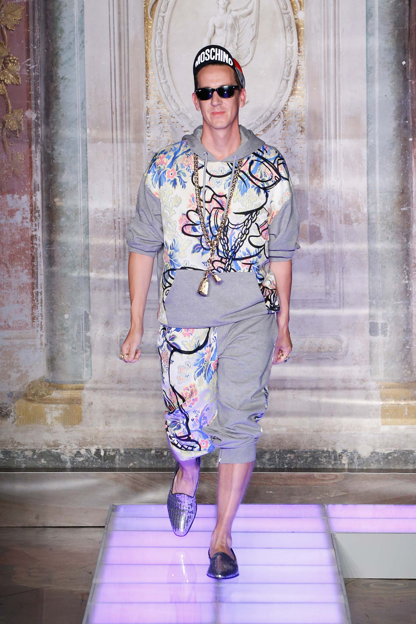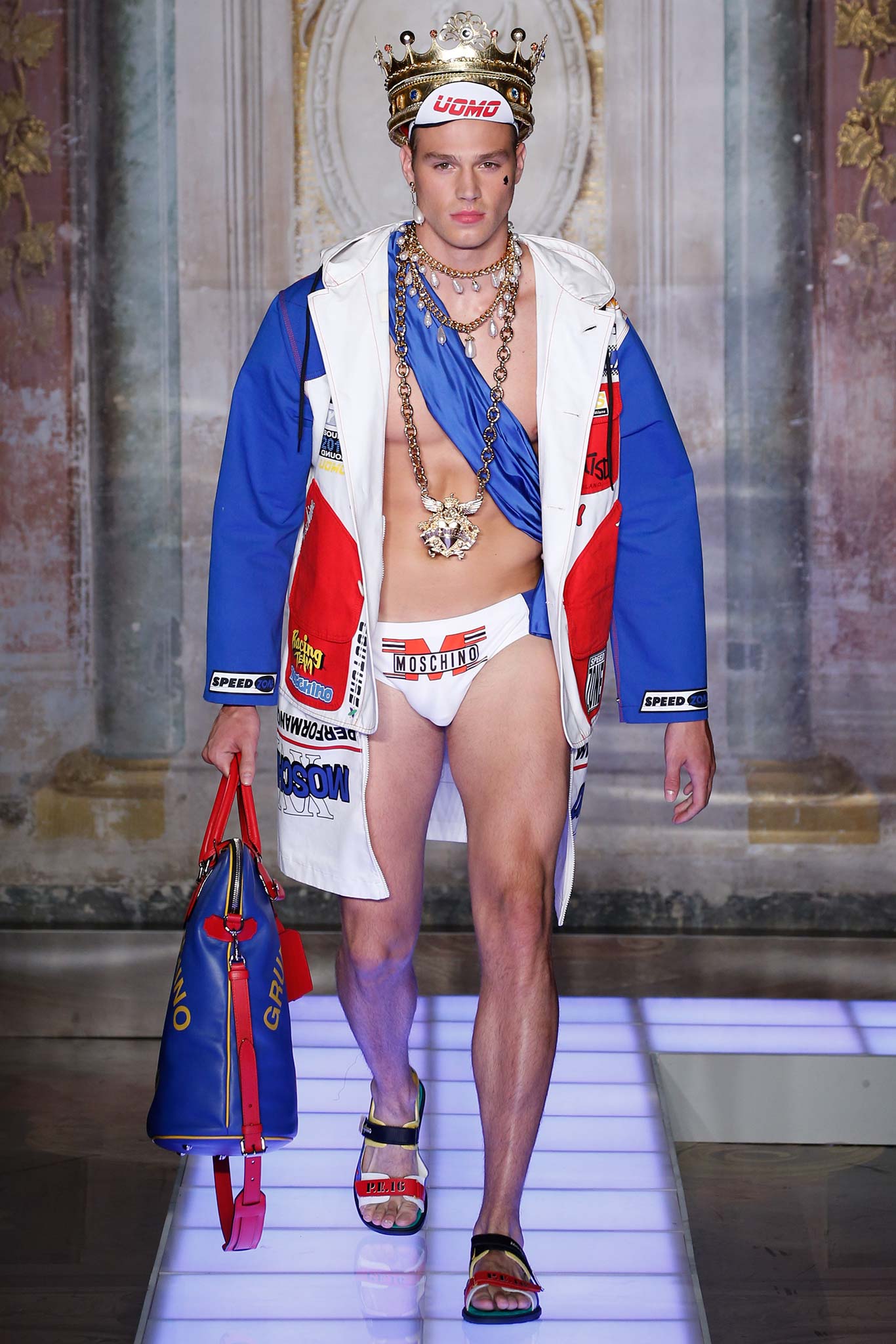 Designer Jeremy Scott made his MOSCHINO a royalty kingdom fashion show at Pitti Uomo embodied Casanovas style on its Menswear Spring/Summer 2016 making an unique event. Embracing logos, graphics, art pop, cartoons and gentleman’s old school patterns, Scott created a lineup not for the faint of heart. From sports jackets to sports career outfits, revolutionary a sport casanova whole look , Moschino’s spring/summer 2016 outing was an exercise in free expression.