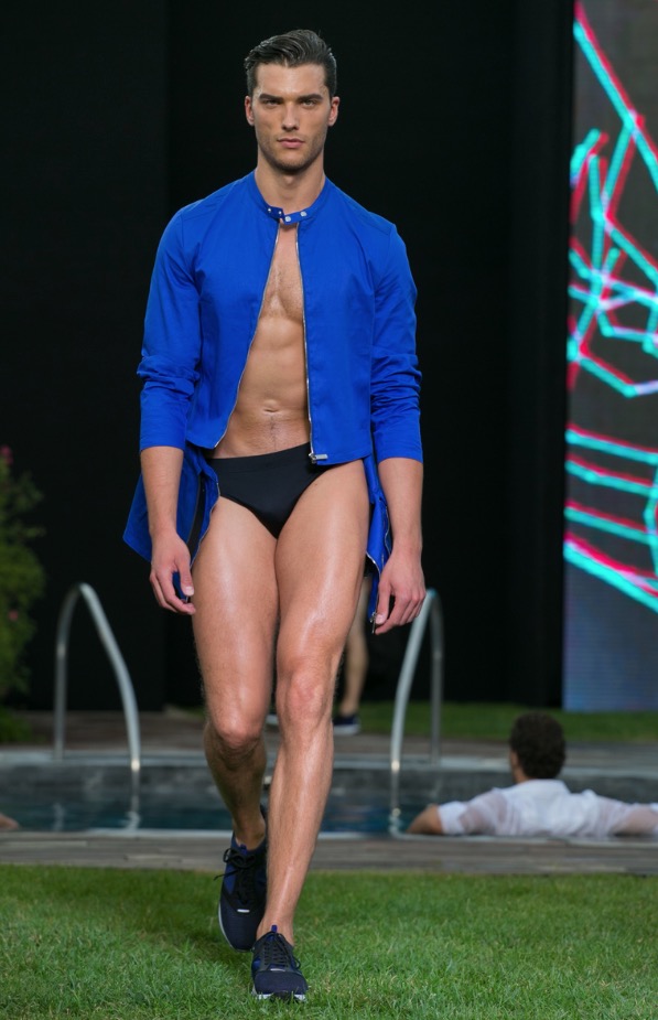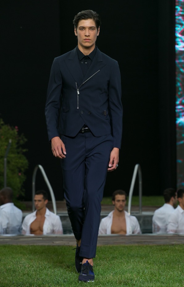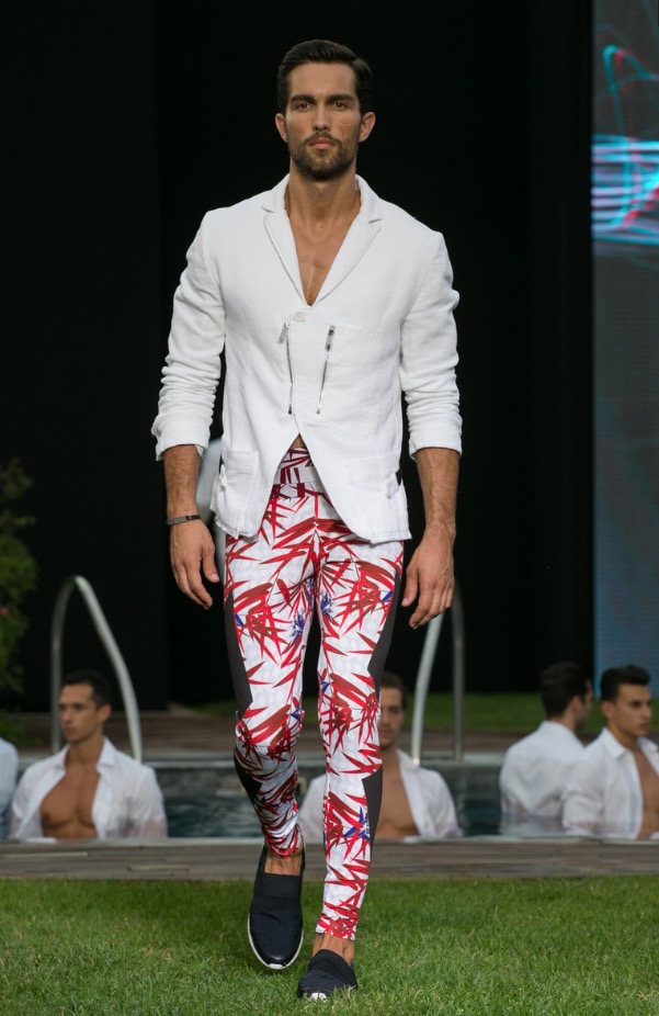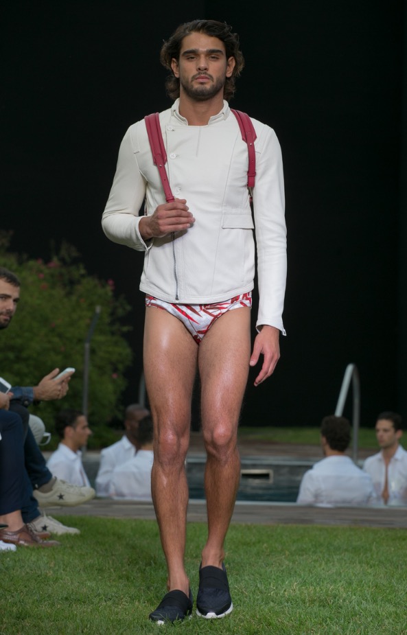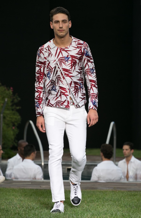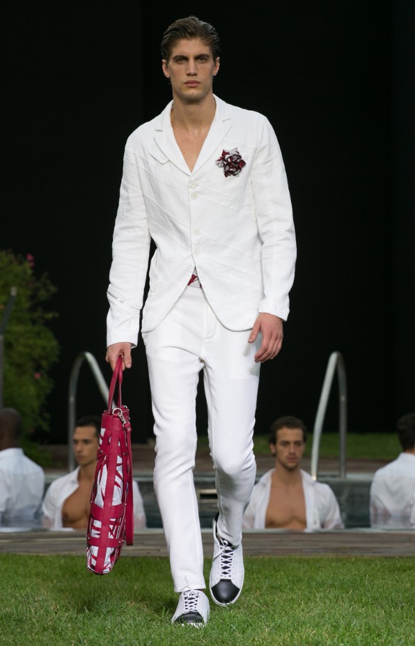 Bamboo prints were plastered onto foulards, pocket squares, and jacquard tuxedo jackets that were paired with the tight men’s swimming trunks that Bikkembergs’ muscular models show off so well.