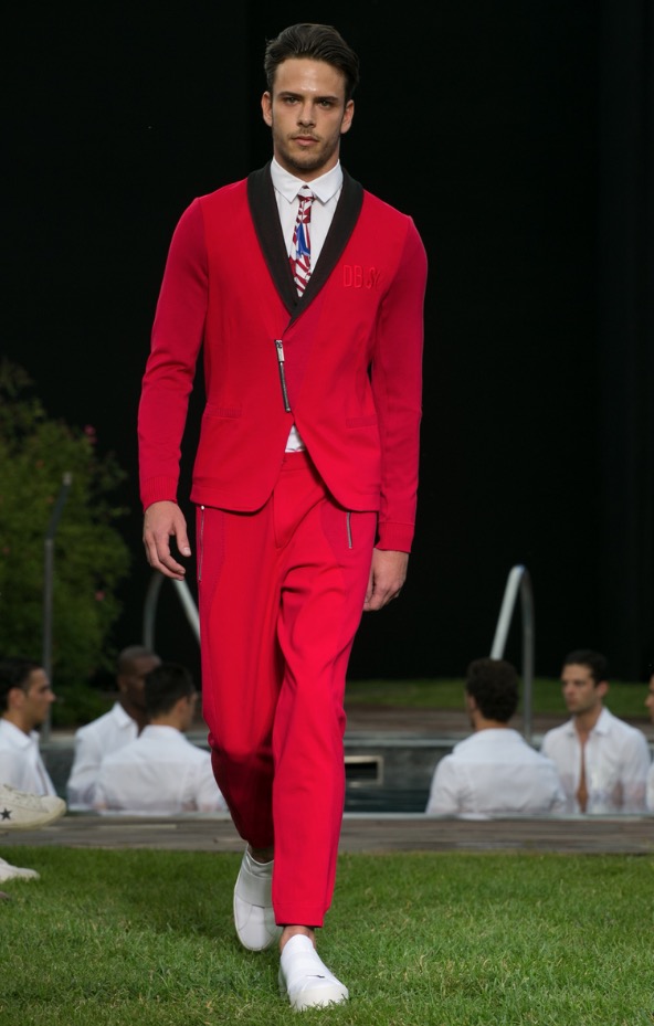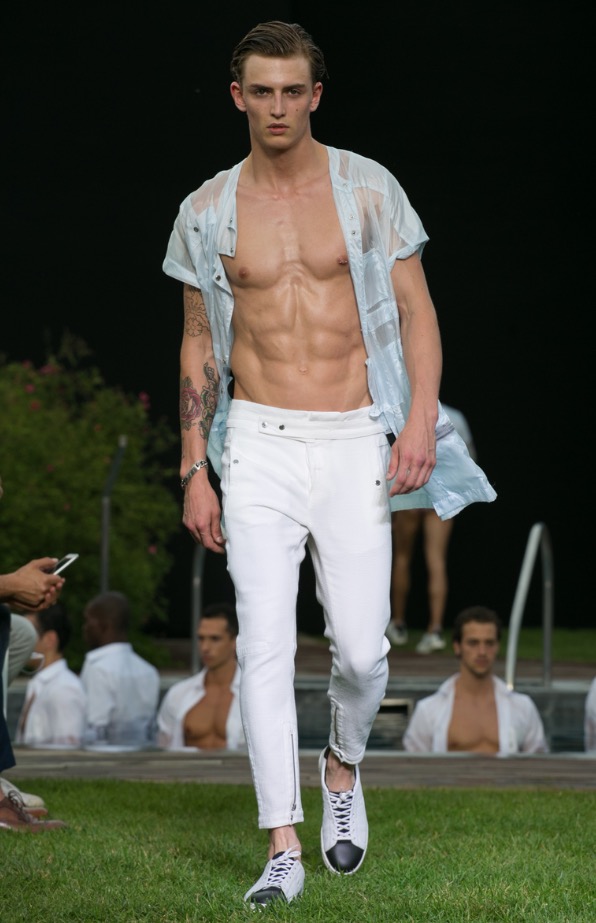 Torn between his pure and fighting self, the Bikkembegrs man saw his sins and his tormented soul washed anew, when at the end of the show, bare-chested models in red trunks emerged from the hot tub – the sort of theatrical relief that makes you just want to dive right in.
