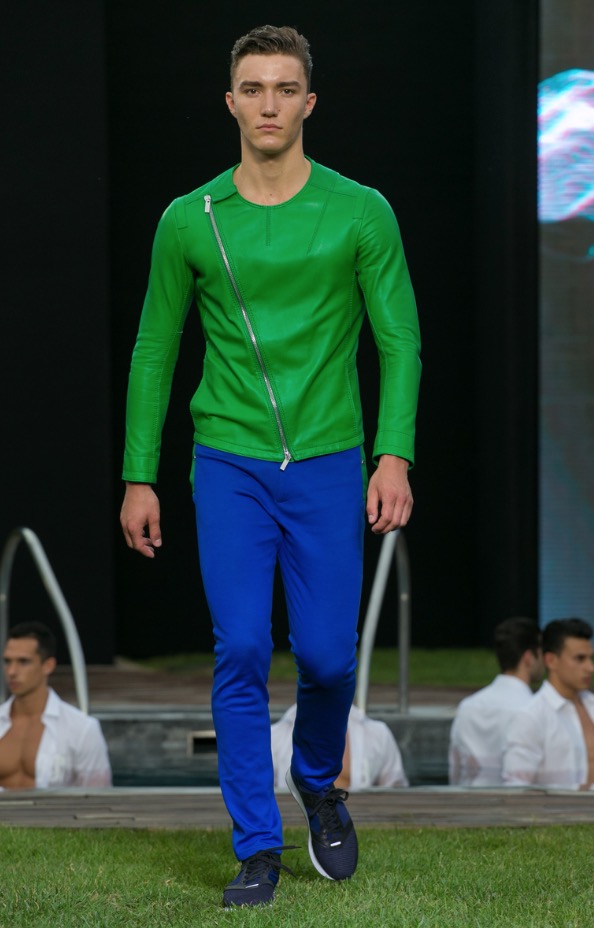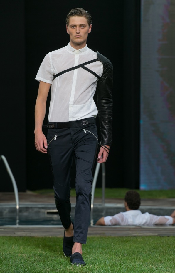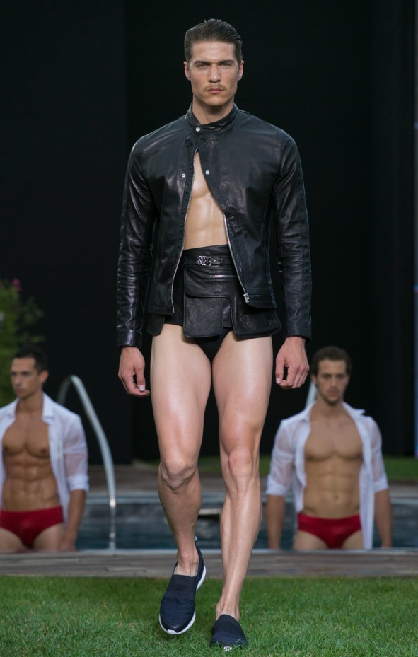 Fit for a man who has no qualms about showing off his six pack all day long, the lineup underscored the physical traits of strength and physicality through black leather arm sleeves that could be considered warrior attire or fetish clothing.