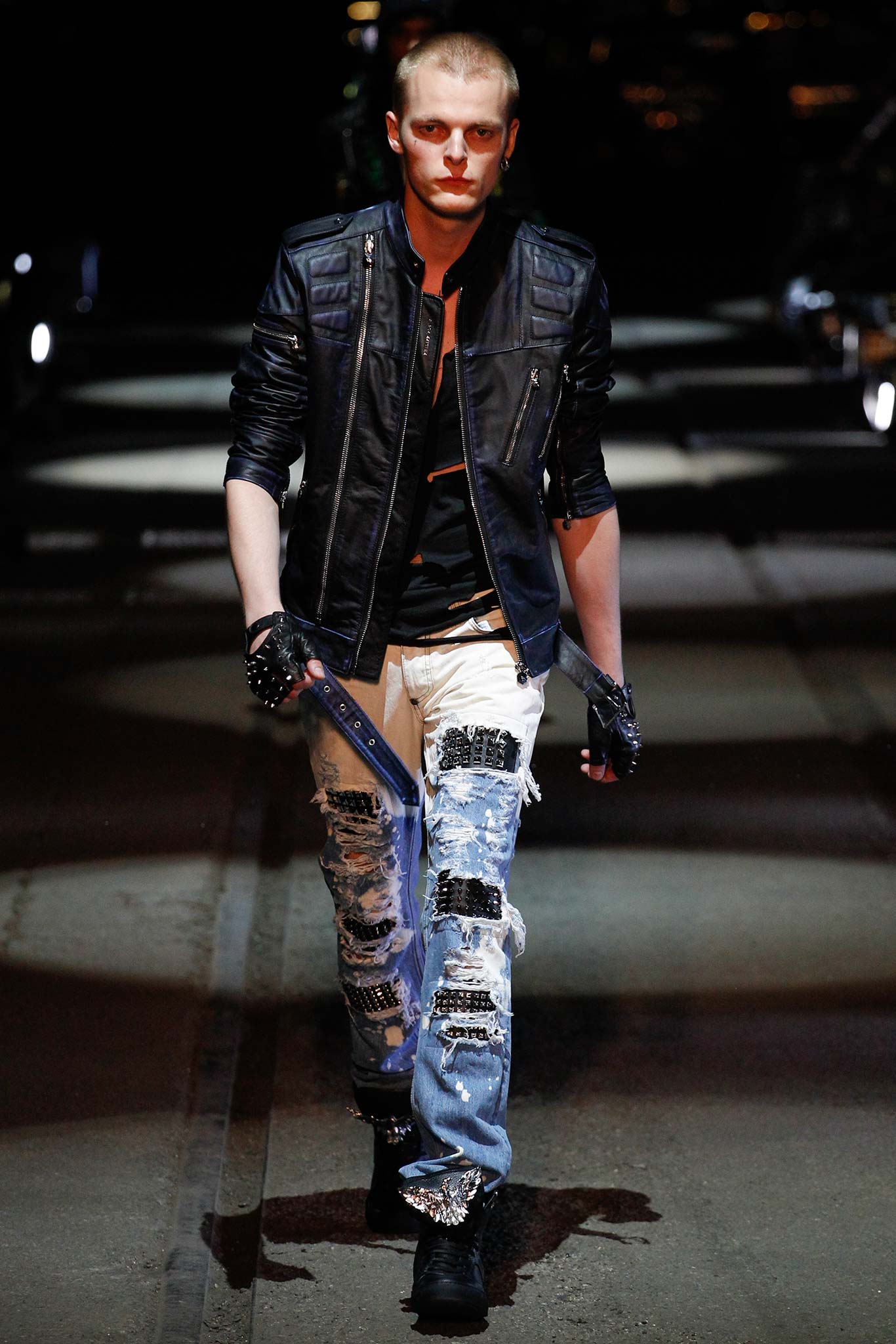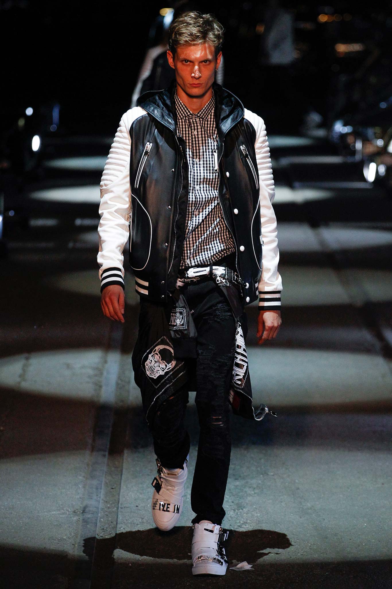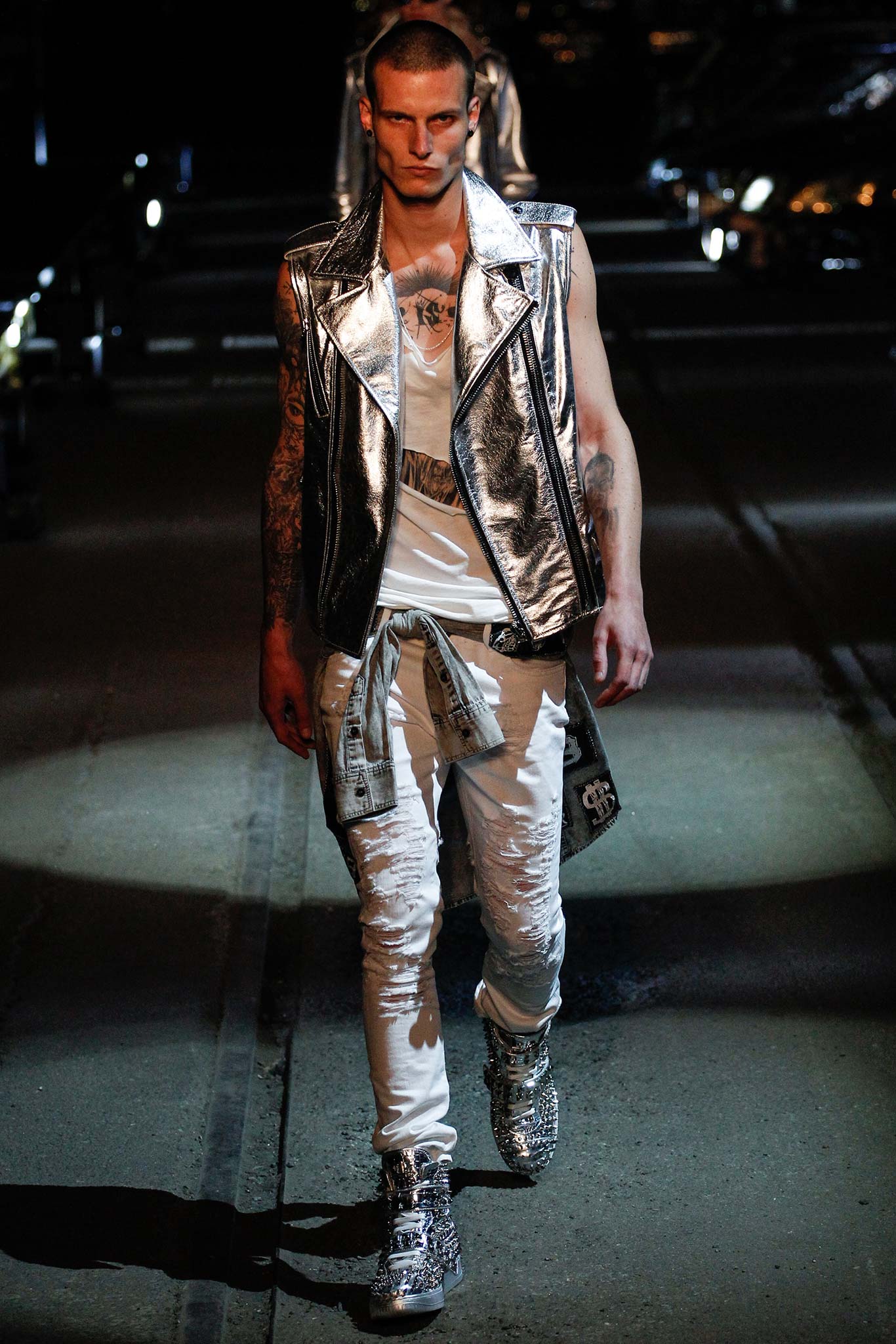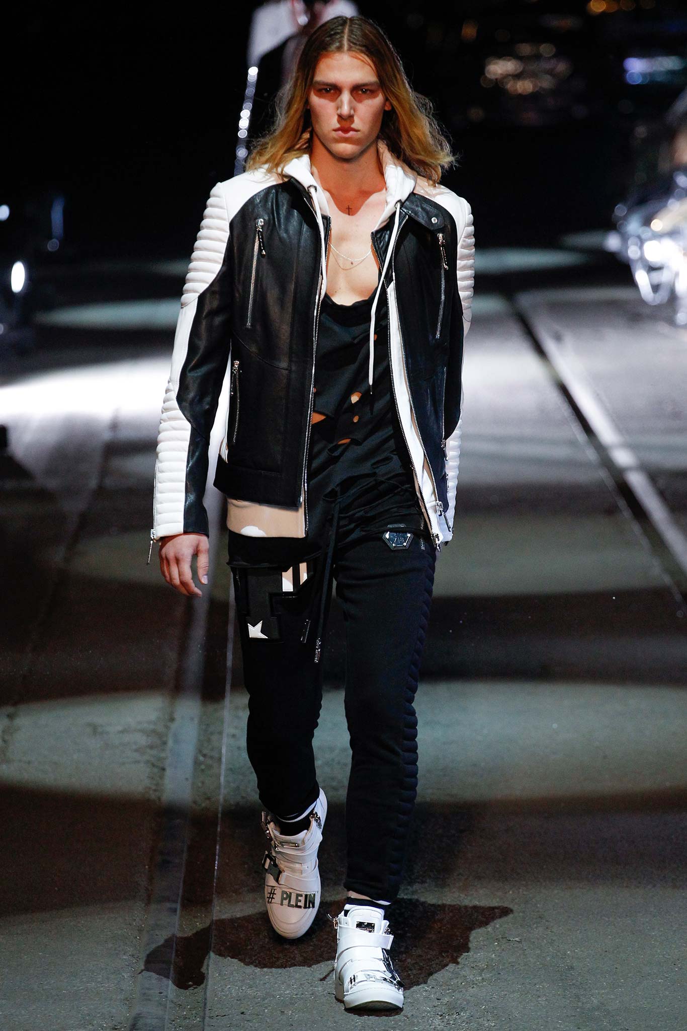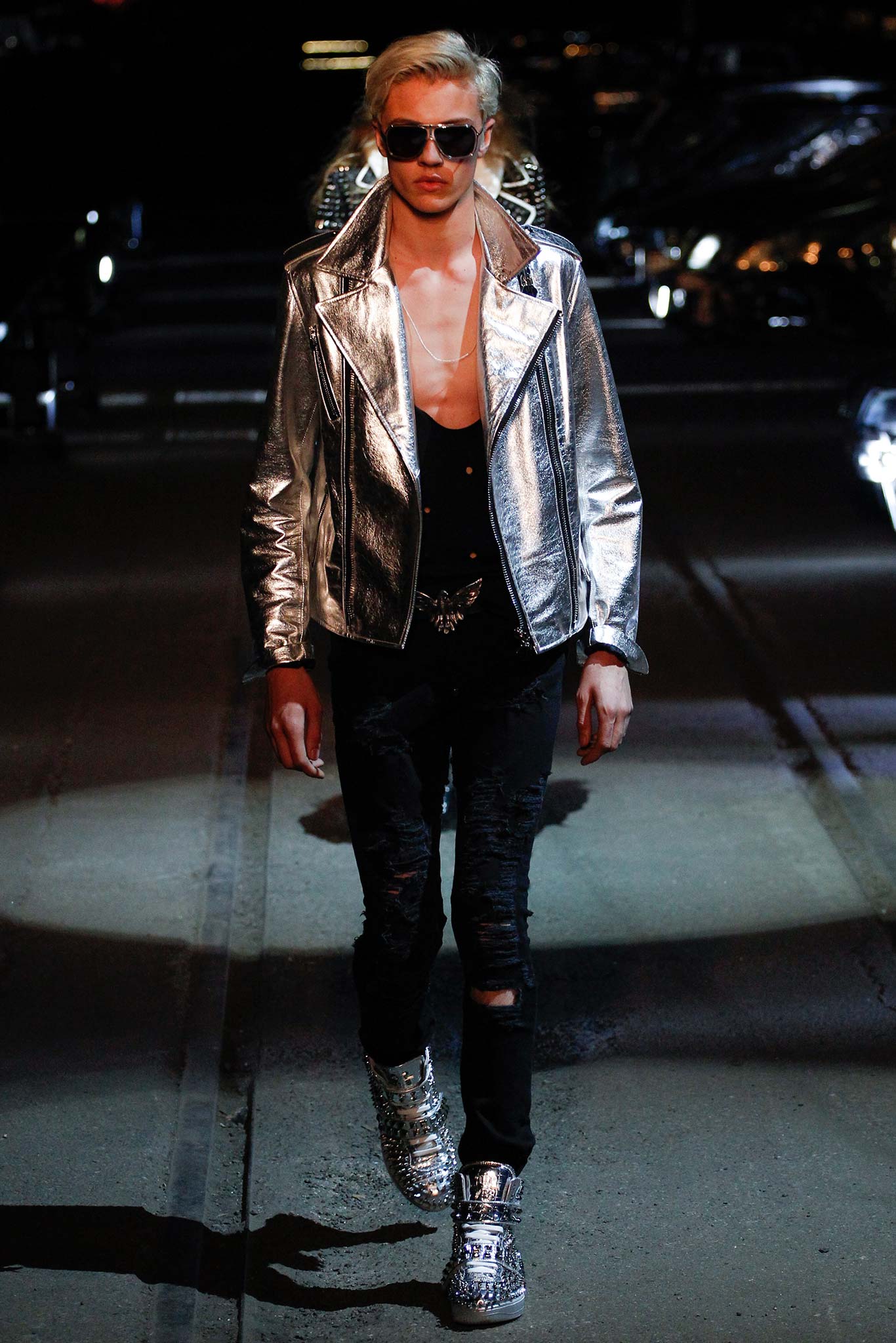 It was Mad Max meets The Fast and the Furious. First a team of silver mohawked motorcyclists raced around the rail-yard wrecks, followed by two gold-sprayed BMWs that burnt rubber and skidded on two wheels down one side of the catwalk before one of them was set on fire and pursued by a New York police car. Got that? Then Tyga got out of one and started rapping as Plein’s “hip-rock” collection was finally revealed. This was an in-your-face amalgam of hyper-stylized punk gear and hyper-stylized sportswear. So there were studded hoodies under studded bikers lined with Plein-customized band-patch logos. A black biker was worn over a shredded scoop-neck tee and black track pants painted white with hashtags, “RICH A$$” and the fundamental unmentionable. A stud-lapelled jacket was worn over a T-shirt painted with a Spinal Tap-worthy album cover image of an epically bosomed, big-haired woman with massive shoulder pads and a facemask. The sneakers were strapped and studded high-tops in silver, black, and white. Biker pants and shorts rubbed along with varsity jackets and skinny eveningwear, all heartily Plein-ed.