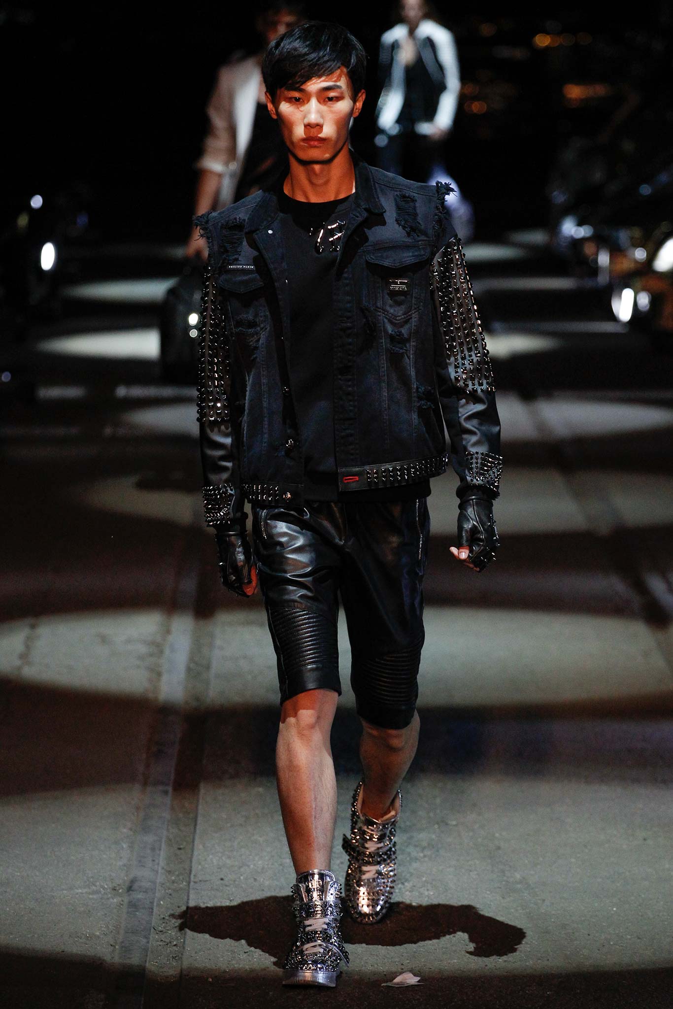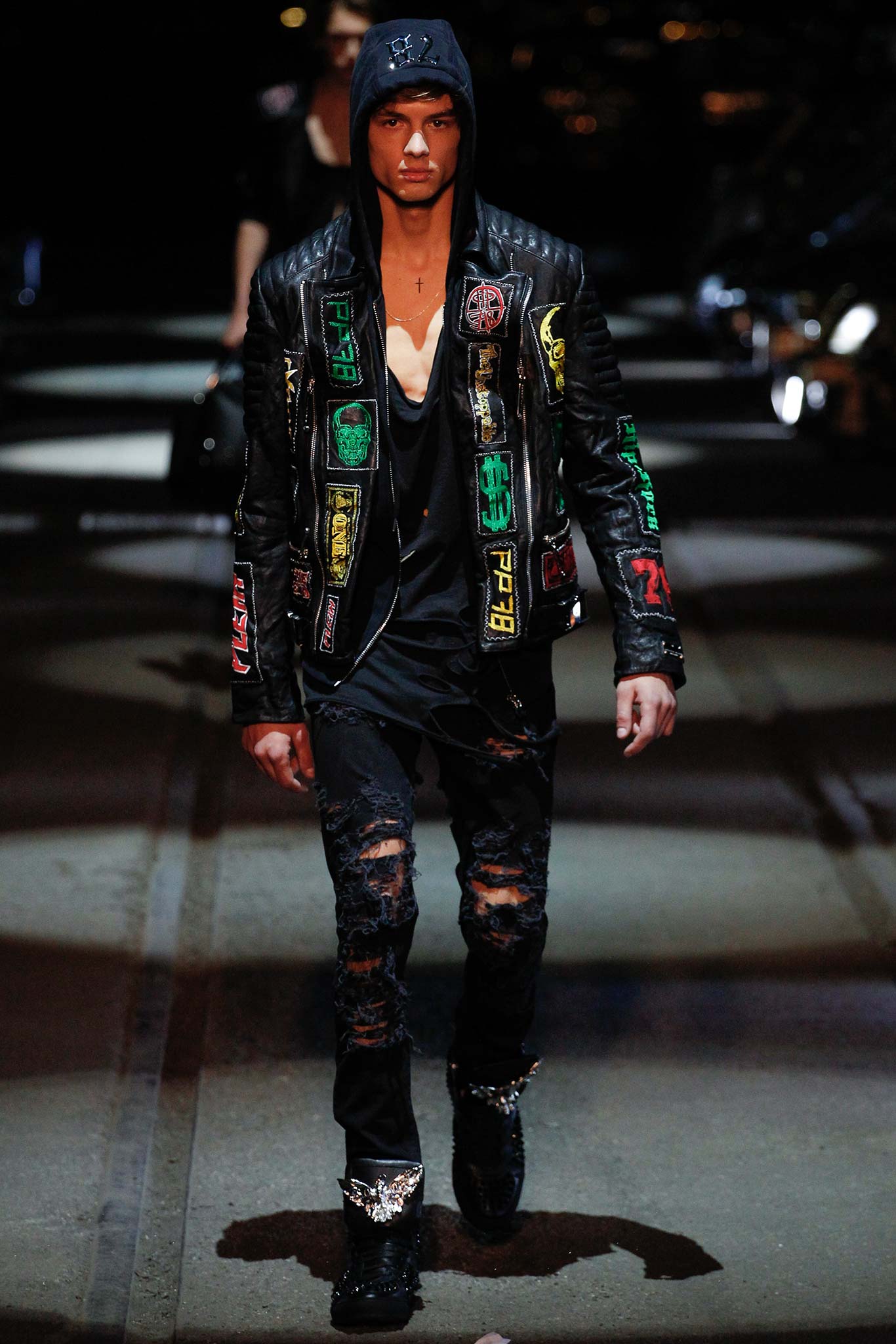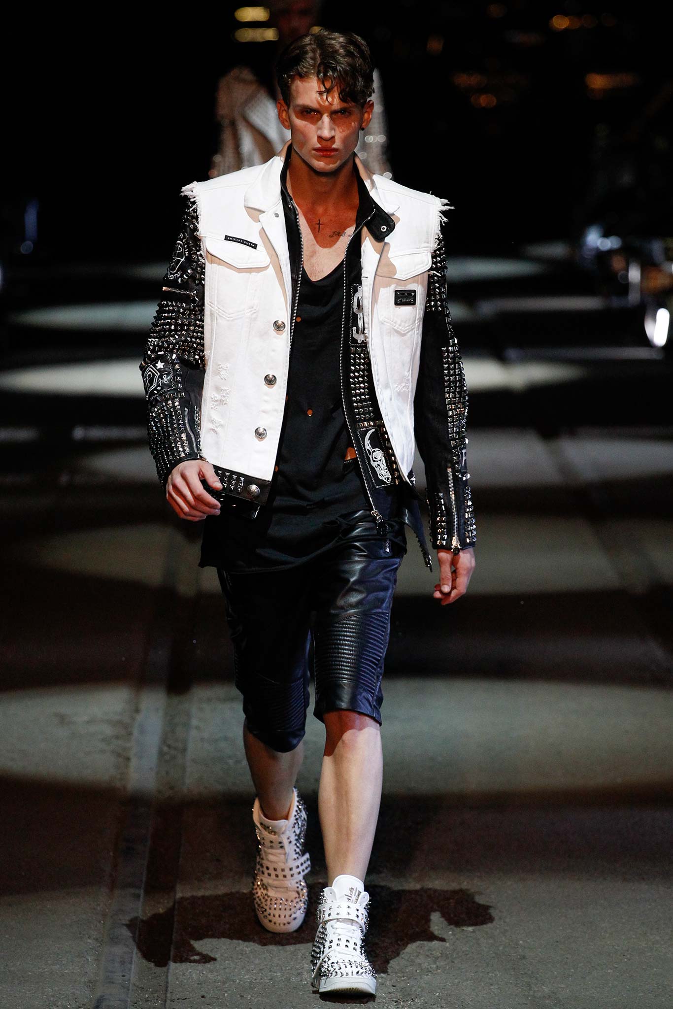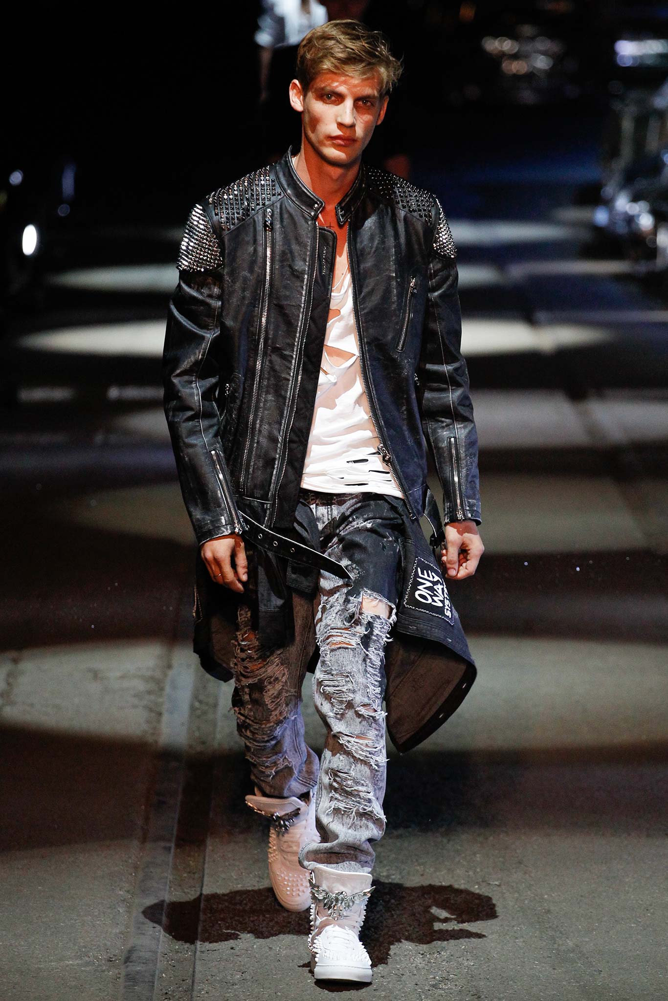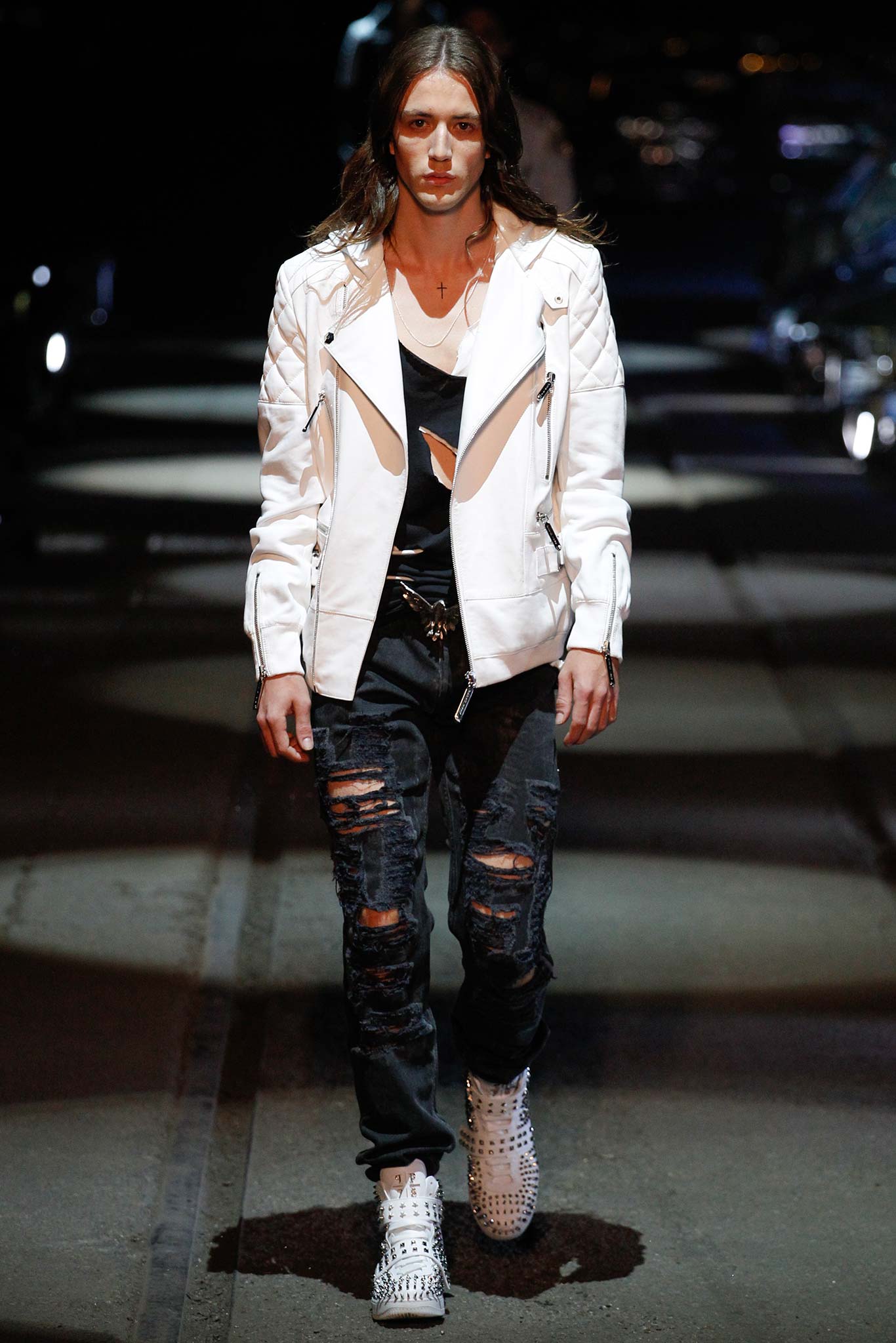 It was Mad Max meets The Fast and the Furious. First a team of silver mohawked motorcyclists raced around the rail-yard wrecks, followed by two gold-sprayed BMWs that burnt rubber and skidded on two wheels down one side of the catwalk before one of them was set on fire and pursued by a New York police car. Got that? Then Tyga got out of one and started rapping as Plein’s “hip-rock” collection was finally revealed. This was an in-your-face amalgam of hyper-stylized punk gear and hyper-stylized sportswear. So there were studded hoodies under studded bikers lined with Plein-customized band-patch logos. A black biker was worn over a shredded scoop-neck tee and black track pants painted white with hashtags, “RICH A$$” and the fundamental unmentionable. A stud-lapelled jacket was worn over a T-shirt painted with a Spinal Tap-worthy album cover image of an epically bosomed, big-haired woman with massive shoulder pads and a facemask. The sneakers were strapped and studded high-tops in silver, black, and white. Biker pants and shorts rubbed along with varsity jackets and skinny eveningwear, all heartily Plein-ed.