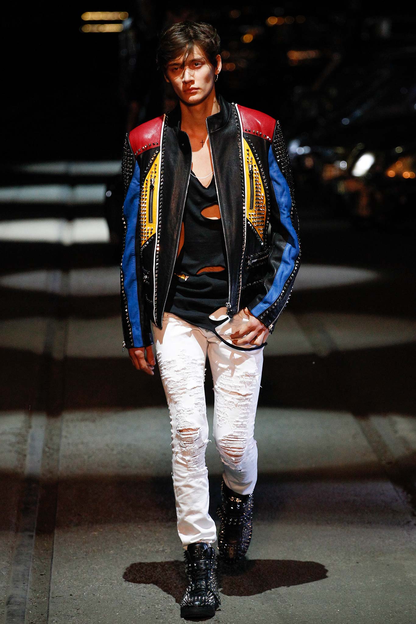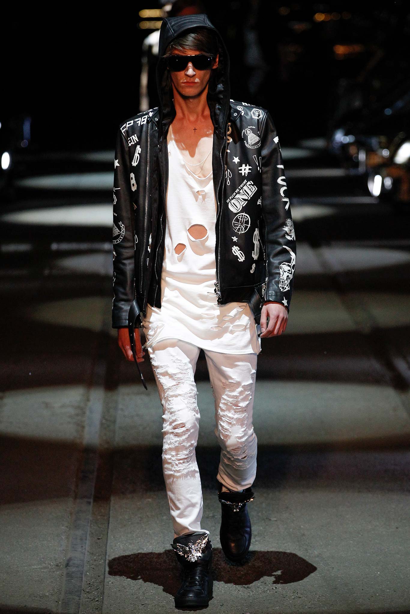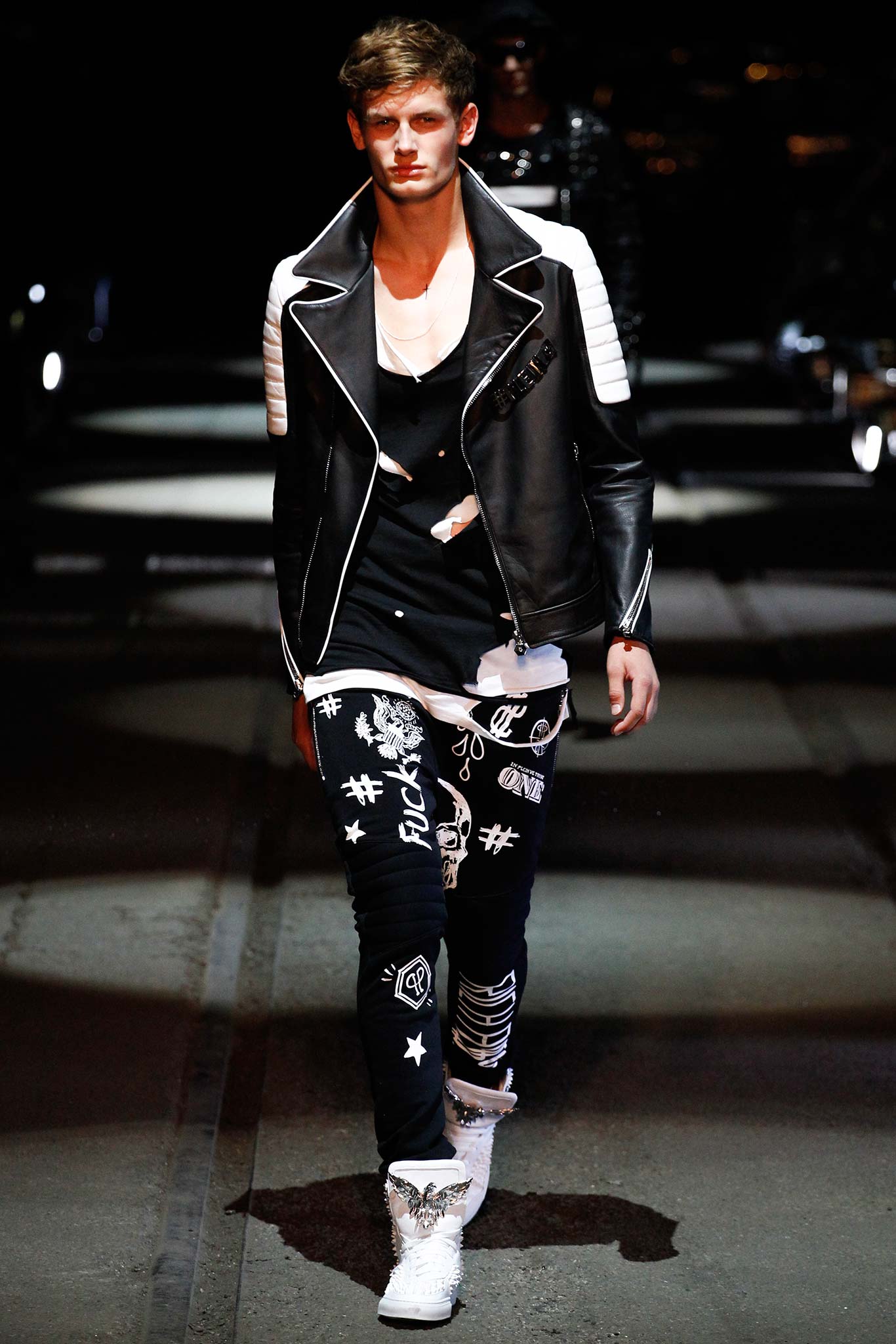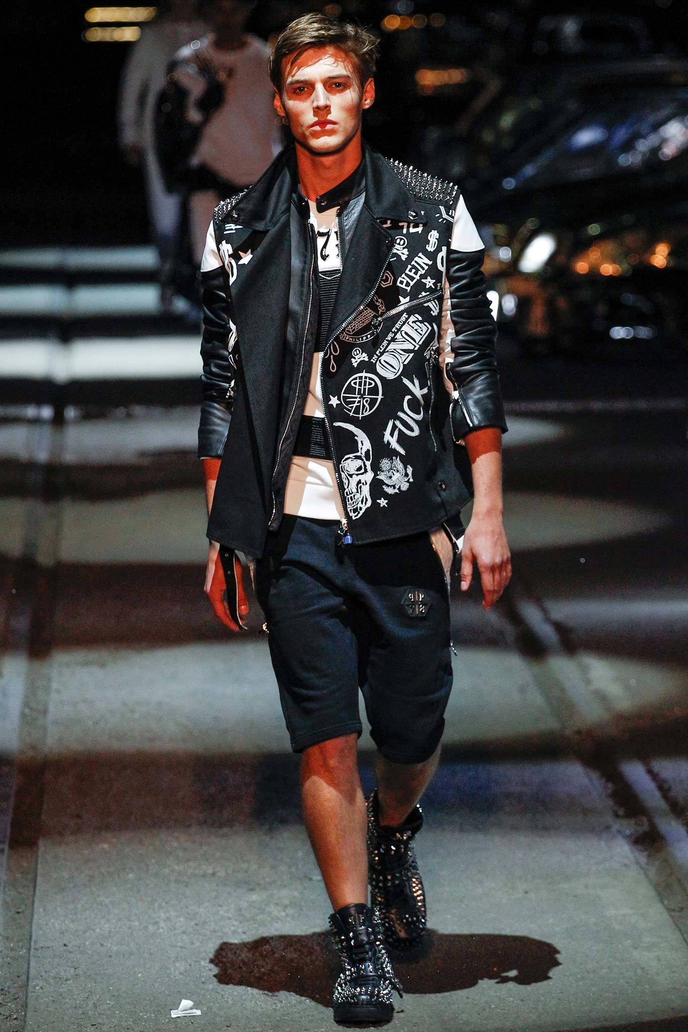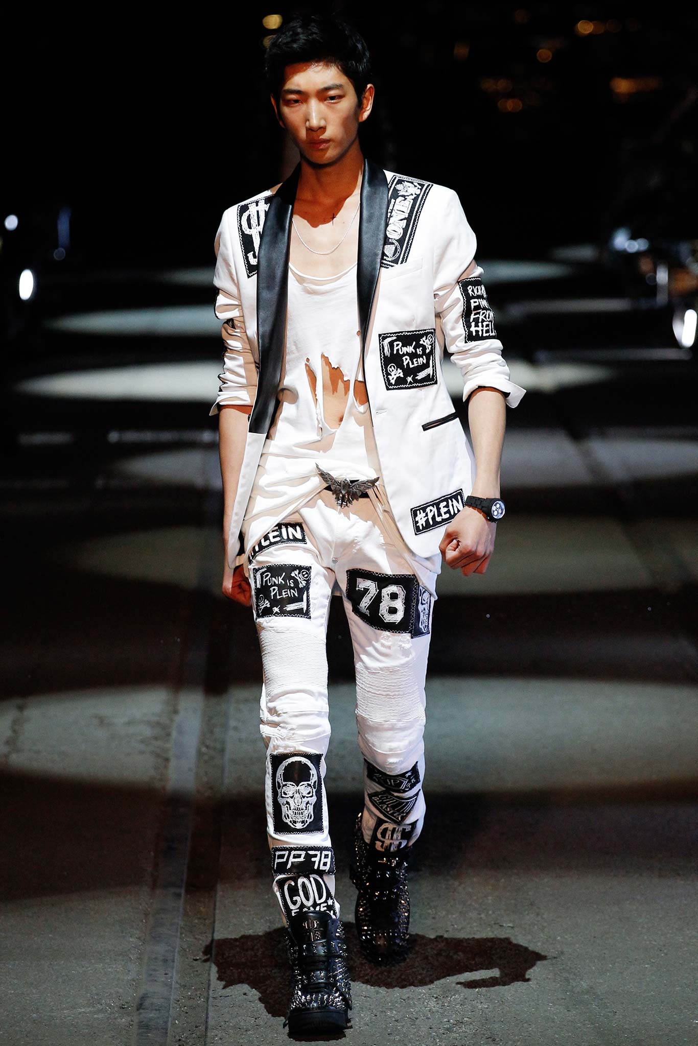 It was Mad Max meets The Fast and the Furious. First a team of silver mohawked motorcyclists raced around the rail-yard wrecks, followed by two gold-sprayed BMWs that burnt rubber and skidded on two wheels down one side of the catwalk before one of them was set on fire and pursued by a New York police car. Got that? Then Tyga got out of one and started rapping as Plein’s “hip-rock” collection was finally revealed. This was an in-your-face amalgam of hyper-stylized punk gear and hyper-stylized sportswear. So there were studded hoodies under studded bikers lined with Plein-customized band-patch logos. A black biker was worn over a shredded scoop-neck tee and black track pants painted white with hashtags, “RICH A$$” and the fundamental unmentionable. A stud-lapelled jacket was worn over a T-shirt painted with a Spinal Tap-worthy album cover image of an epically bosomed, big-haired woman with massive shoulder pads and a facemask. The sneakers were strapped and studded high-tops in silver, black, and white. Biker pants and shorts rubbed along with varsity jackets and skinny eveningwear, all heartily Plein-ed.