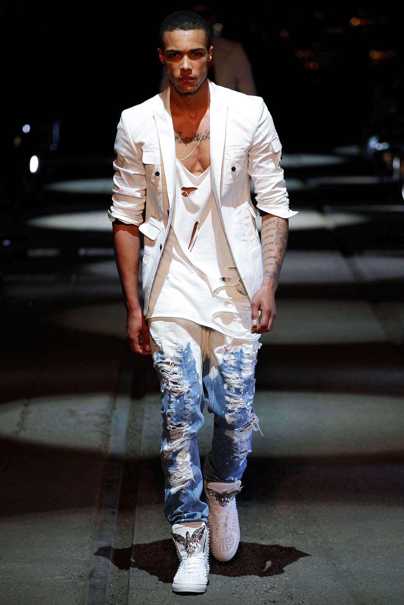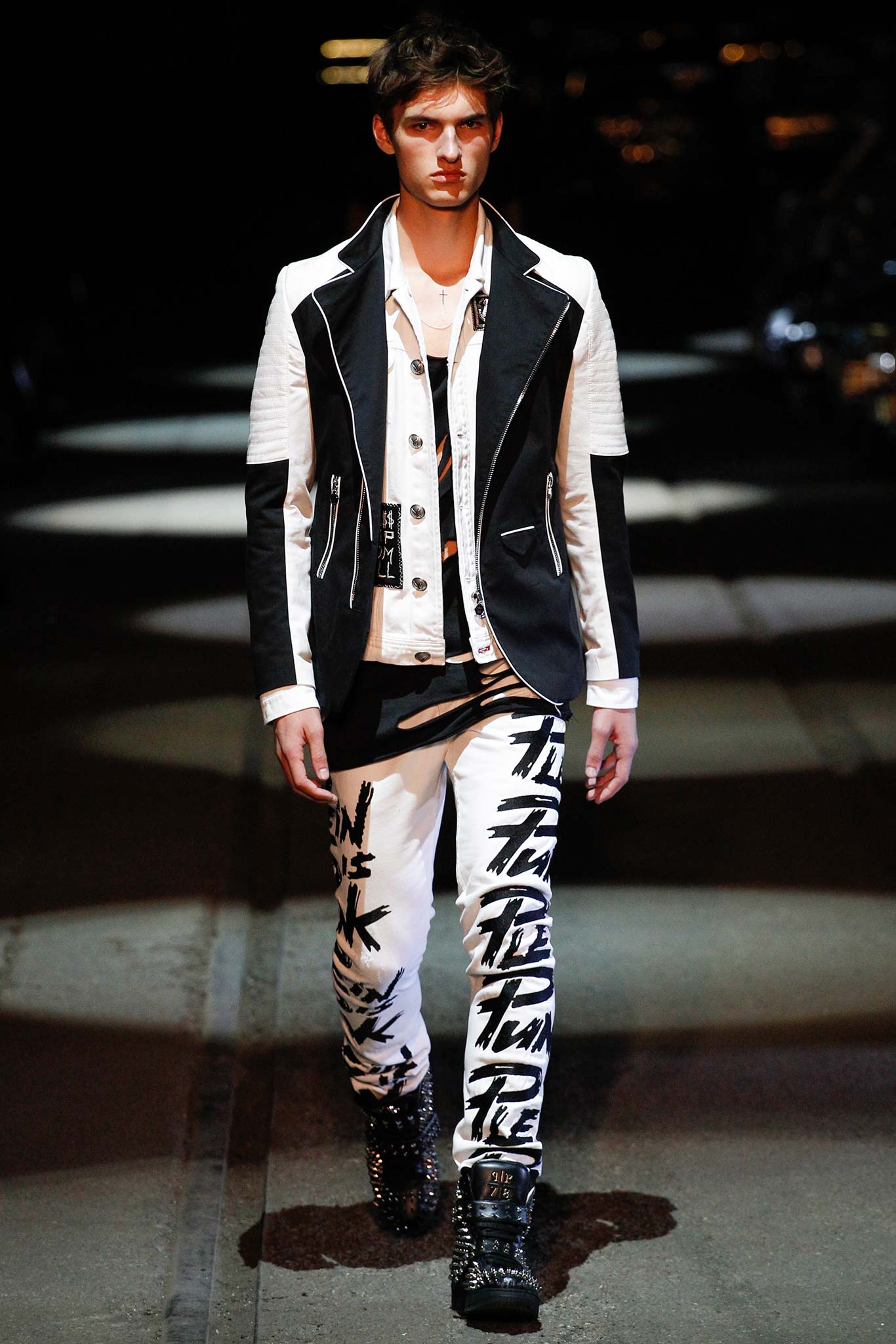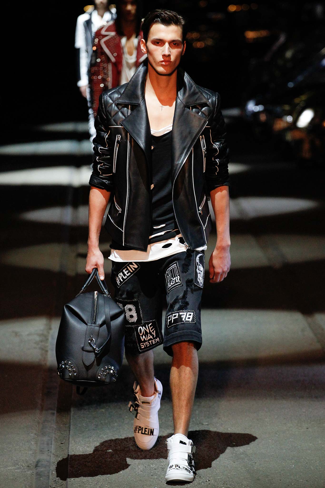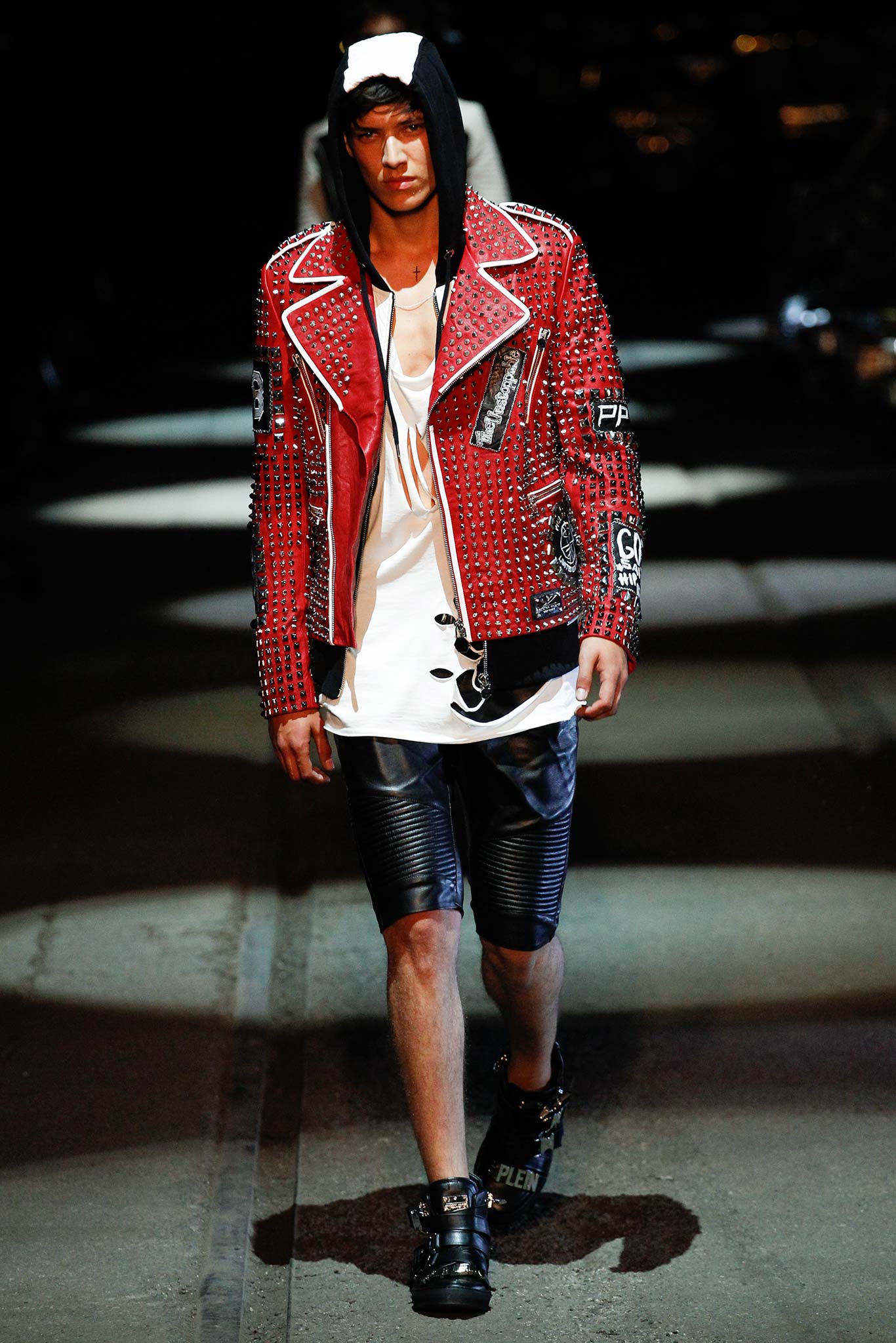 It was Mad Max meets The Fast and the Furious. First a team of silver mohawked motorcyclists raced around the rail-yard wrecks, followed by two gold-sprayed BMWs that burnt rubber and skidded on two wheels down one side of the catwalk before one of them was set on fire and pursued by a New York police car. Got that? Then Tyga got out of one and started rapping as Plein’s “hip-rock” collection was finally revealed. This was an in-your-face amalgam of hyper-stylized punk gear and hyper-stylized sportswear. So there were studded hoodies under studded bikers lined with Plein-customized band-patch logos. A black biker was worn over a shredded scoop-neck tee and black track pants painted white with hashtags, “RICH A$$” and the fundamental unmentionable. A stud-lapelled jacket was worn over a T-shirt painted with a Spinal Tap-worthy album cover image of an epically bosomed, big-haired woman with massive shoulder pads and a facemask. The sneakers were strapped and studded high-tops in silver, black, and white. Biker pants and shorts rubbed along with varsity jackets and skinny eveningwear, all heartily Plein-ed.