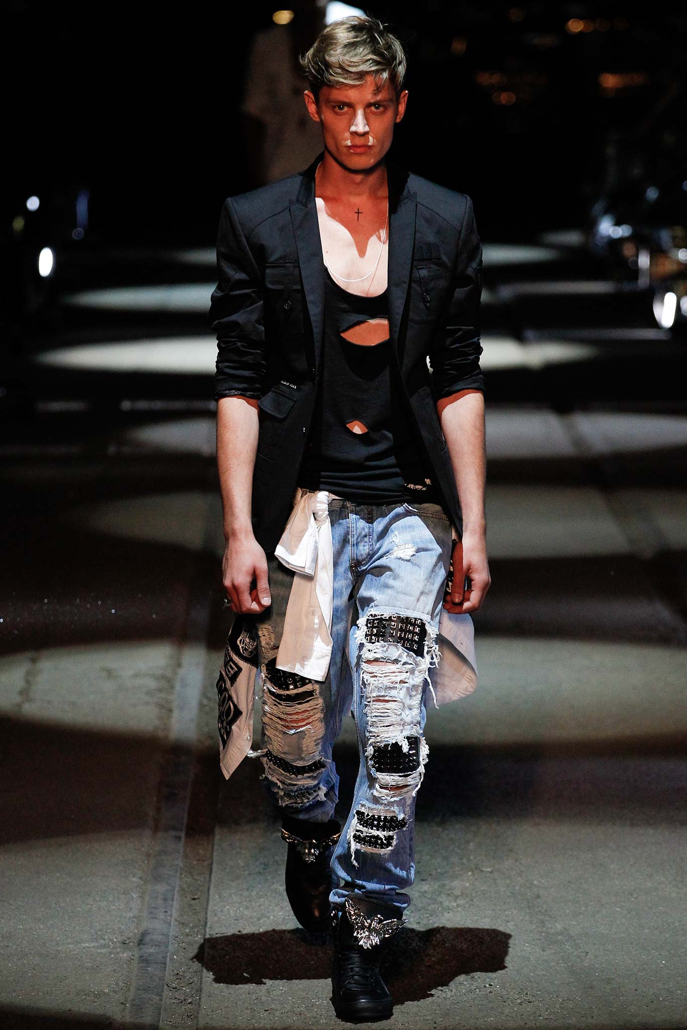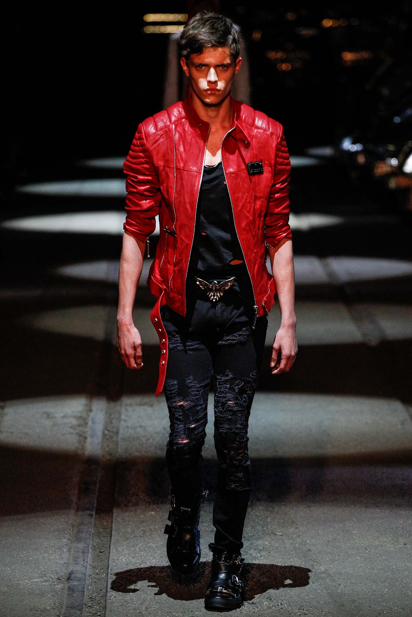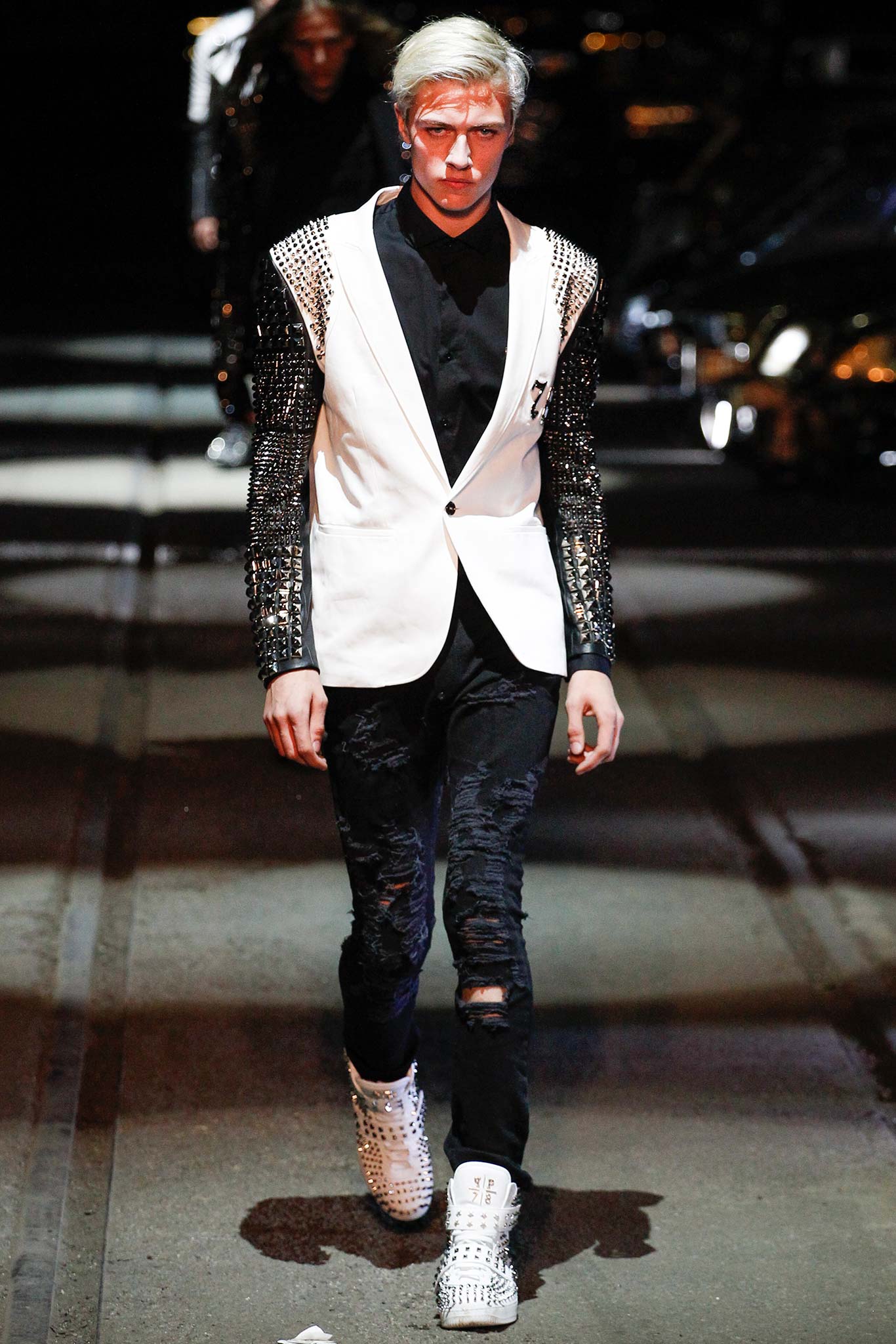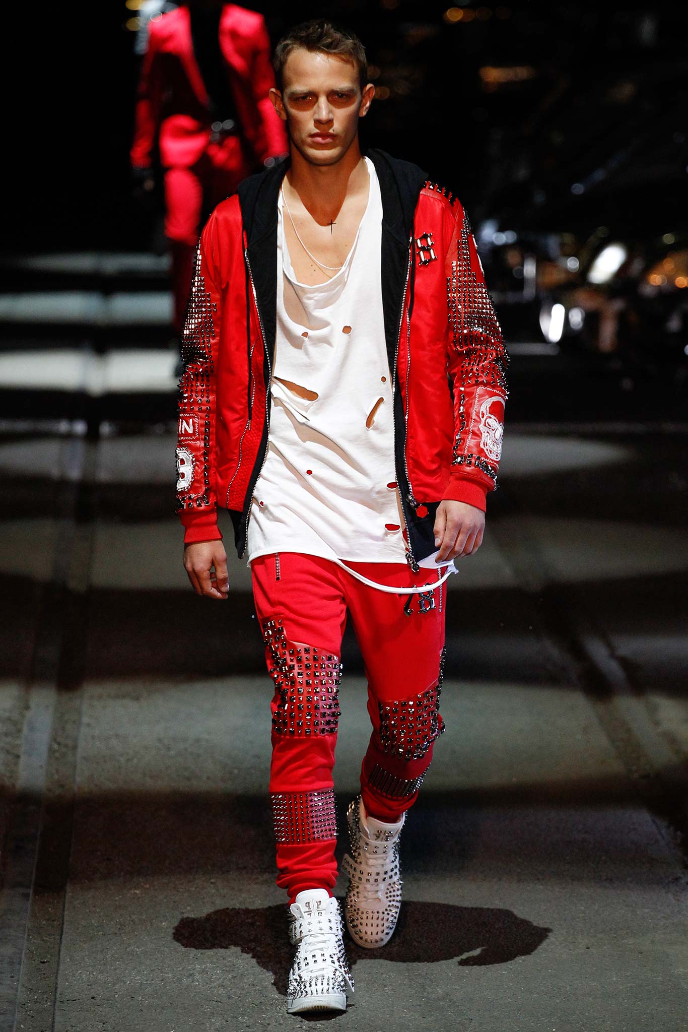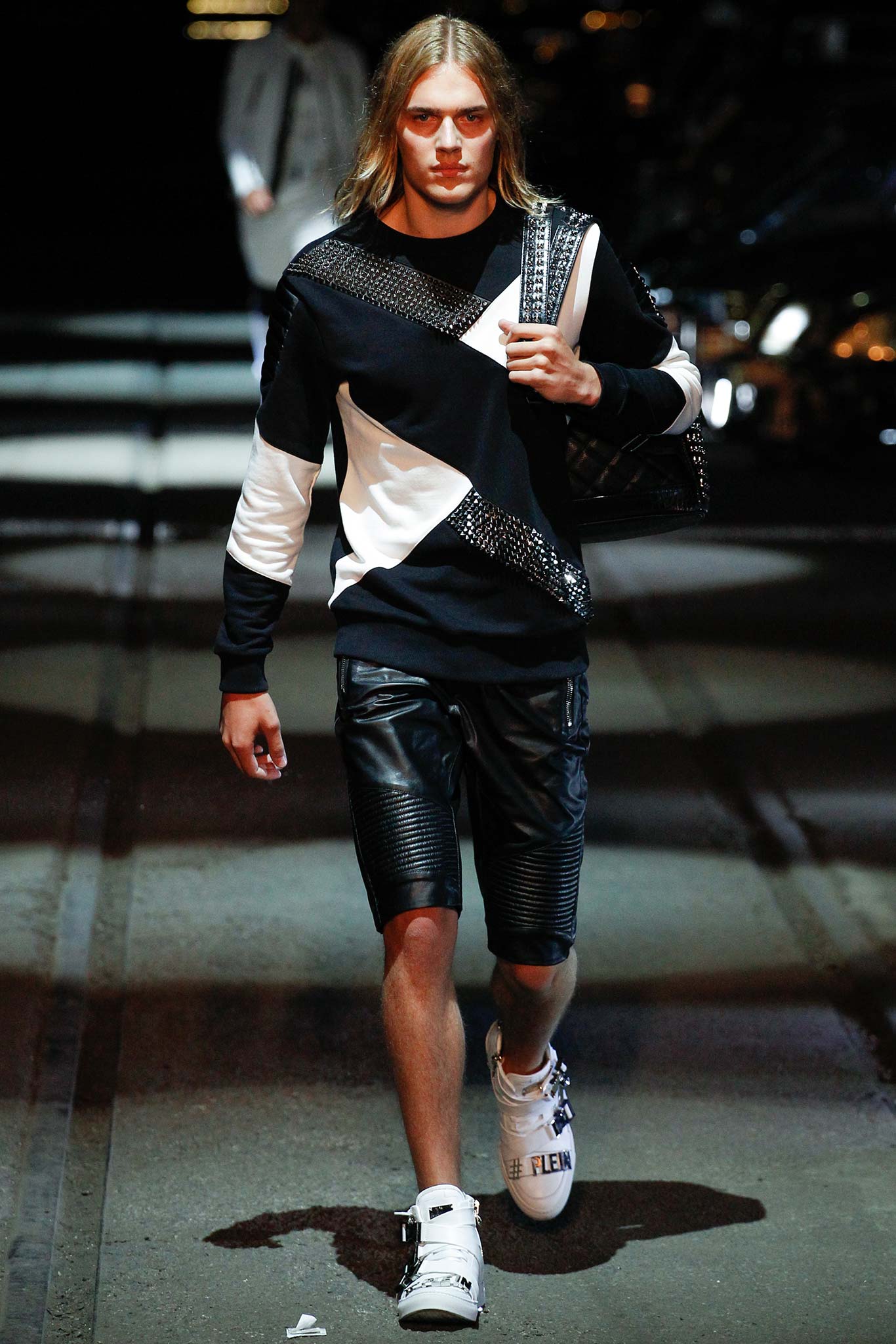It was Mad Max meets The Fast and the Furious. First a team of silver mohawked motorcyclists raced around the rail-yard wrecks, followed by two gold-sprayed BMWs that burnt rubber and skidded on two wheels down one side of the catwalk before one of them was set on fire and pursued by a New York police car. Got that? Then Tyga got out of one and started rapping as Plein’s “hip-rock” collection was finally revealed. This was an in-your-face amalgam of hyper-stylized punk gear and hyper-stylized sportswear. So there were studded hoodies under studded bikers lined with Plein-customized band-patch logos. A black biker was worn over a shredded scoop-neck tee and black track pants painted white with hashtags, “RICH A$$” and the fundamental unmentionable. A stud-lapelled jacket was worn over a T-shirt painted with a Spinal Tap-worthy album cover image of an epically bosomed, big-haired woman with massive shoulder pads and a facemask. The sneakers were strapped and studded high-tops in silver, black, and white. Biker pants and shorts rubbed along with varsity jackets and skinny eveningwear, all heartily Plein-ed.