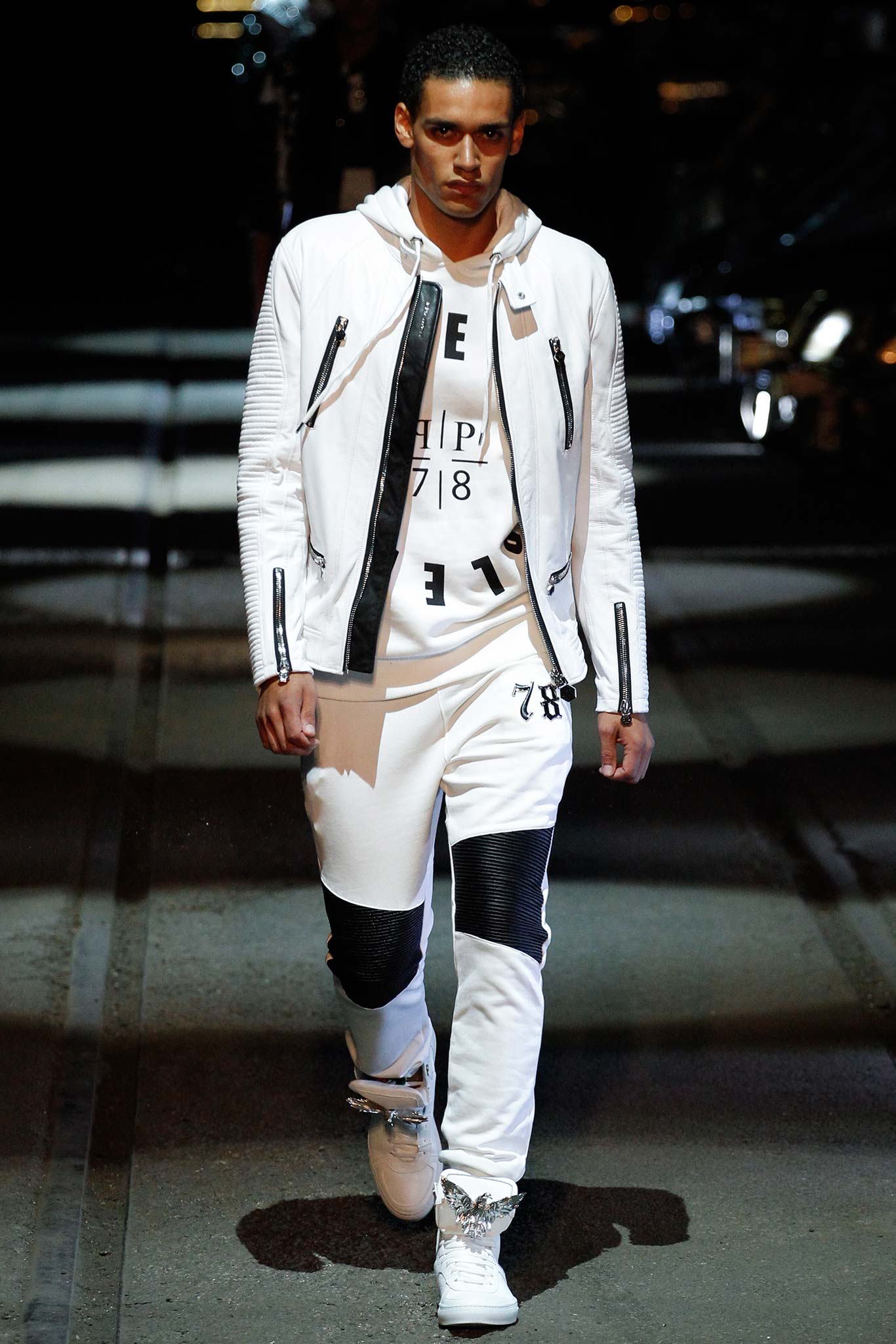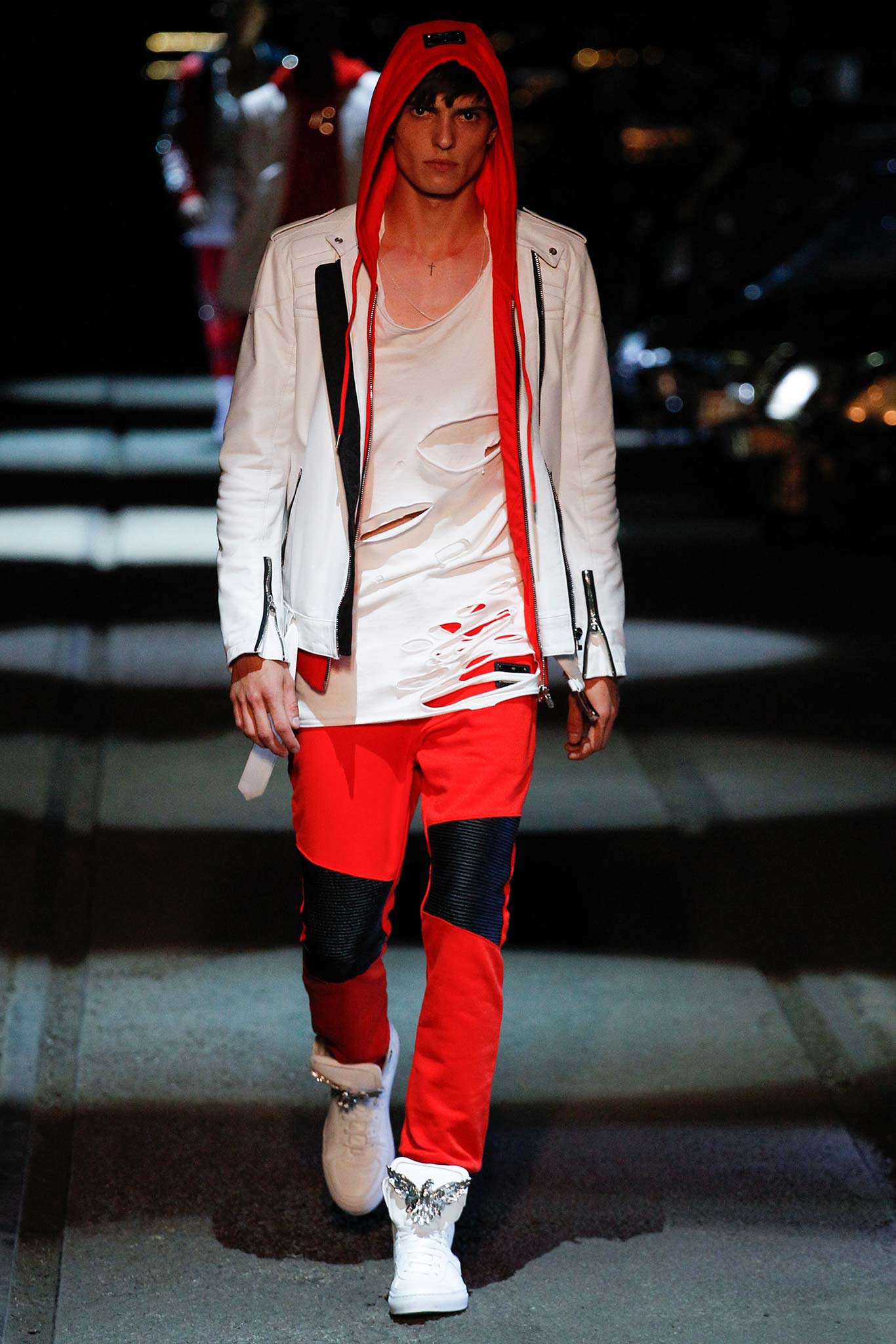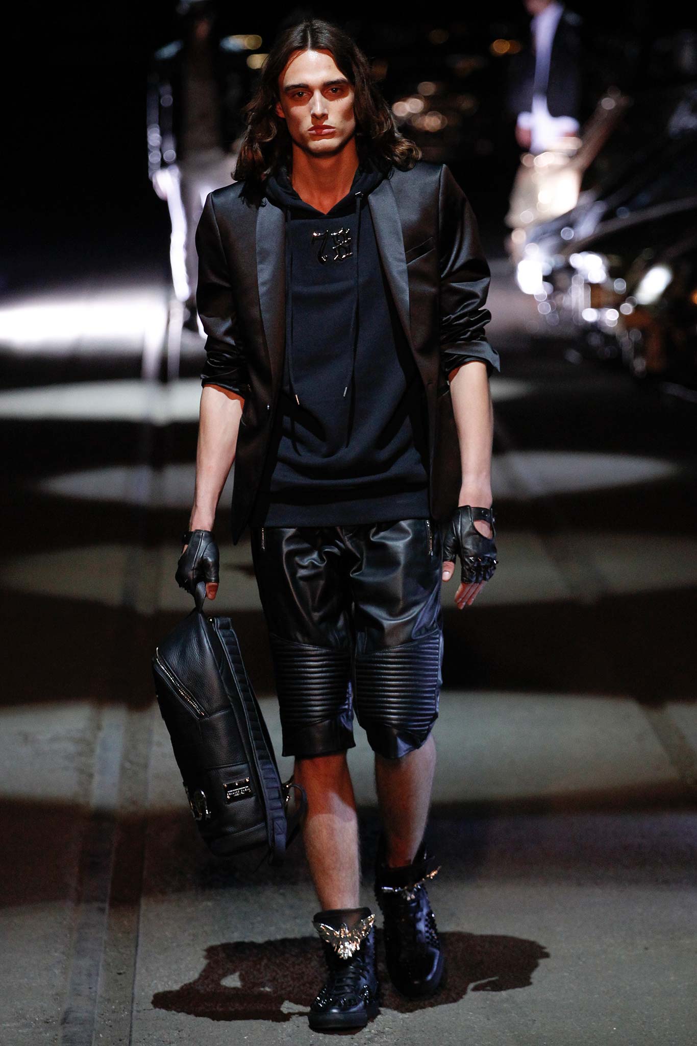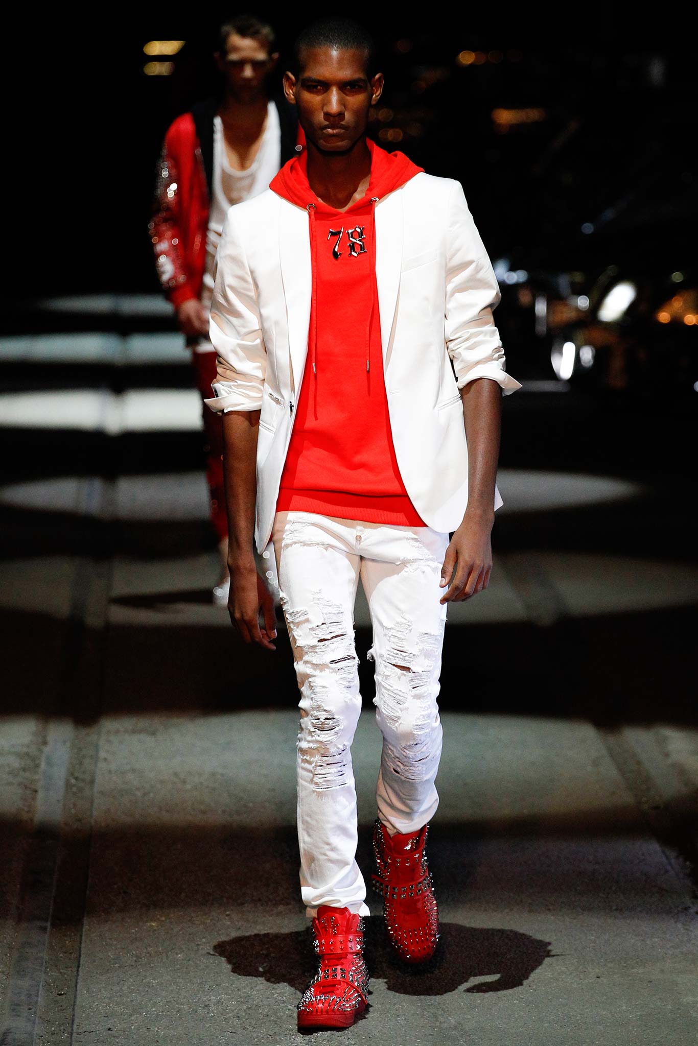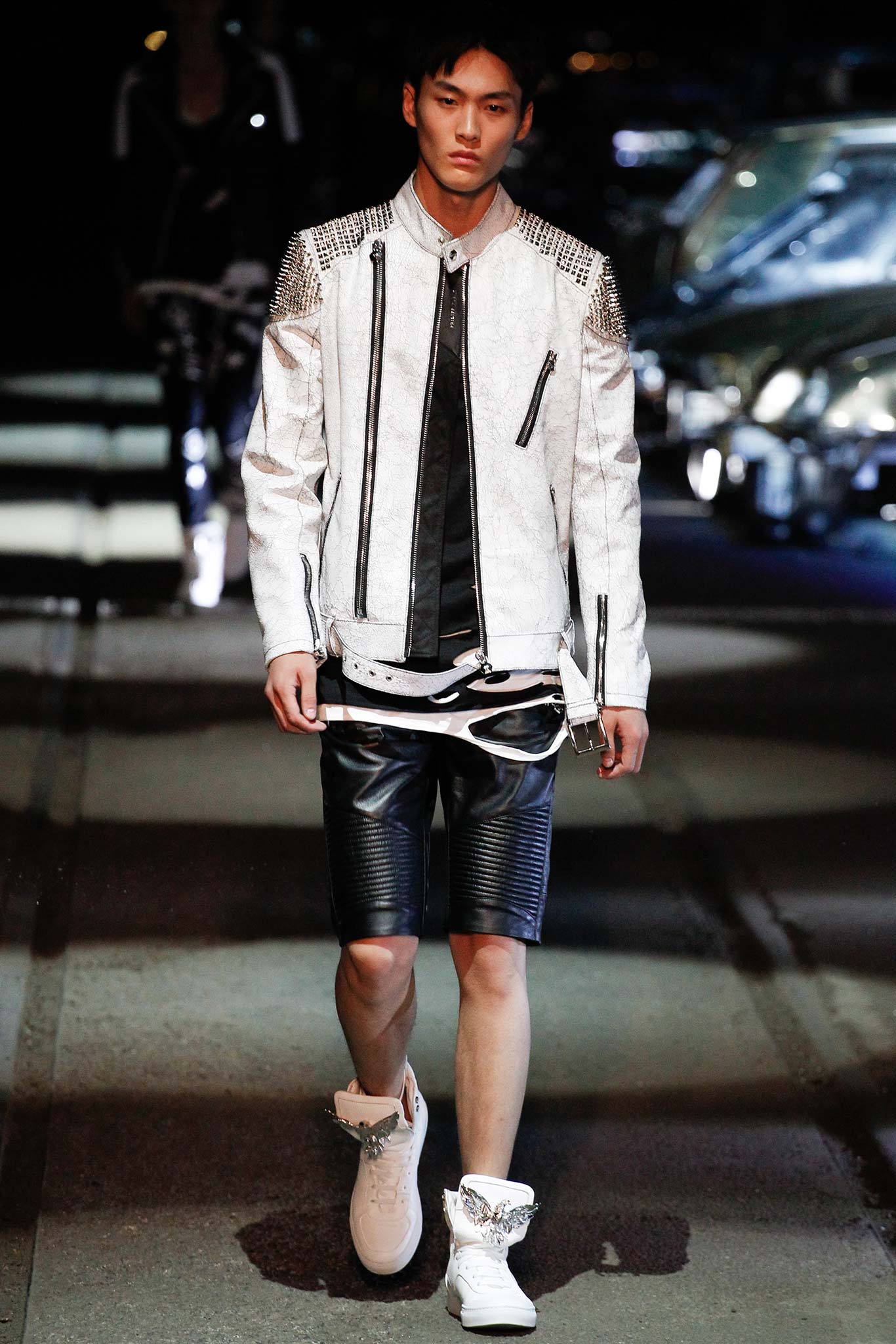 It was Mad Max meets The Fast and the Furious. First a team of silver mohawked motorcyclists raced around the rail-yard wrecks, followed by two gold-sprayed BMWs that burnt rubber and skidded on two wheels down one side of the catwalk before one of them was set on fire and pursued by a New York police car. Got that? Then Tyga got out of one and started rapping as Plein’s “hip-rock” collection was finally revealed. This was an in-your-face amalgam of hyper-stylized punk gear and hyper-stylized sportswear. So there were studded hoodies under studded bikers lined with Plein-customized band-patch logos. A black biker was worn over a shredded scoop-neck tee and black track pants painted white with hashtags, “RICH A$$” and the fundamental unmentionable. A stud-lapelled jacket was worn over a T-shirt painted with a Spinal Tap-worthy album cover image of an epically bosomed, big-haired woman with massive shoulder pads and a facemask. The sneakers were strapped and studded high-tops in silver, black, and white. Biker pants and shorts rubbed along with varsity jackets and skinny eveningwear, all heartily Plein-ed.