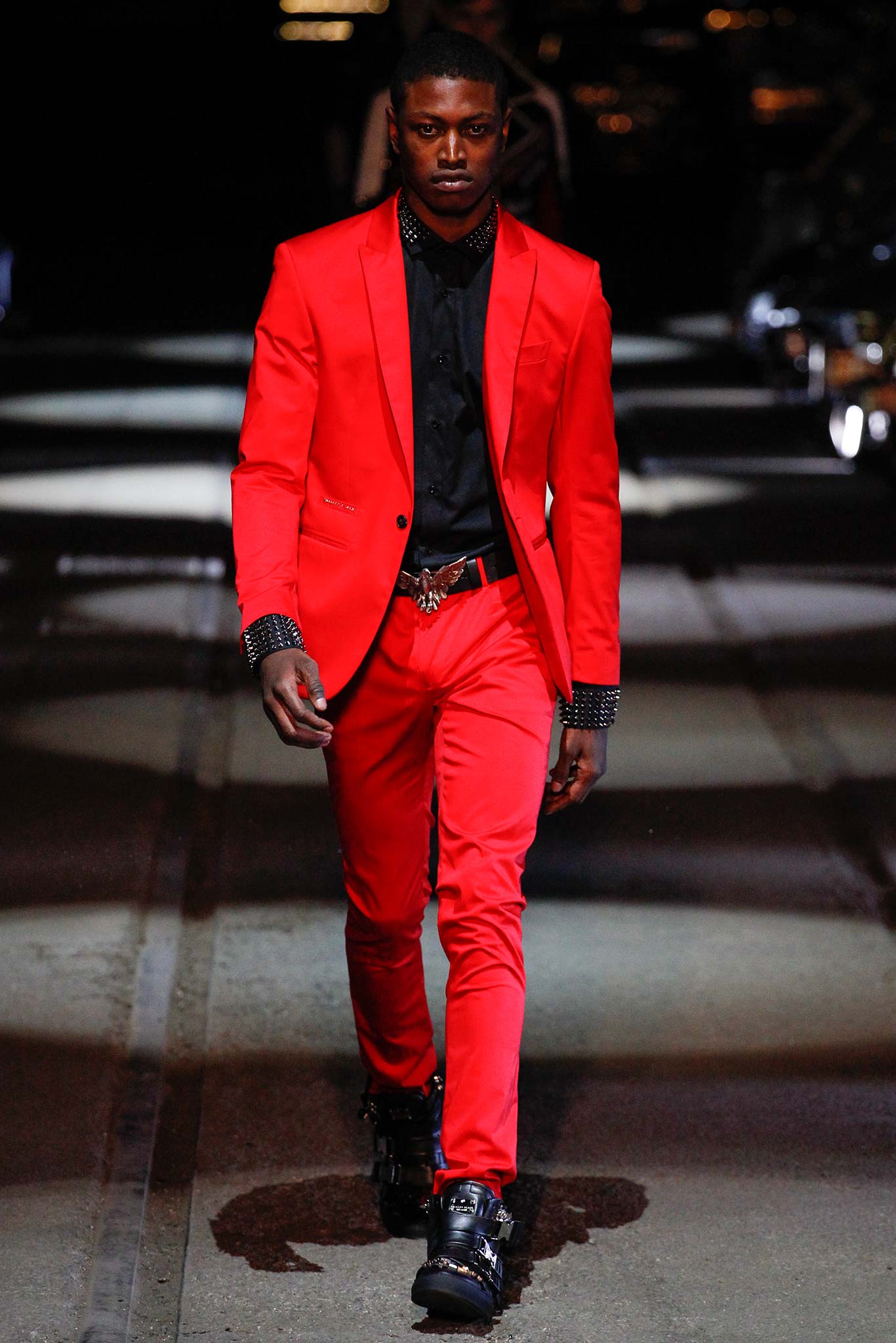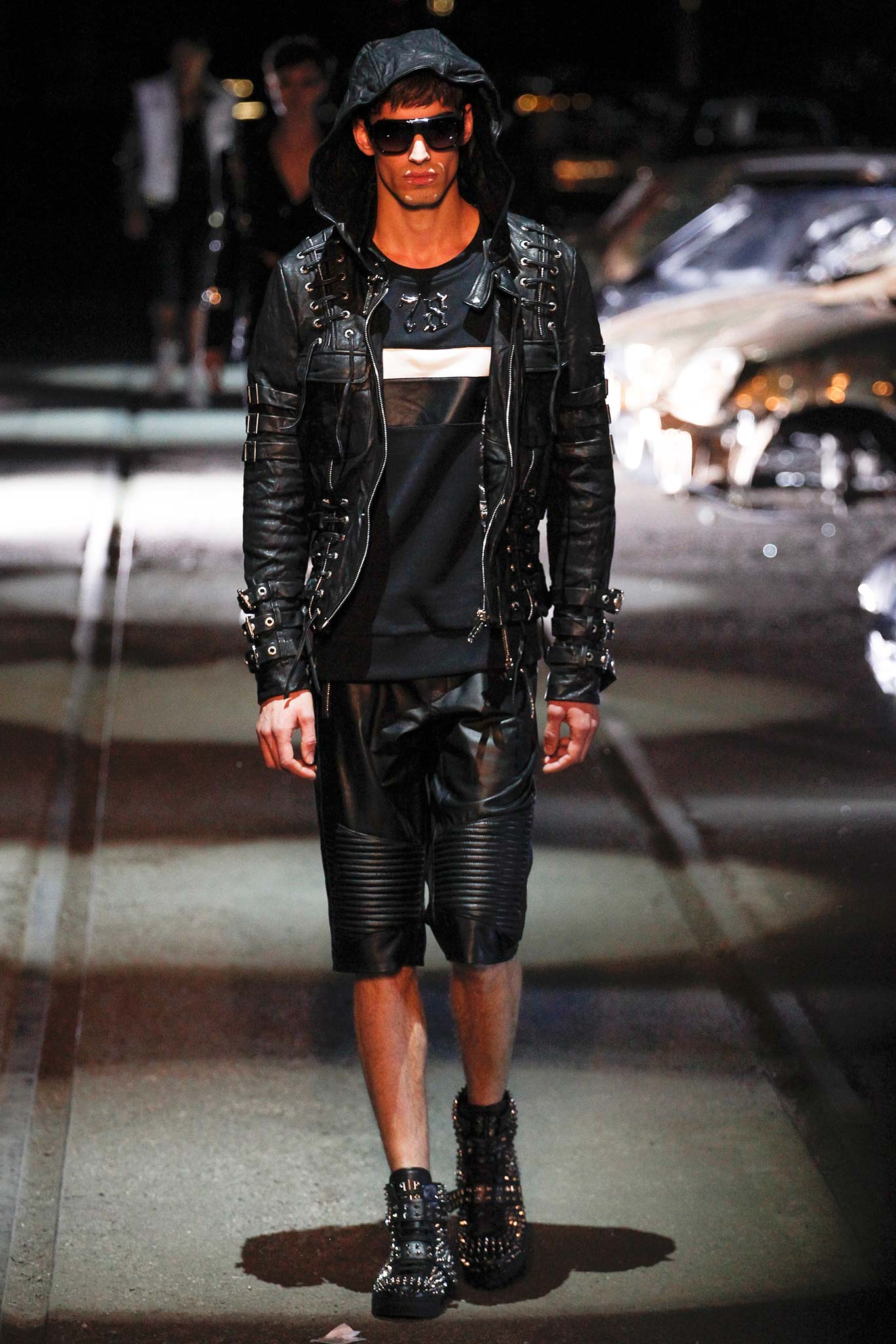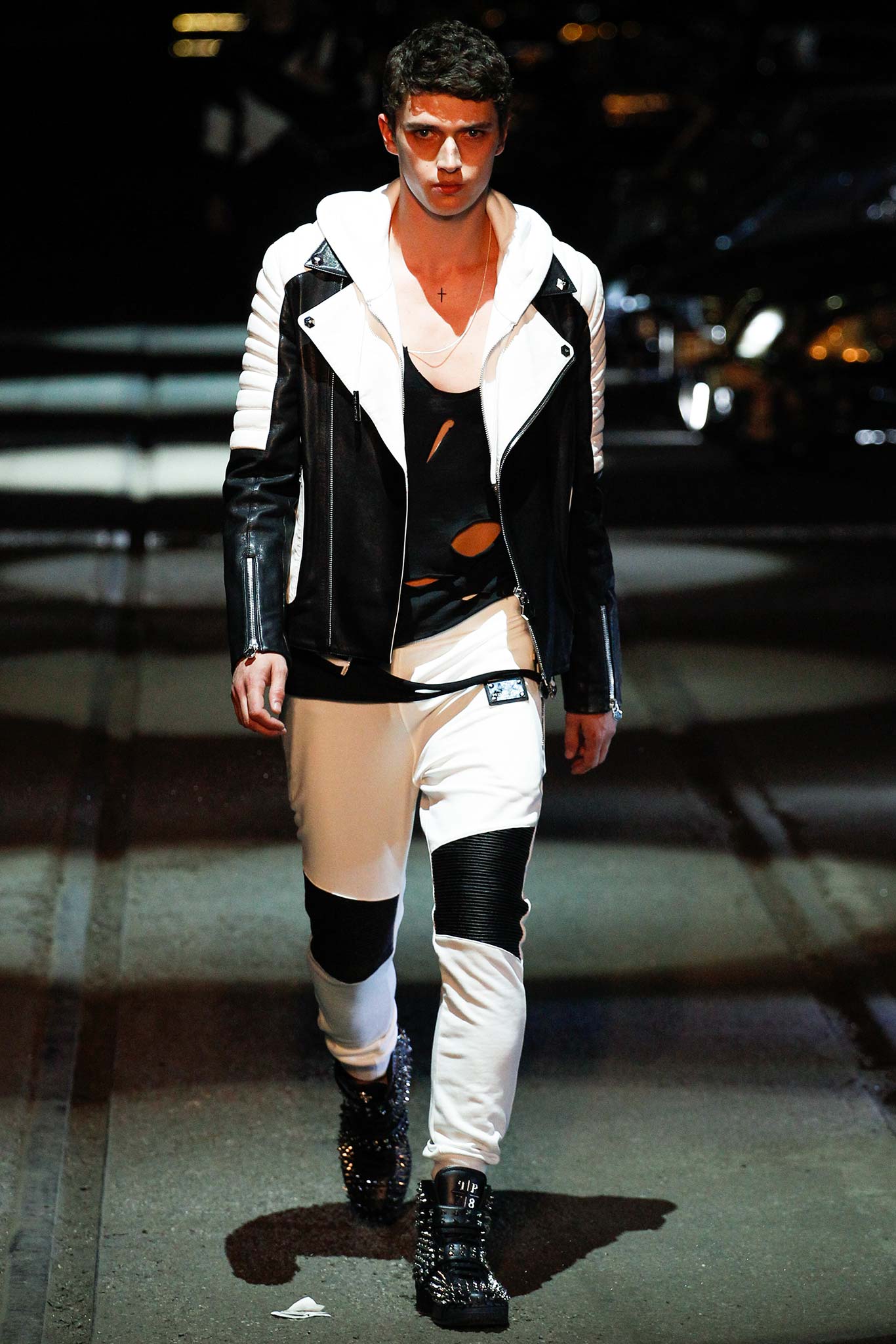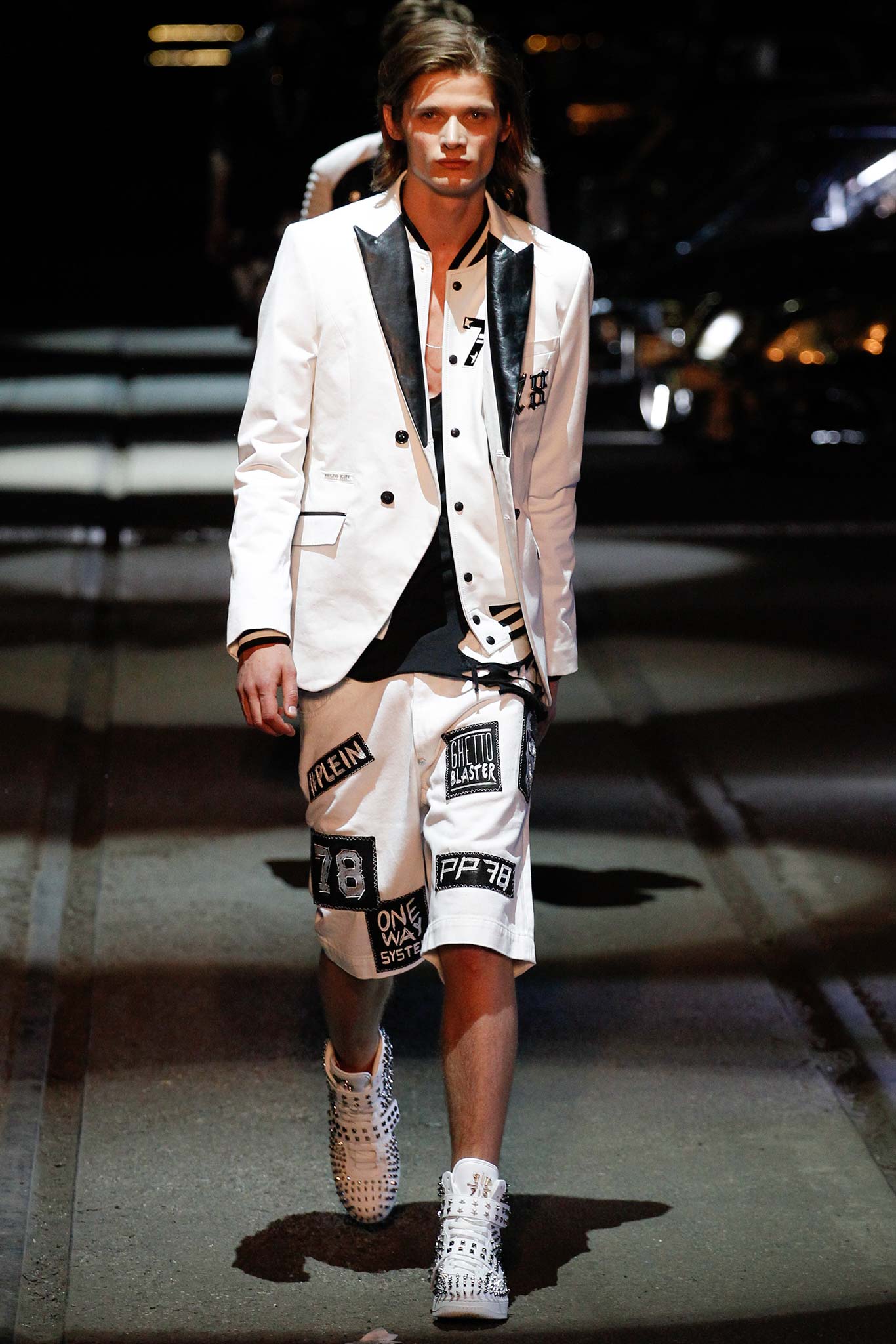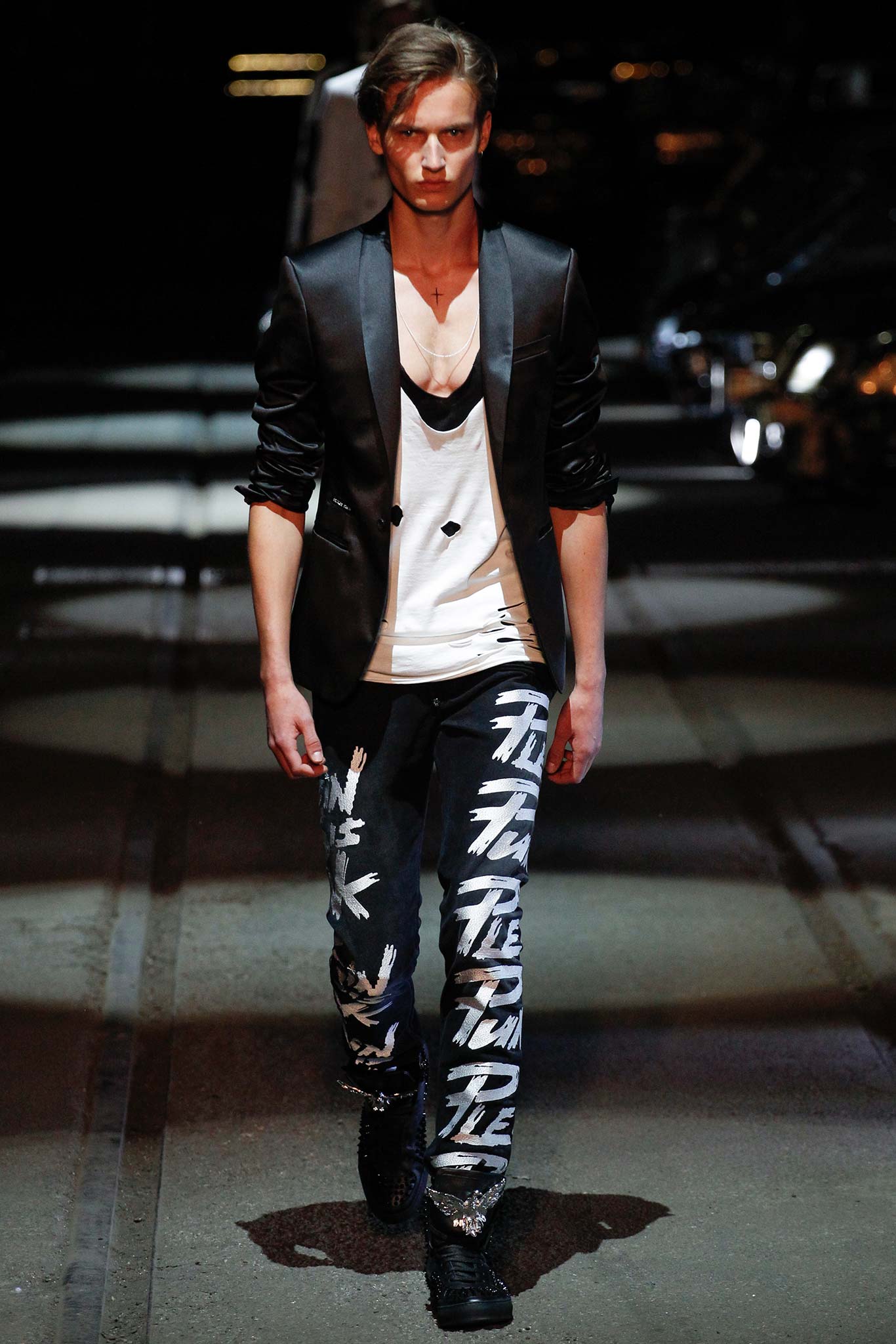 It was Mad Max meets The Fast and the Furious. First a team of silver mohawked motorcyclists raced around the rail-yard wrecks, followed by two gold-sprayed BMWs that burnt rubber and skidded on two wheels down one side of the catwalk before one of them was set on fire and pursued by a New York police car. Got that? Then Tyga got out of one and started rapping as Plein’s “hip-rock” collection was finally revealed. This was an in-your-face amalgam of hyper-stylized punk gear and hyper-stylized sportswear. So there were studded hoodies under studded bikers lined with Plein-customized band-patch logos. A black biker was worn over a shredded scoop-neck tee and black track pants painted white with hashtags, “RICH A$$” and the fundamental unmentionable. A stud-lapelled jacket was worn over a T-shirt painted with a Spinal Tap-worthy album cover image of an epically bosomed, big-haired woman with massive shoulder pads and a facemask. The sneakers were strapped and studded high-tops in silver, black, and white. Biker pants and shorts rubbed along with varsity jackets and skinny eveningwear, all heartily Plein-ed.