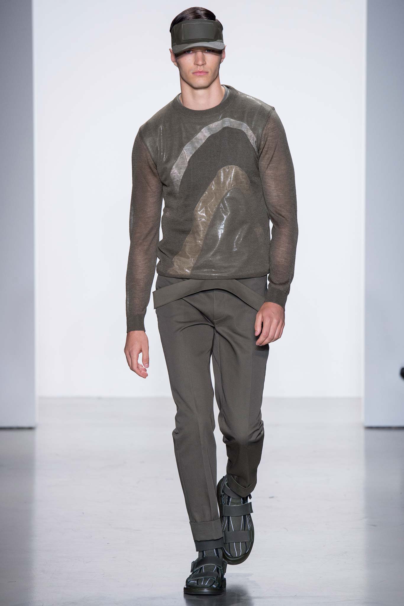 Sturdy fabrics like cotton twill added stiffness to topcoats and short, strong-shouldered jackets. Zucchelli also employed cotton twills and jacquards to approximate a signature of the brand — denim — giving jeans and jean jackets a worn, yet sculptural aspect. The other main ingredients were hefty military parkas, cropped nylon bombers, boxy T-shirts, and narrow chinos with a wavy loop of fabric tacked to the waistband, echoing the lacquered waves of color winking from sleeveless T-shirts layered under gauzy sweaters.
