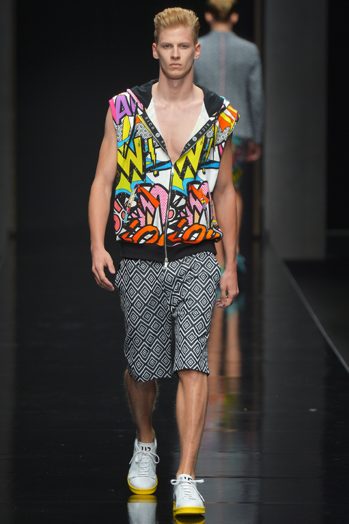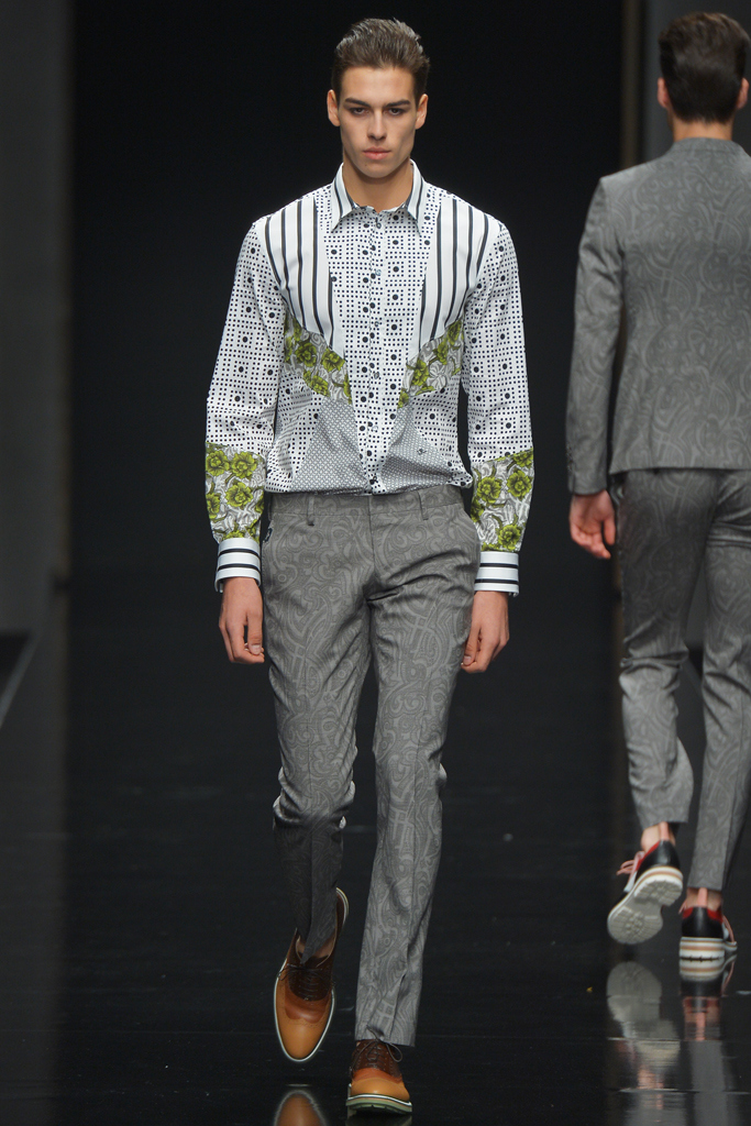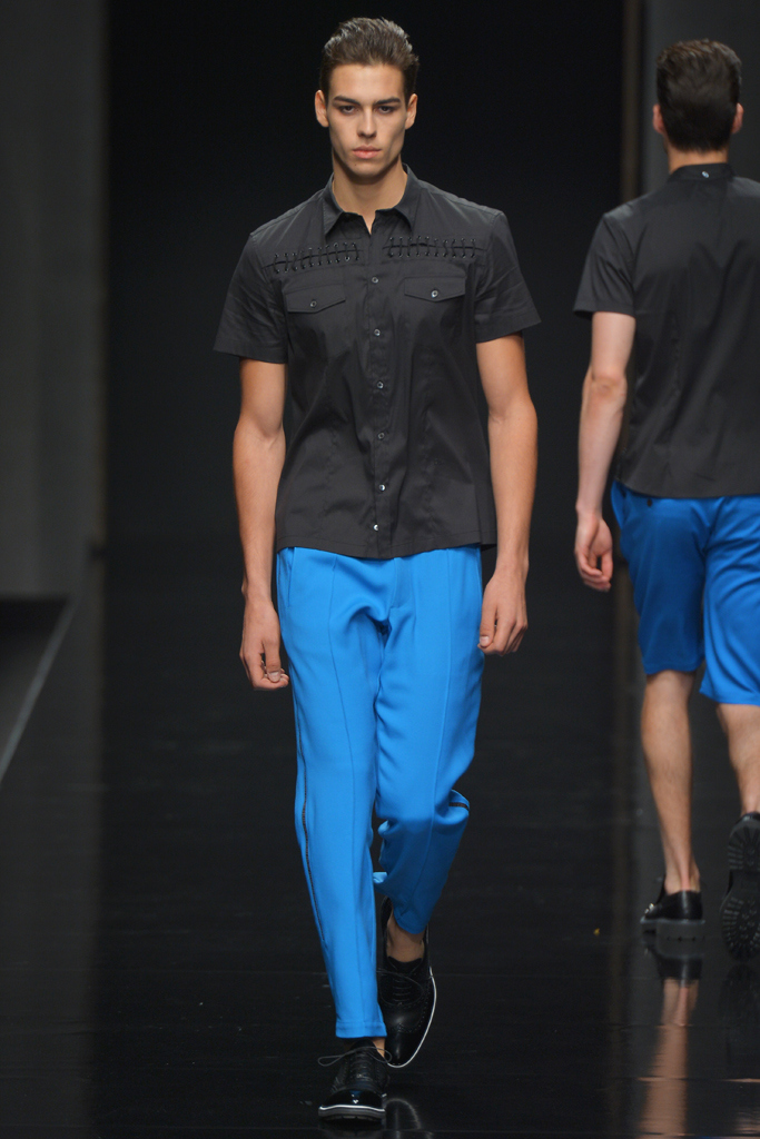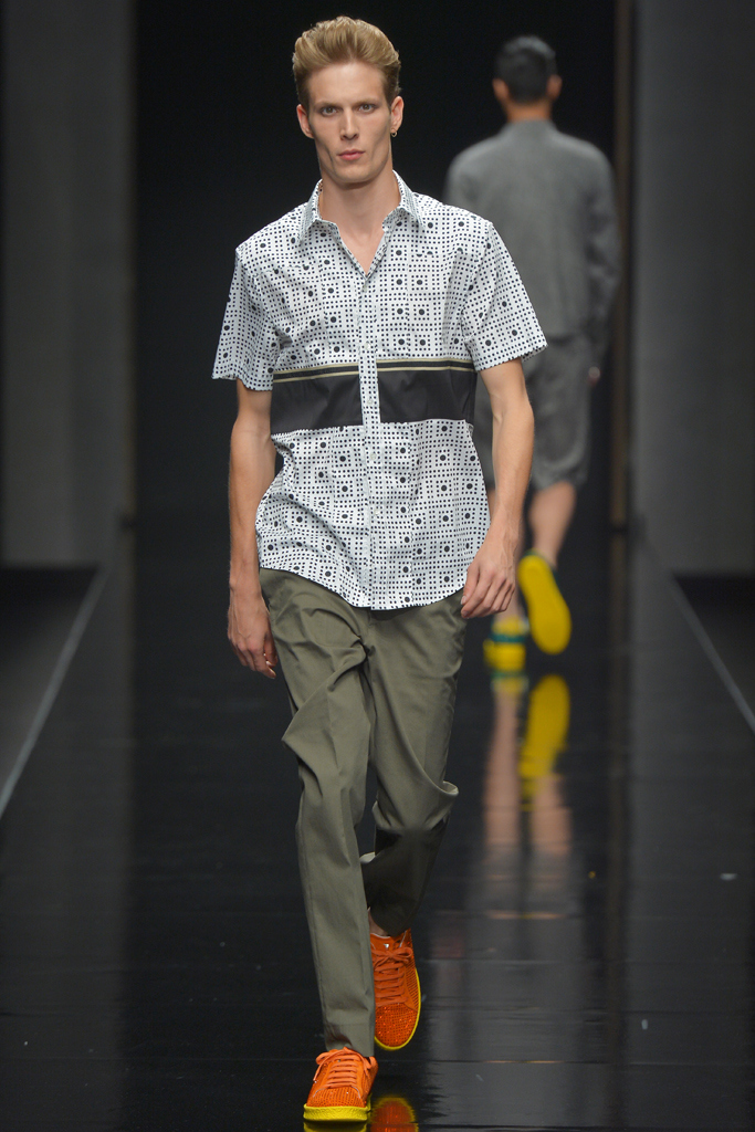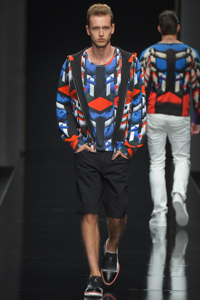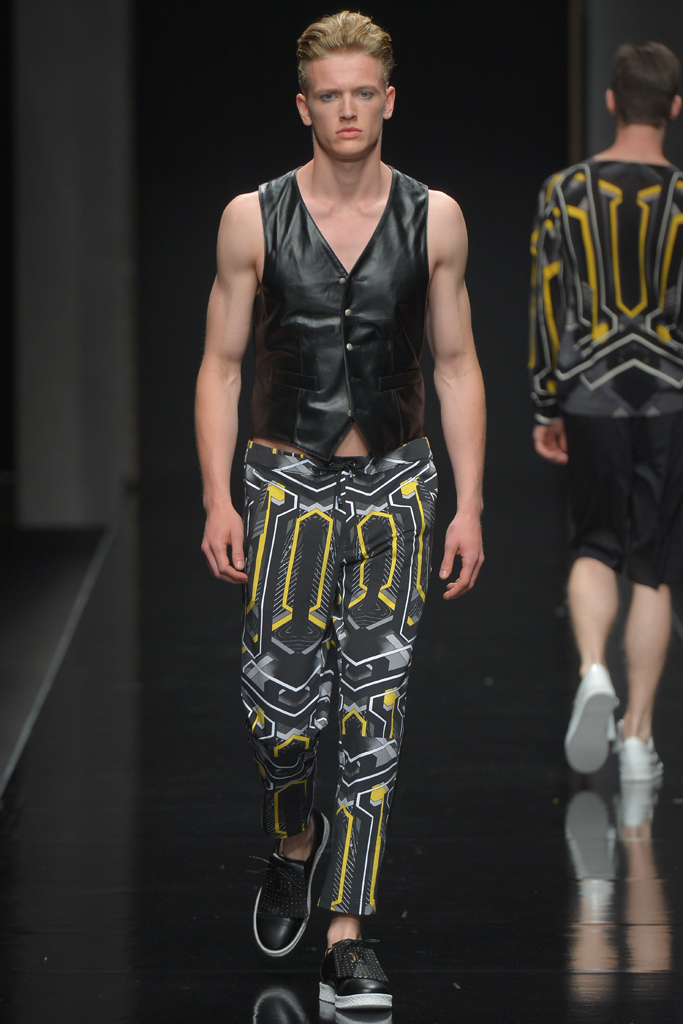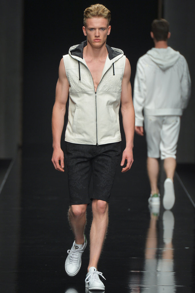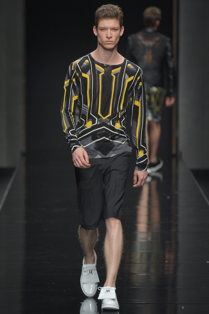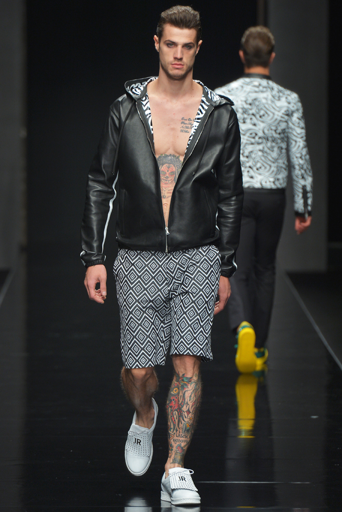 Sportswear pieces such as hooded zippered sweatshirts and roomy short pants were juxtaposed with tailored three-piece suits and embossed leather jackets paired with distressed denim. The most convincing results came when Richmond kept things simple: For instance, when he matched crisp, printed shirts with plain slim cotton trousers.