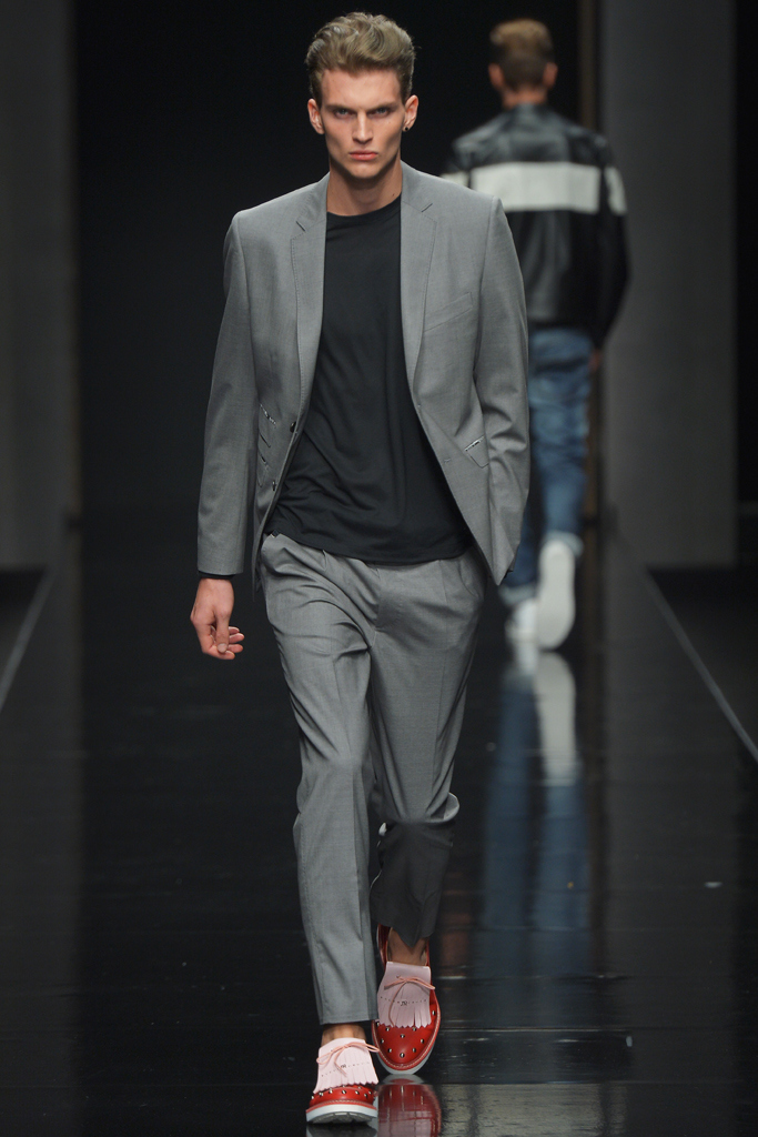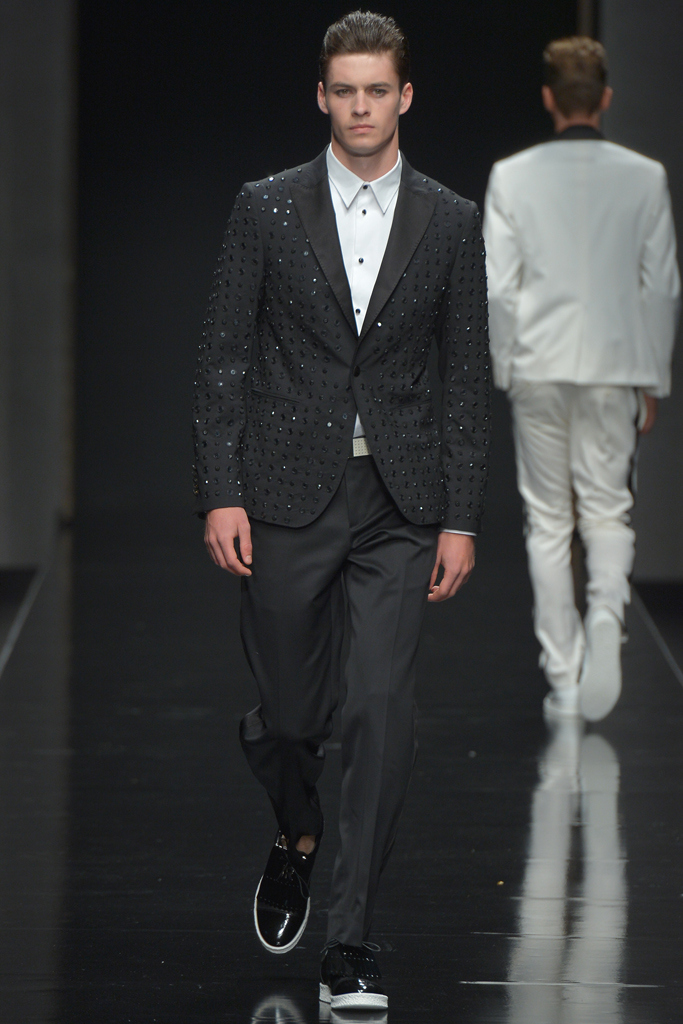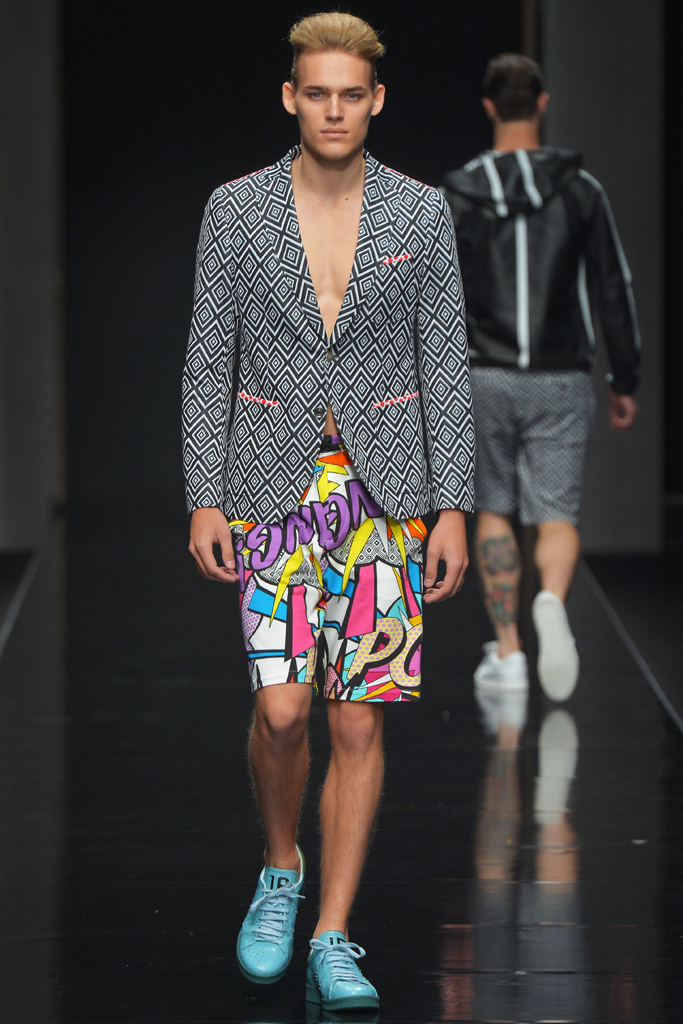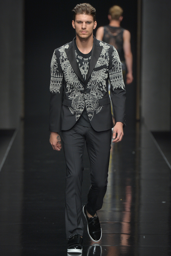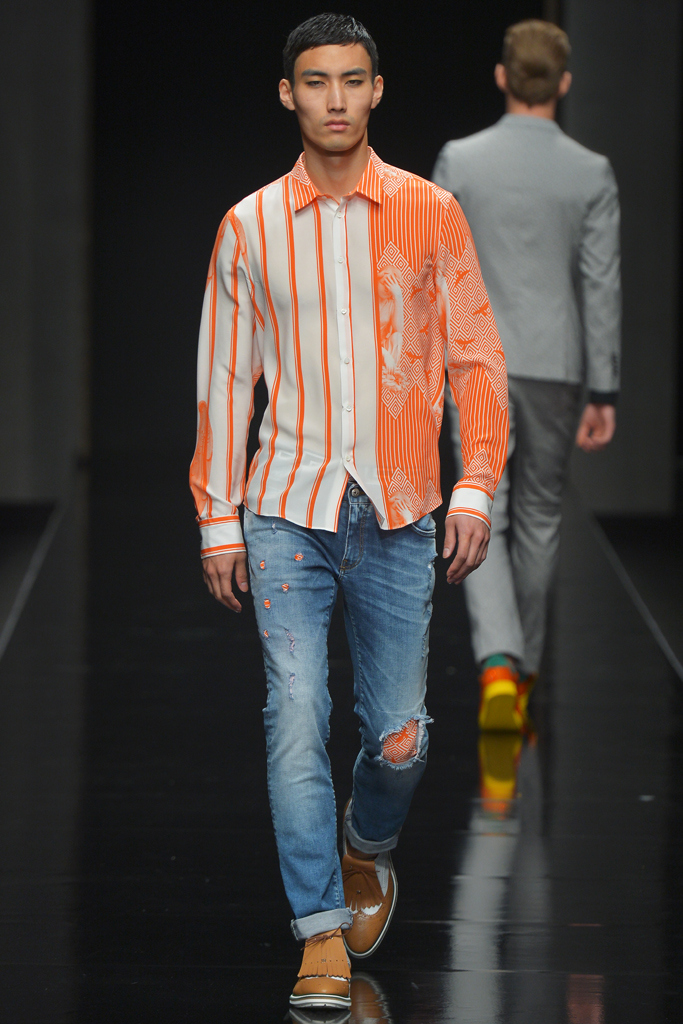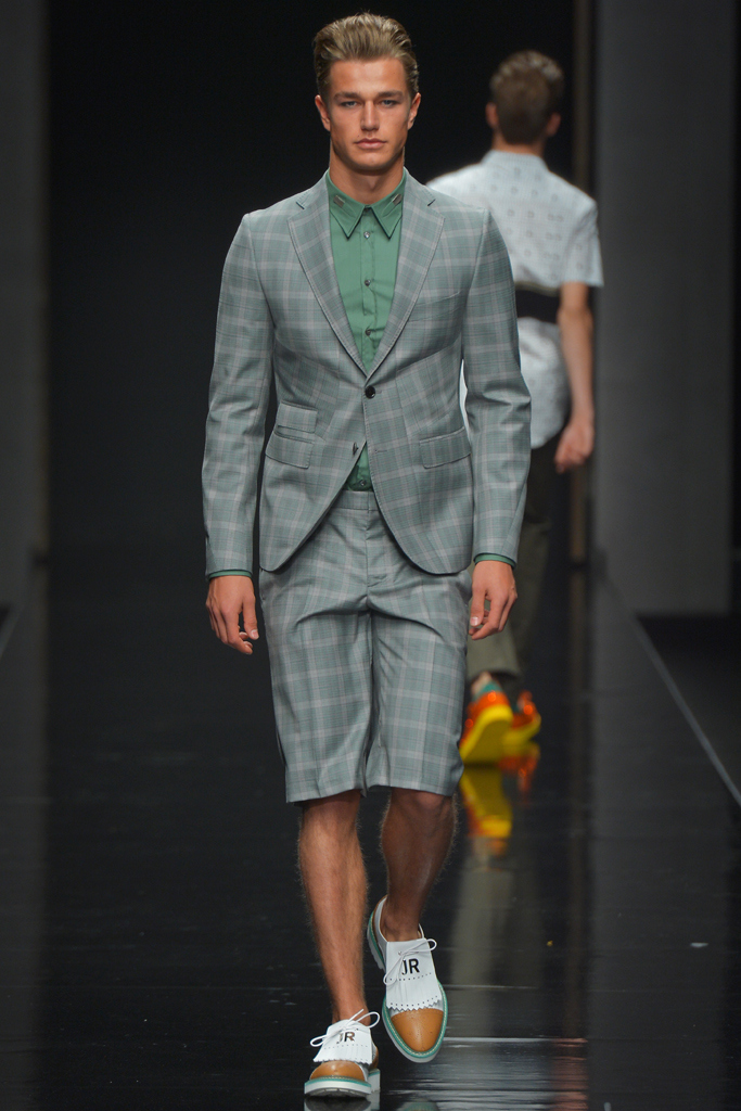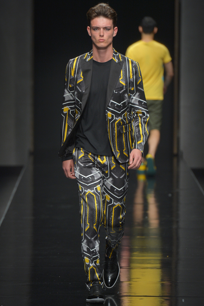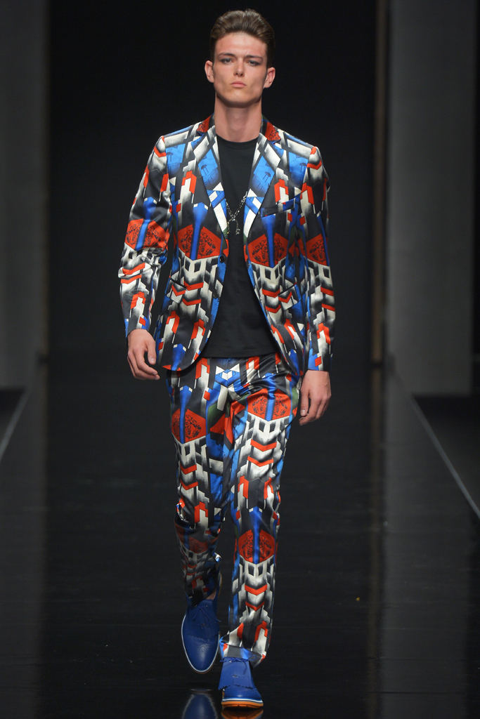 Sportswear pieces such as hooded zippered sweatshirts and roomy short pants were juxtaposed with tailored three-piece suits and embossed leather jackets paired with distressed denim. The most convincing results came when Richmond kept things simple: For instance, when he matched crisp, printed shirts with plain slim cotton trousers.