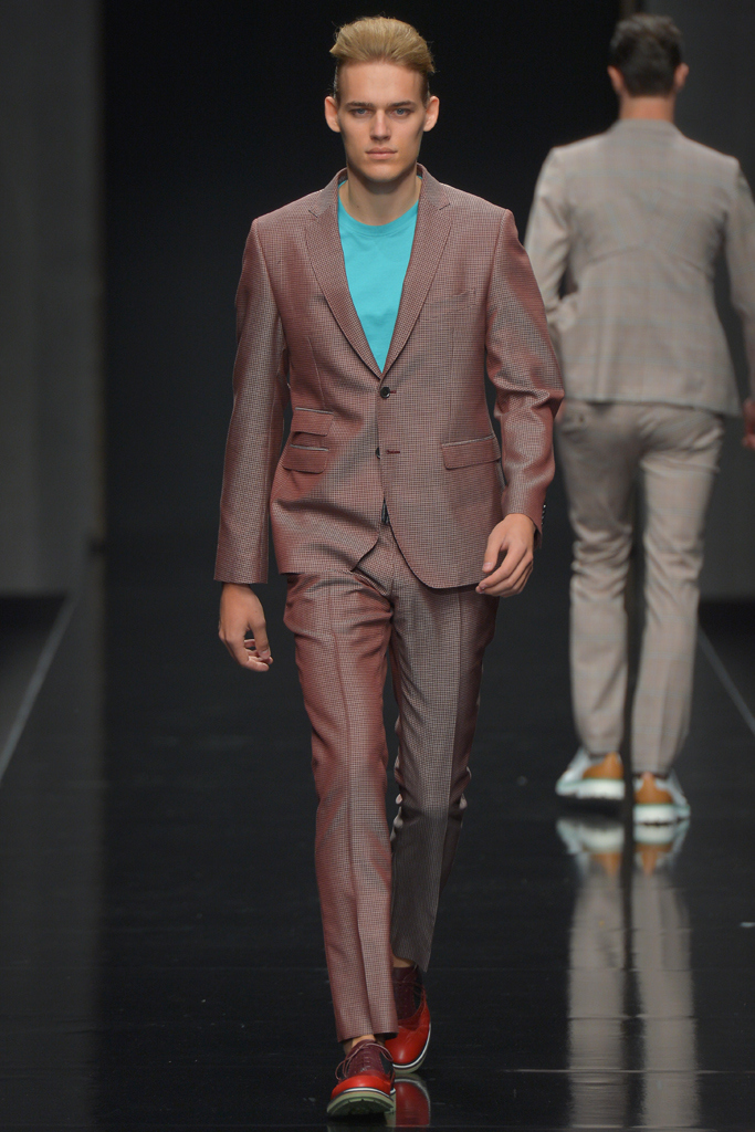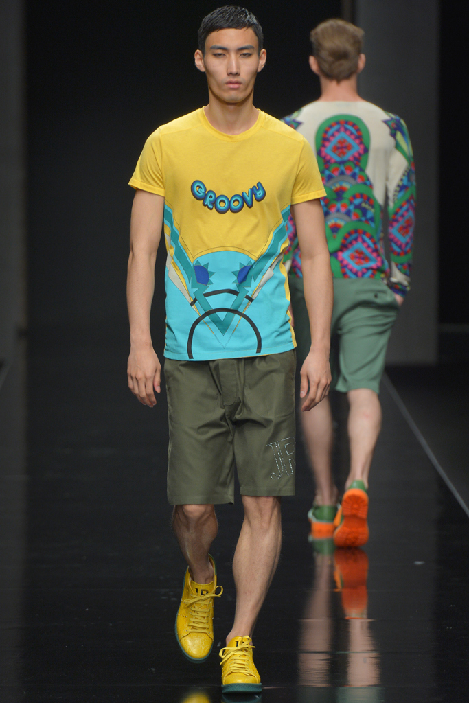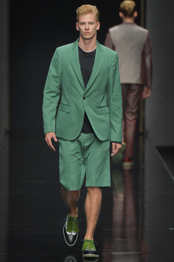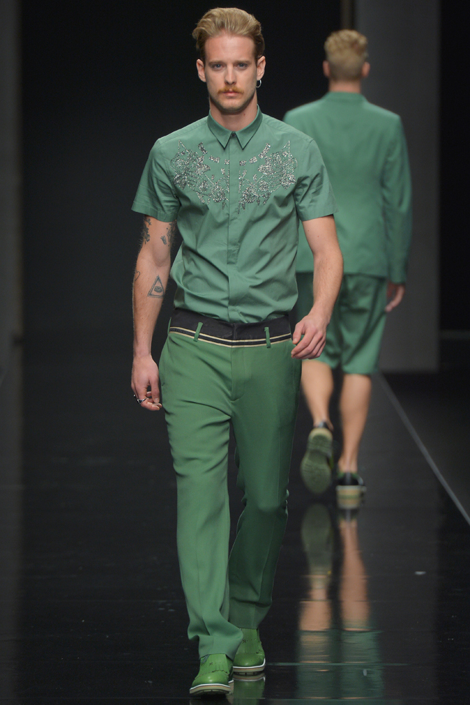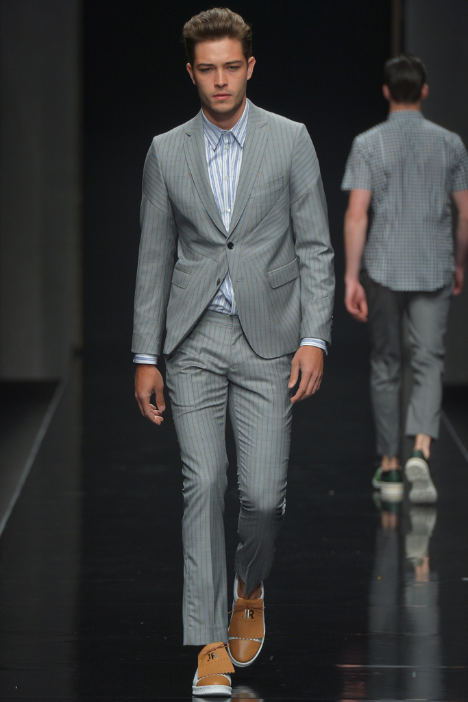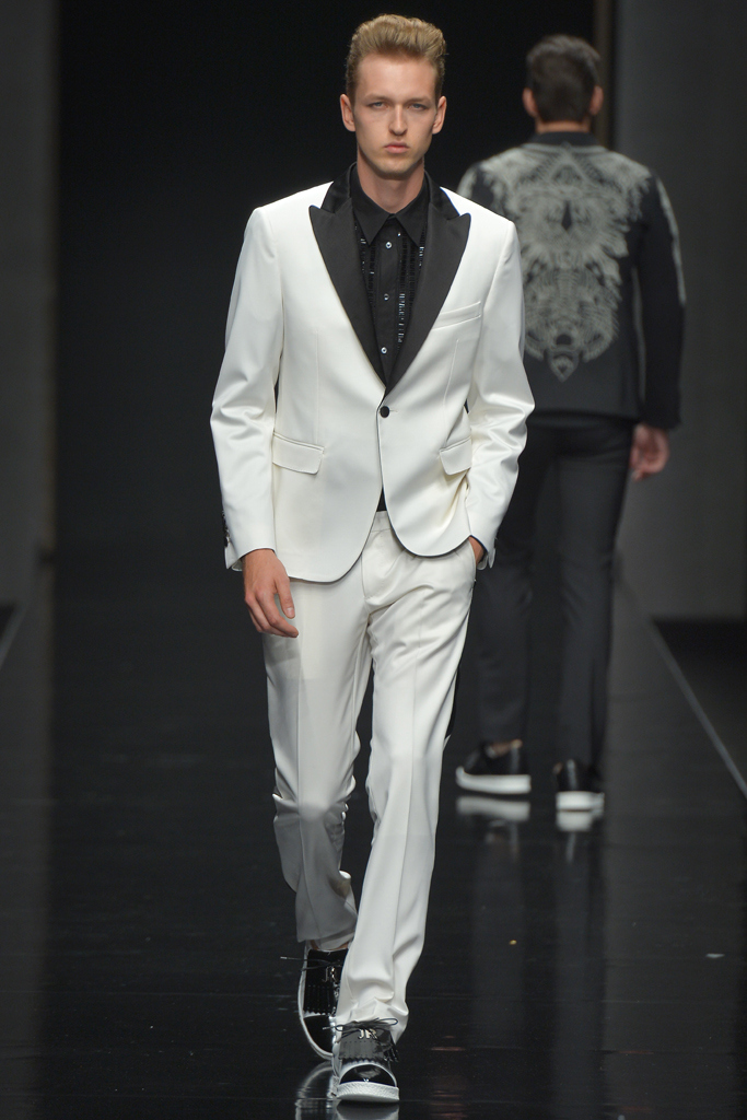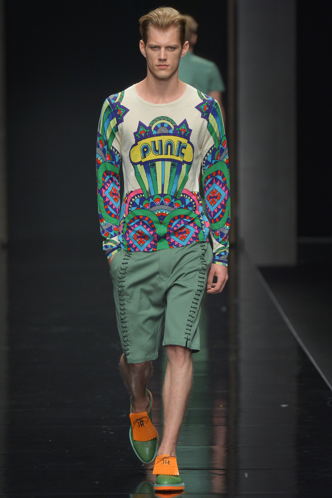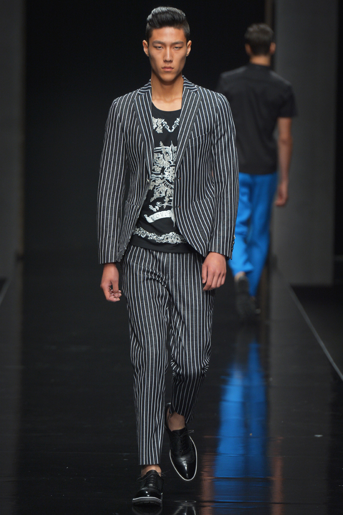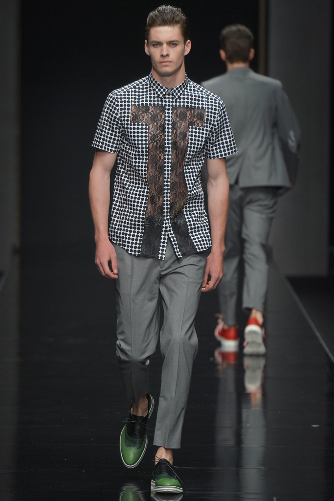 Sportswear pieces such as hooded zippered sweatshirts and roomy short pants were juxtaposed with tailored three-piece suits and embossed leather jackets paired with distressed denim. The most convincing results came when Richmond kept things simple: For instance, when he matched crisp, printed shirts with plain slim cotton trousers.