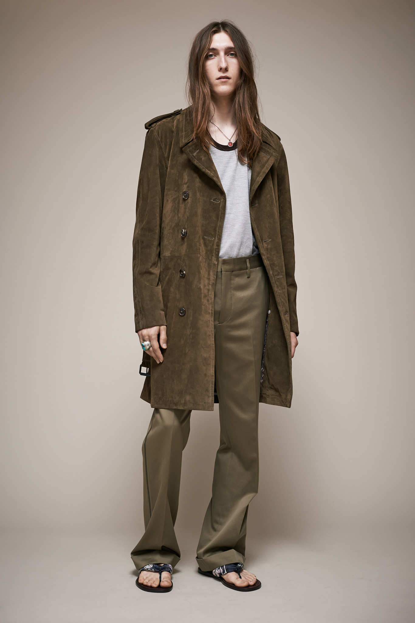 Marc Jacobs menswear designer Karl Aberg does not seem the kind of fellow to relish rush. Certainly when it comes to integrating the as-of-March defunct Marc by Marc Jacobs into this mainline collection, he’s decisively chilled. “Gradually we are going to encompass more, I think, stretching it further,” he said: “I’m really excited about it because it’s fun product and real stuff that’s maybe a bit less precious, which is a good thing.” Precious? This Marc Jacobs collection? Well, certainly, if you’re concerned with the materials. Hammered cream velvet slacks and jackets with sweatpants-style overlock stitching and a hefty break gleamed in the light like moonstone. Ringer tees and tank tops came in a fine-gauge cashmere, an opaque argyle tank in an alpaca mix, and its long-sleeved cousin in a silk and Lurex mix, “for a little tinsel.” Piped pajama tops both short-sleeved and long were dappled with chinoiserie blossoms or served up in a gray check silk mix treated to have a rice-papery crunch. The baddest boys in the room were the single-button, shawl-collar, kimono-cum-evening jackets that you could imagine l’homme Jacobean wearing not only to the Met Ball or some such palaver, but out back by the pool over budgie-smugglers and slides.