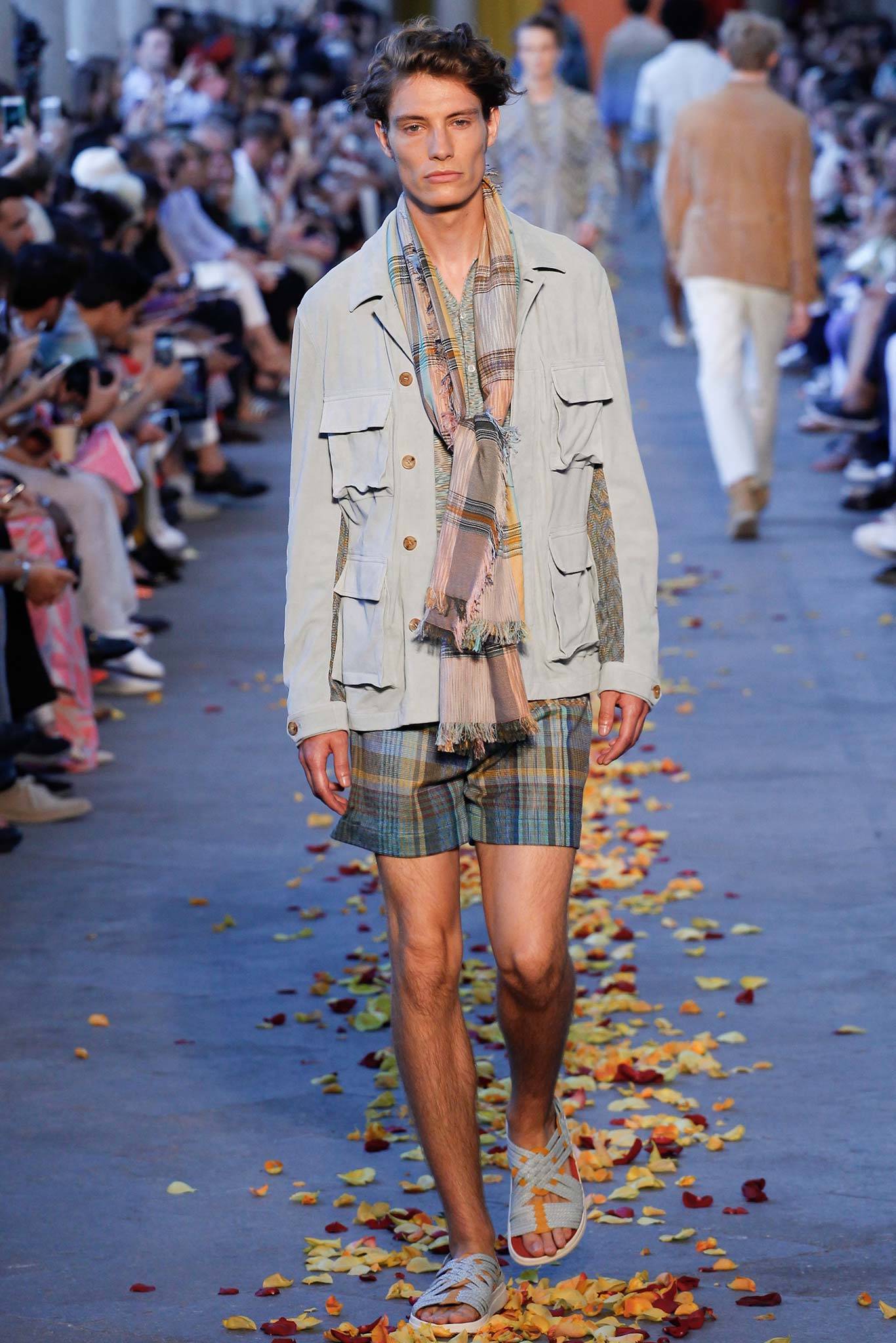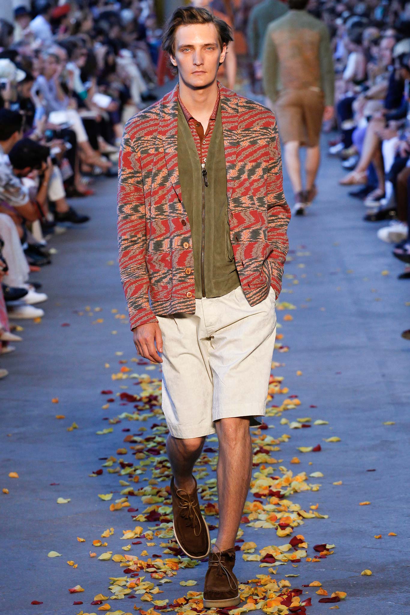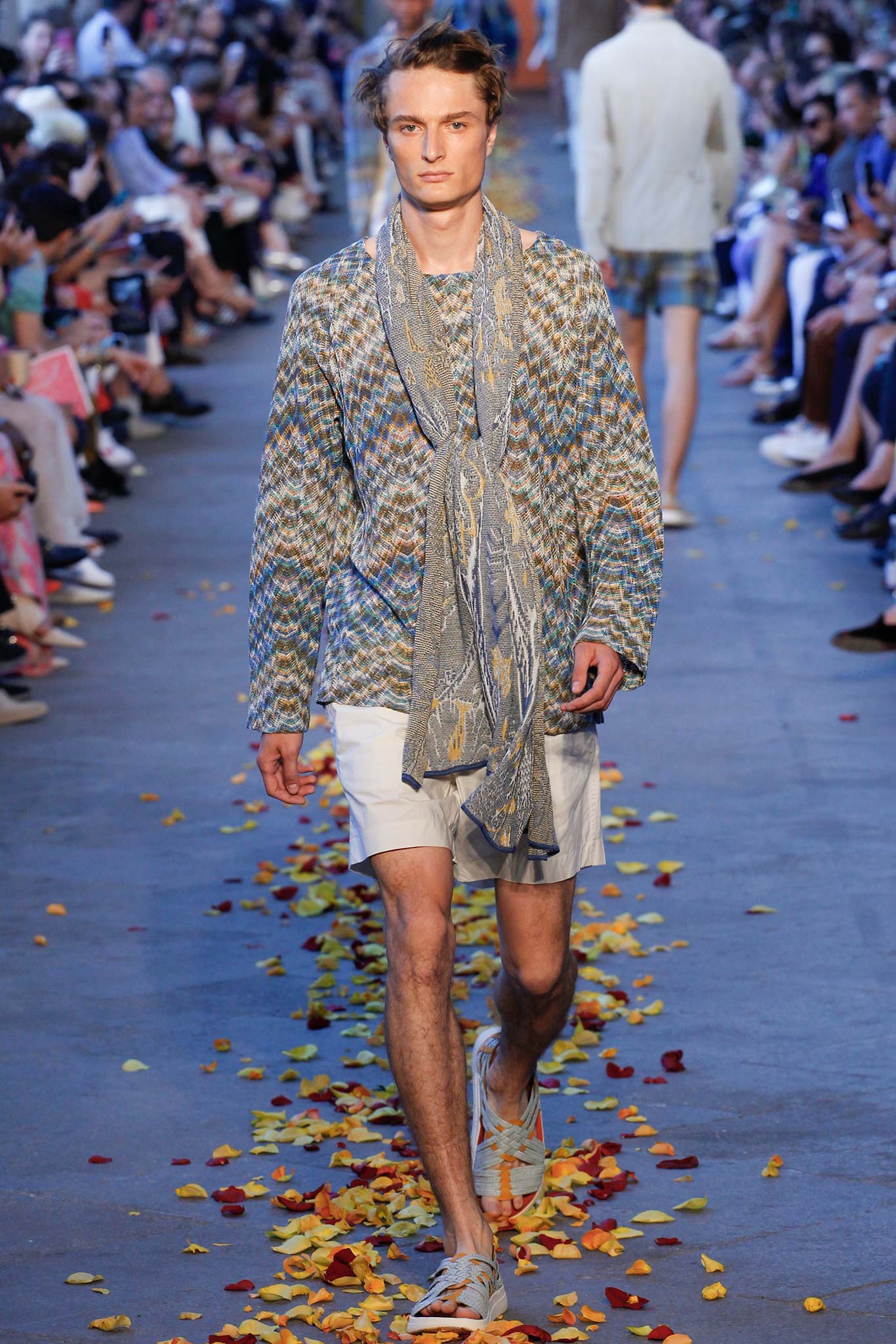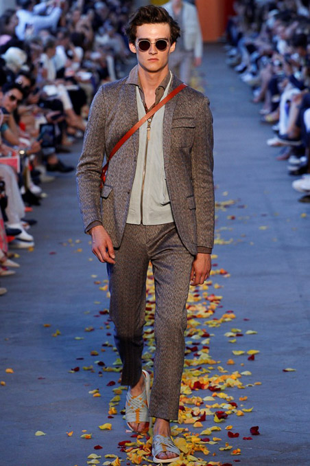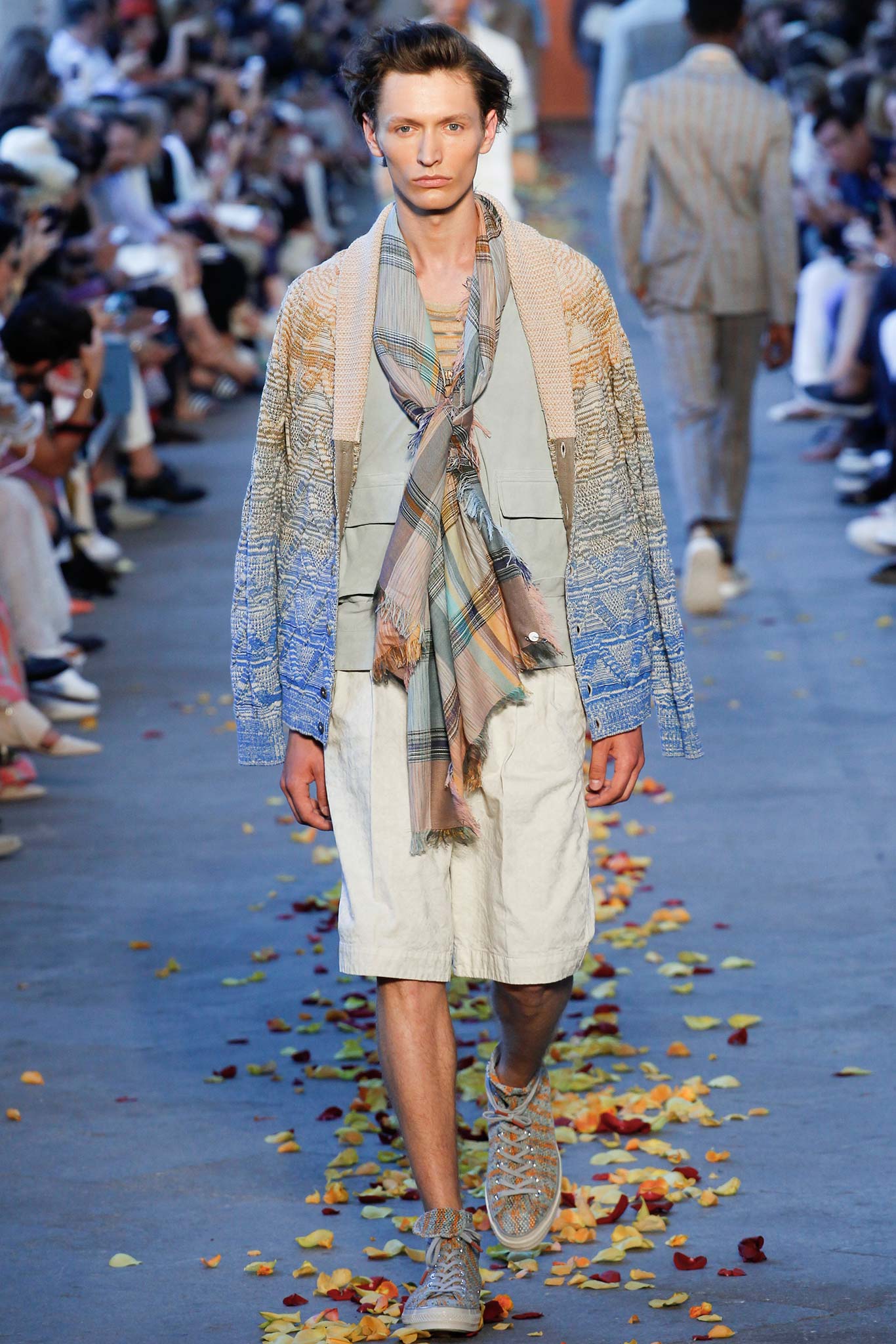 Taking cues from Indian textile masters, the designer created pretty patchwork cardigans with shawl collars, which models wore nonchalantly slung over their shoulders as they trod a catwalk strewn with red, orange and yellow rose petals. The patchwork notion continued on laid-back tunic shirts, incorporating both cotton and space-dyed knits, which Missoni paired with madras-patterned cargo shorts and thick summer scarves for a gentlemanly, mellow feel.