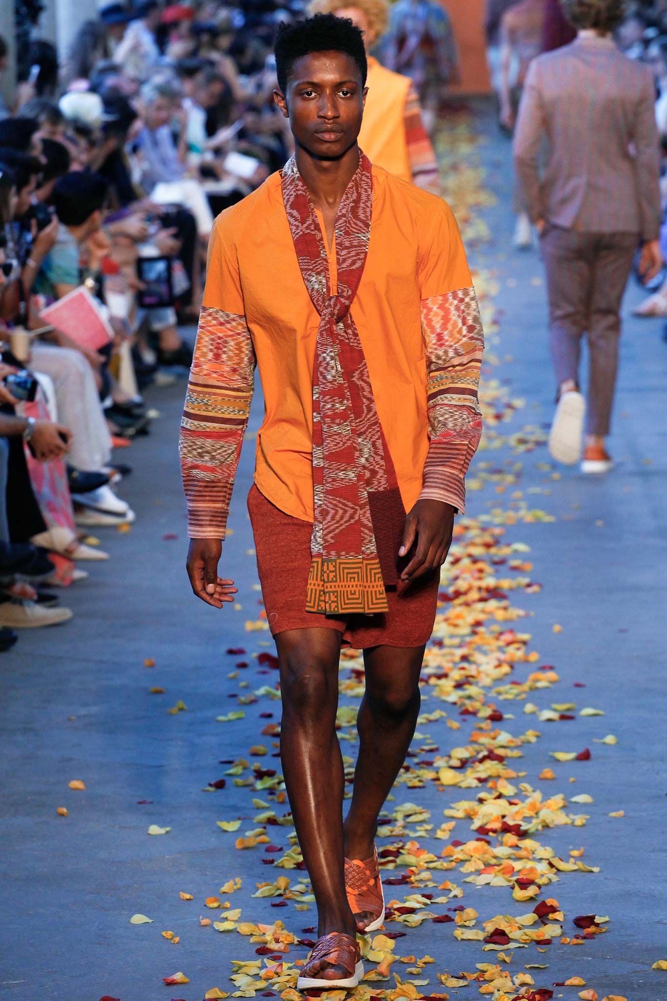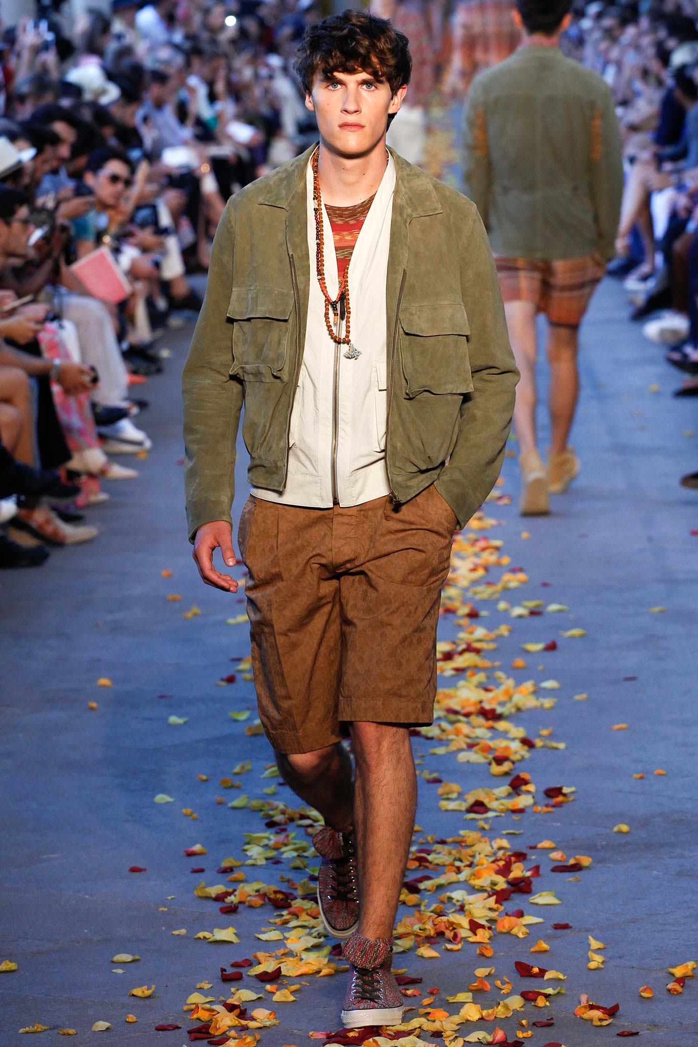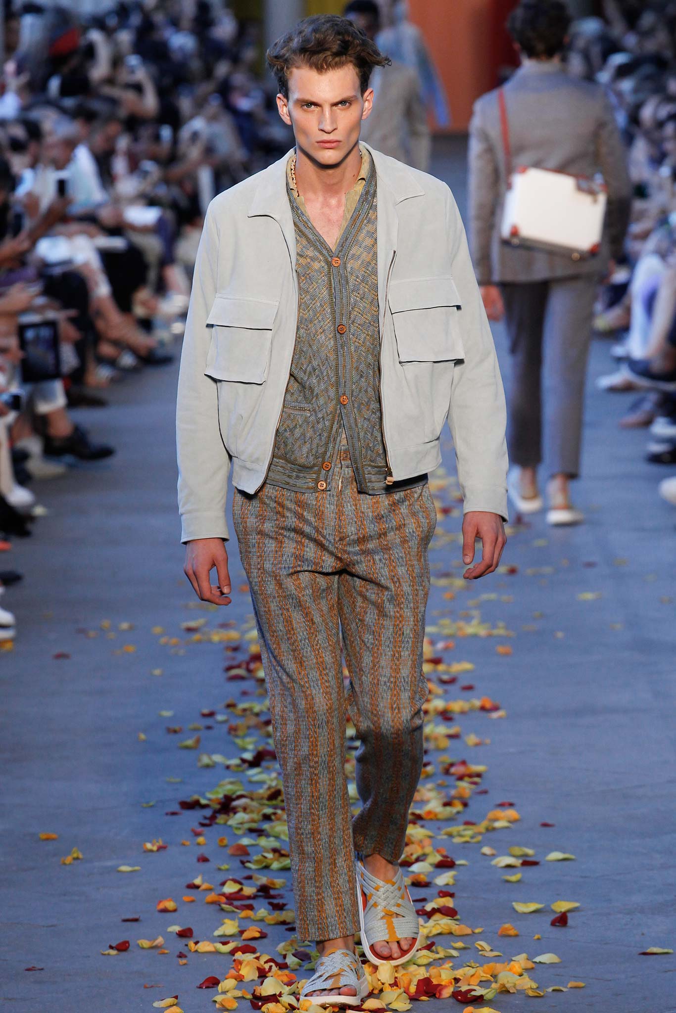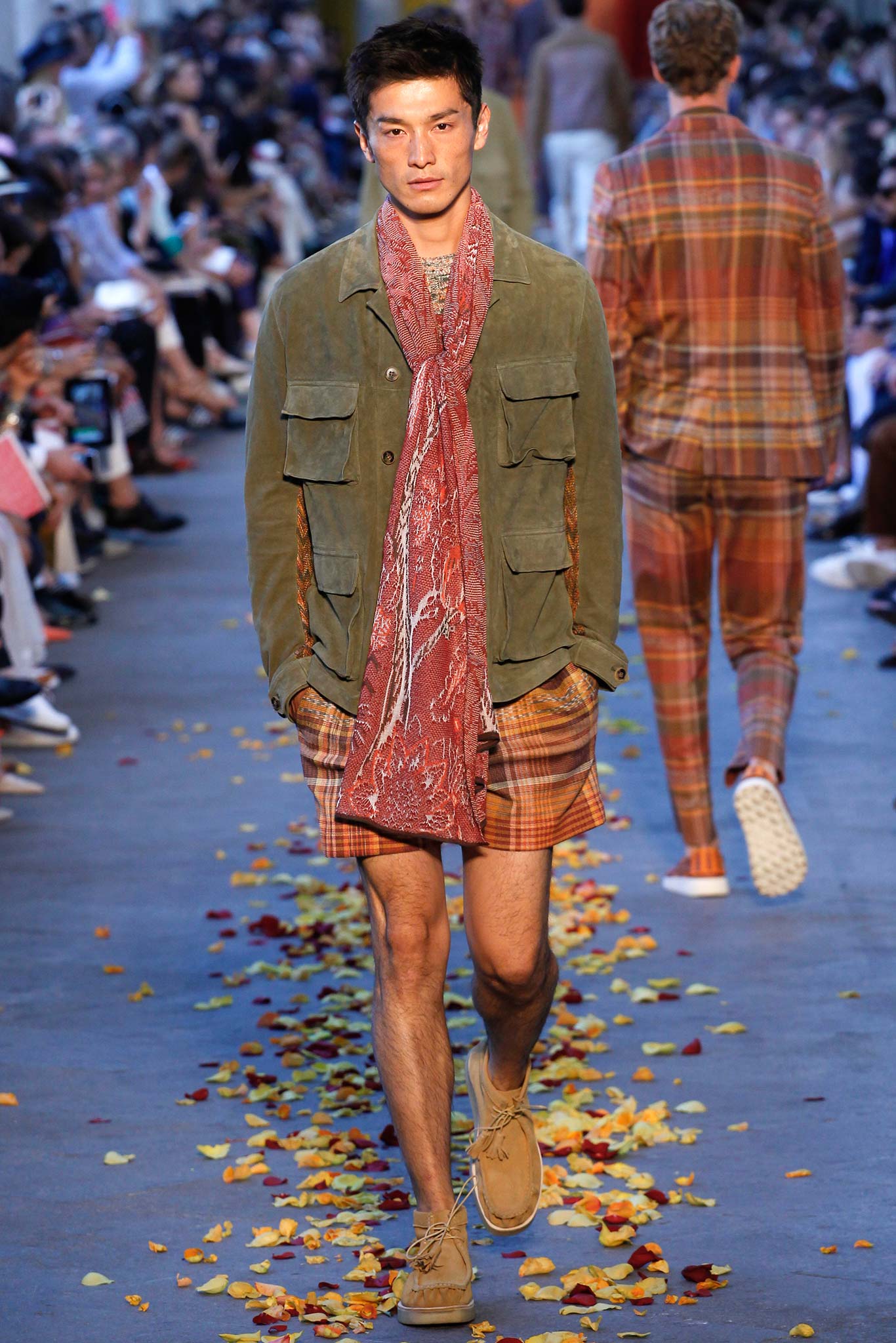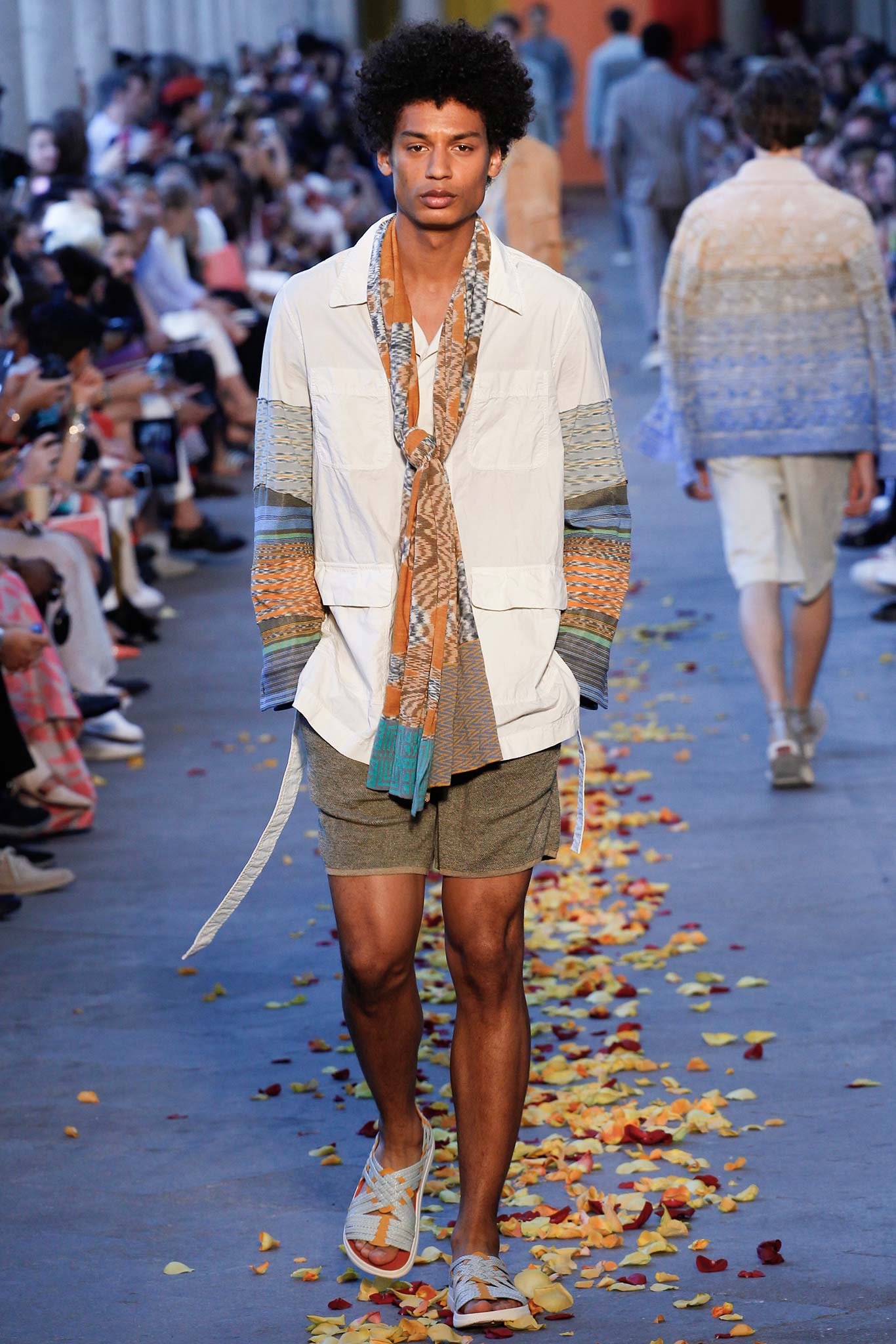 Taking cues from Indian textile masters, the designer created pretty patchwork cardigans with shawl collars, which models wore nonchalantly slung over their shoulders as they trod a catwalk strewn with red, orange and yellow rose petals. The patchwork notion continued on laid-back tunic shirts, incorporating both cotton and space-dyed knits, which Missoni paired with madras-patterned cargo shorts and thick summer scarves for a gentlemanly, mellow feel.