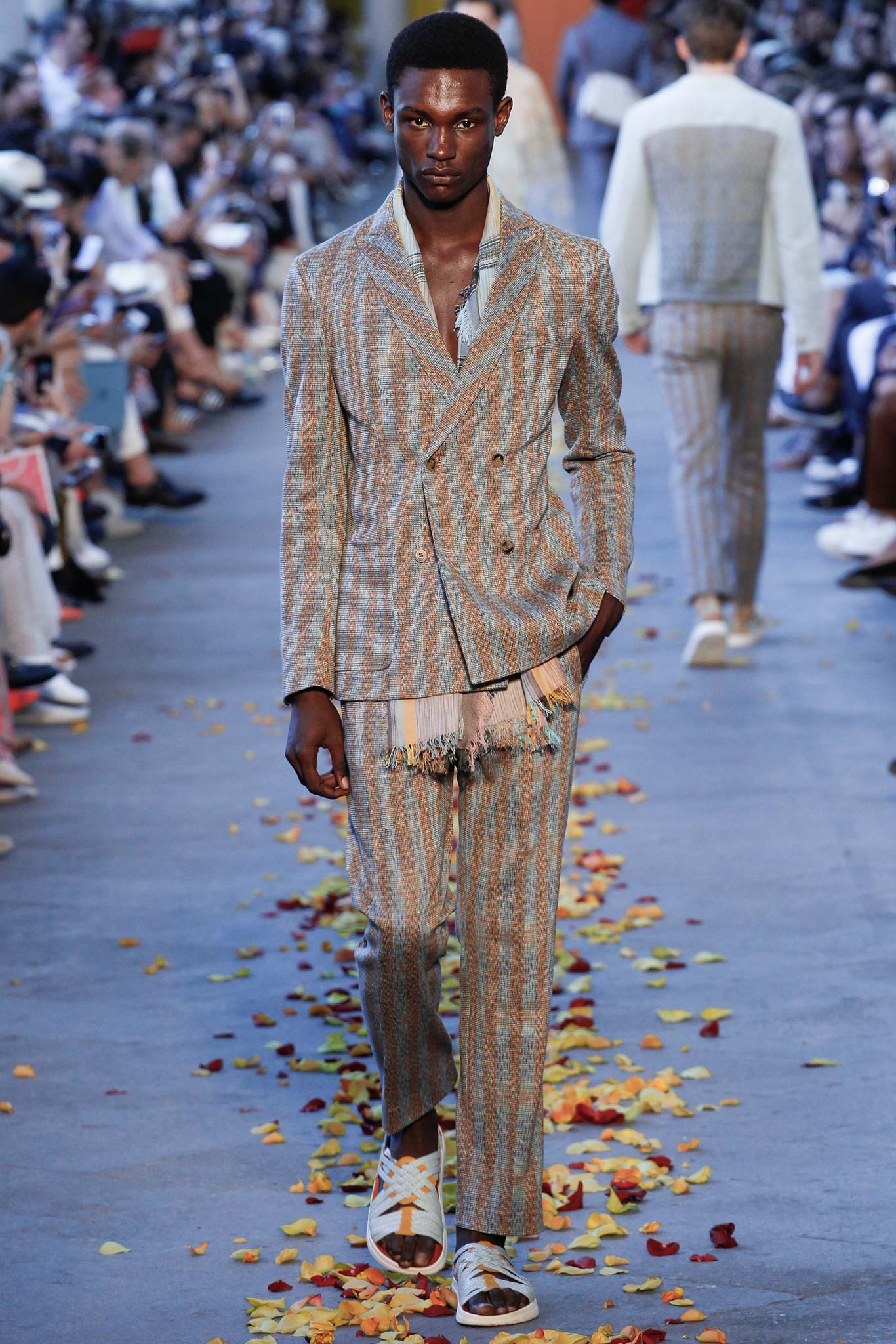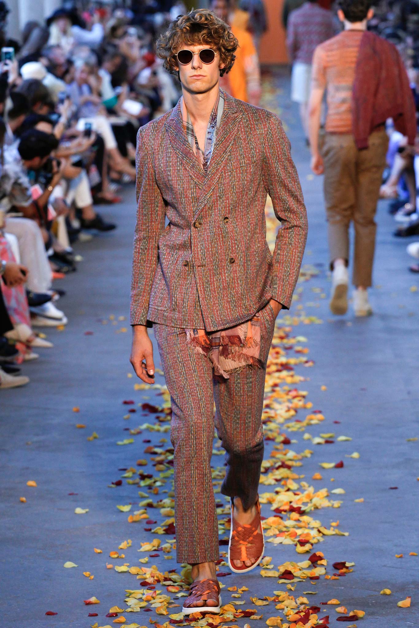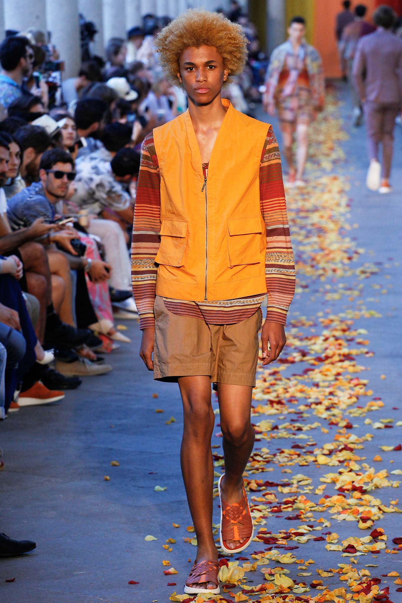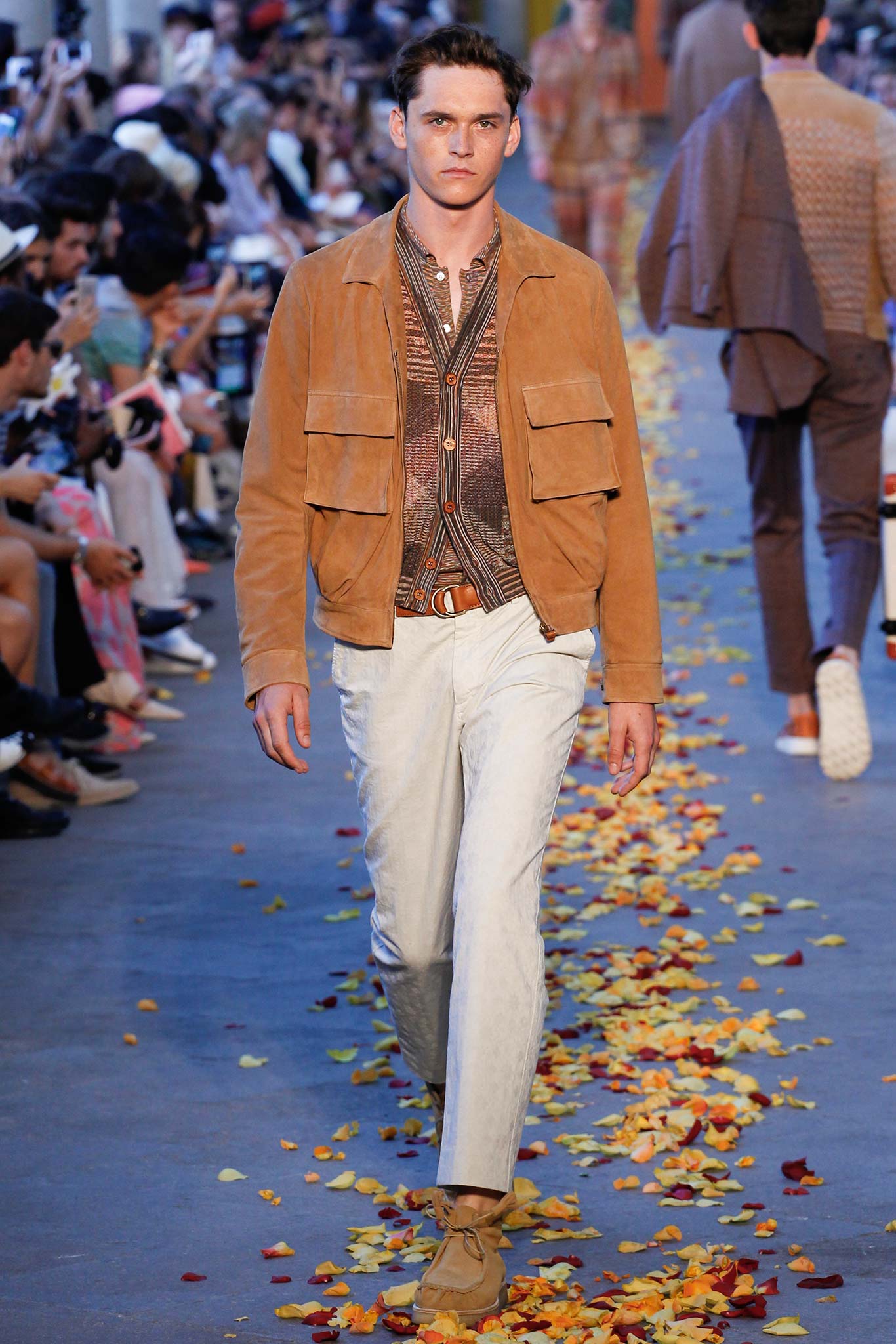 Taking cues from Indian textile masters, the designer created pretty patchwork cardigans with shawl collars, which models wore nonchalantly slung over their shoulders as they trod a catwalk strewn with red, orange and yellow rose petals. The patchwork notion continued on laid-back tunic shirts, incorporating both cotton and space-dyed knits, which Missoni paired with madras-patterned cargo shorts and thick summer scarves for a gentlemanly, mellow feel.