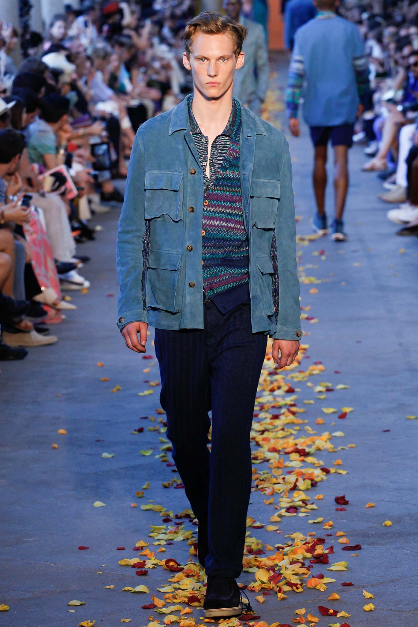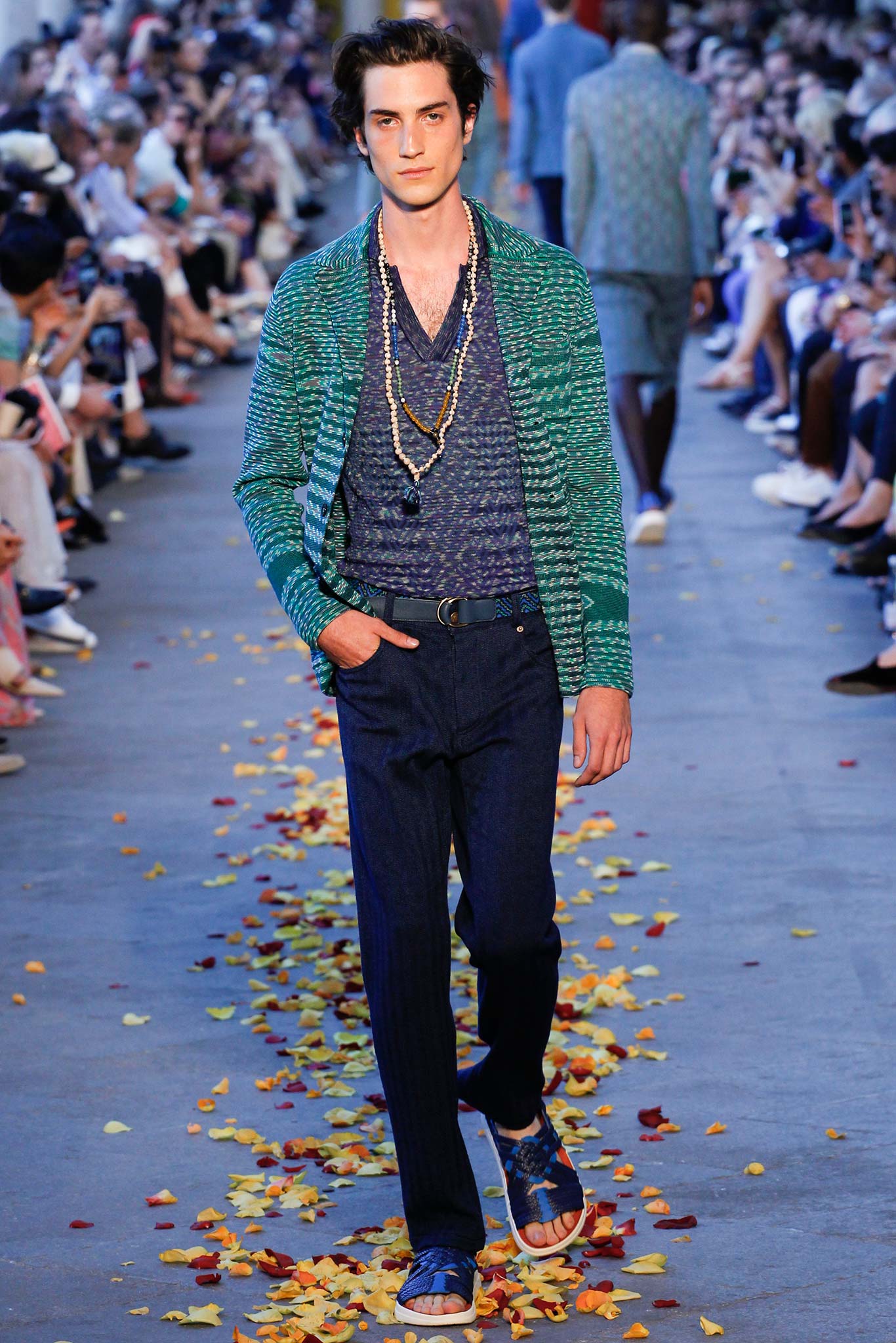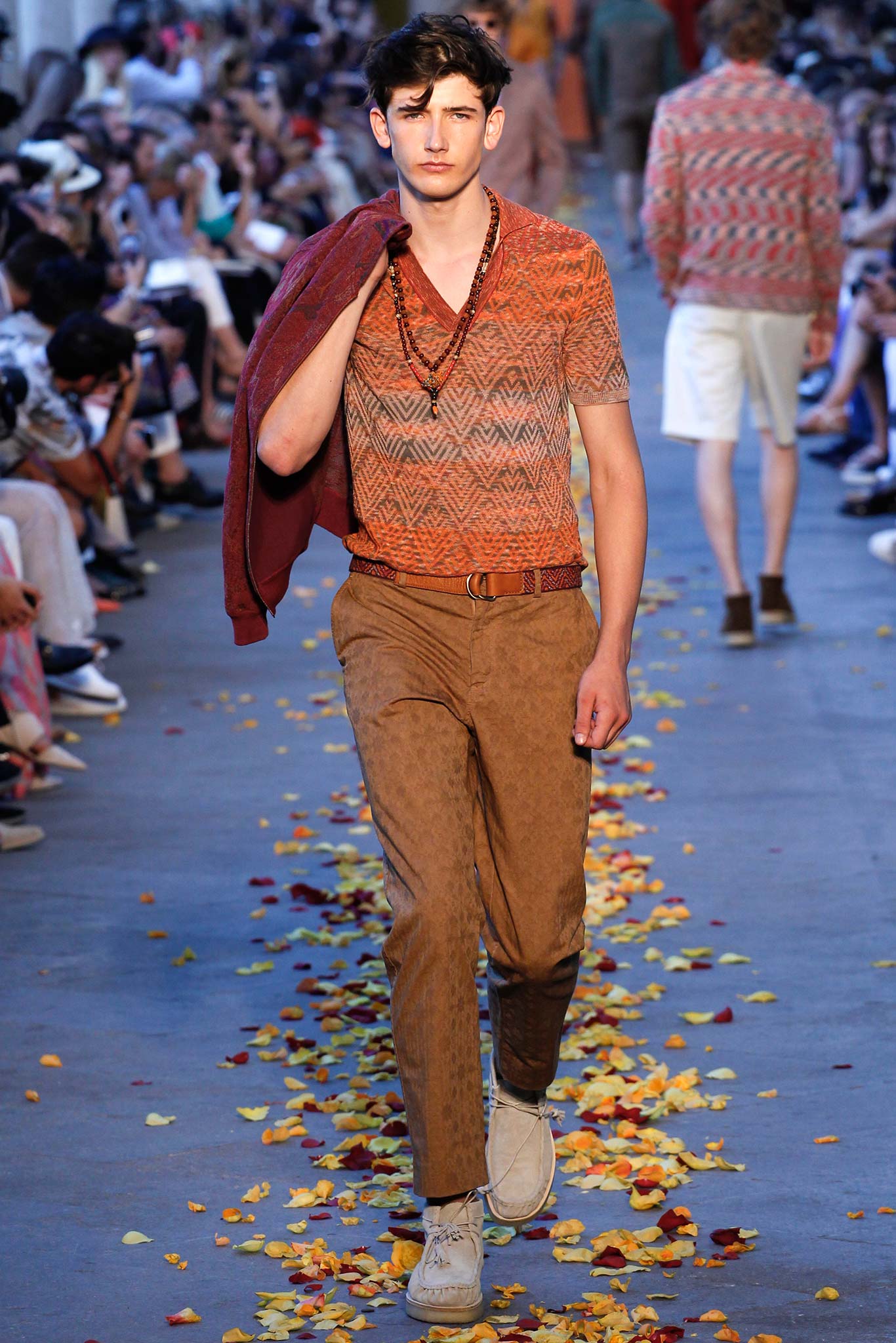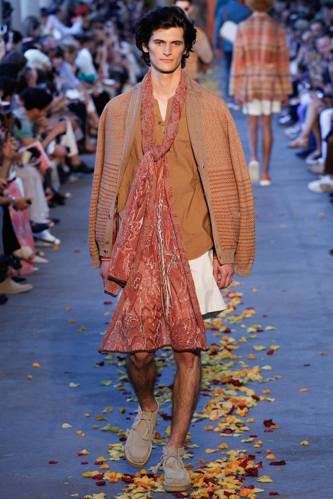 Taking cues from Indian textile masters, the designer created pretty patchwork cardigans with shawl collars, which models wore nonchalantly slung over their shoulders as they trod a catwalk strewn with red, orange and yellow rose petals. The patchwork notion continued on laid-back tunic shirts, incorporating both cotton and space-dyed knits, which Missoni paired with madras-patterned cargo shorts and thick summer scarves for a gentlemanly, mellow feel.