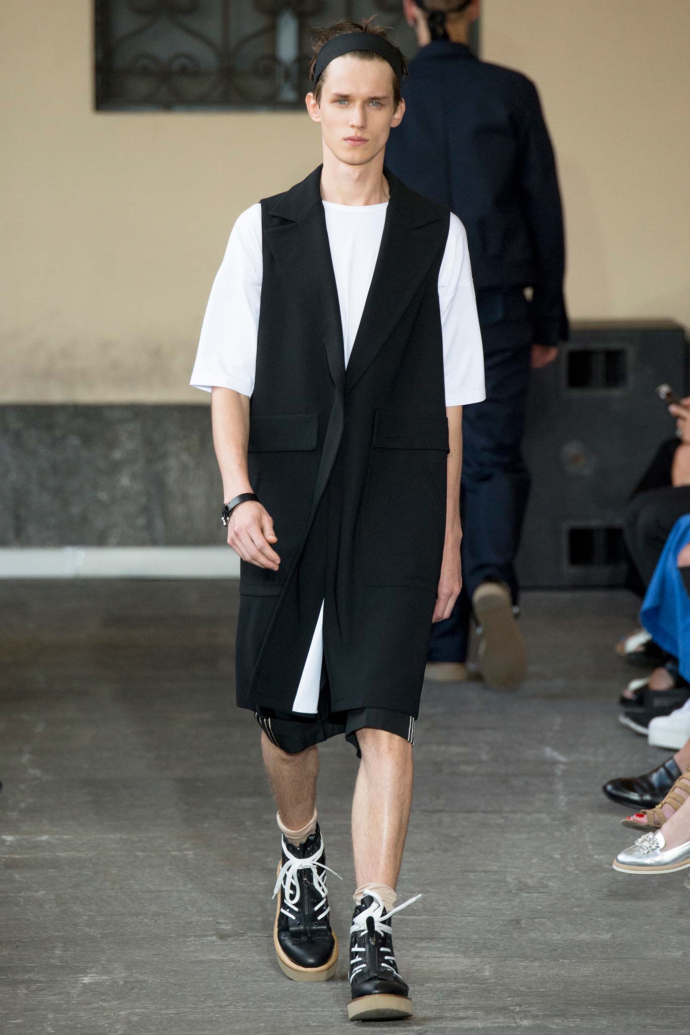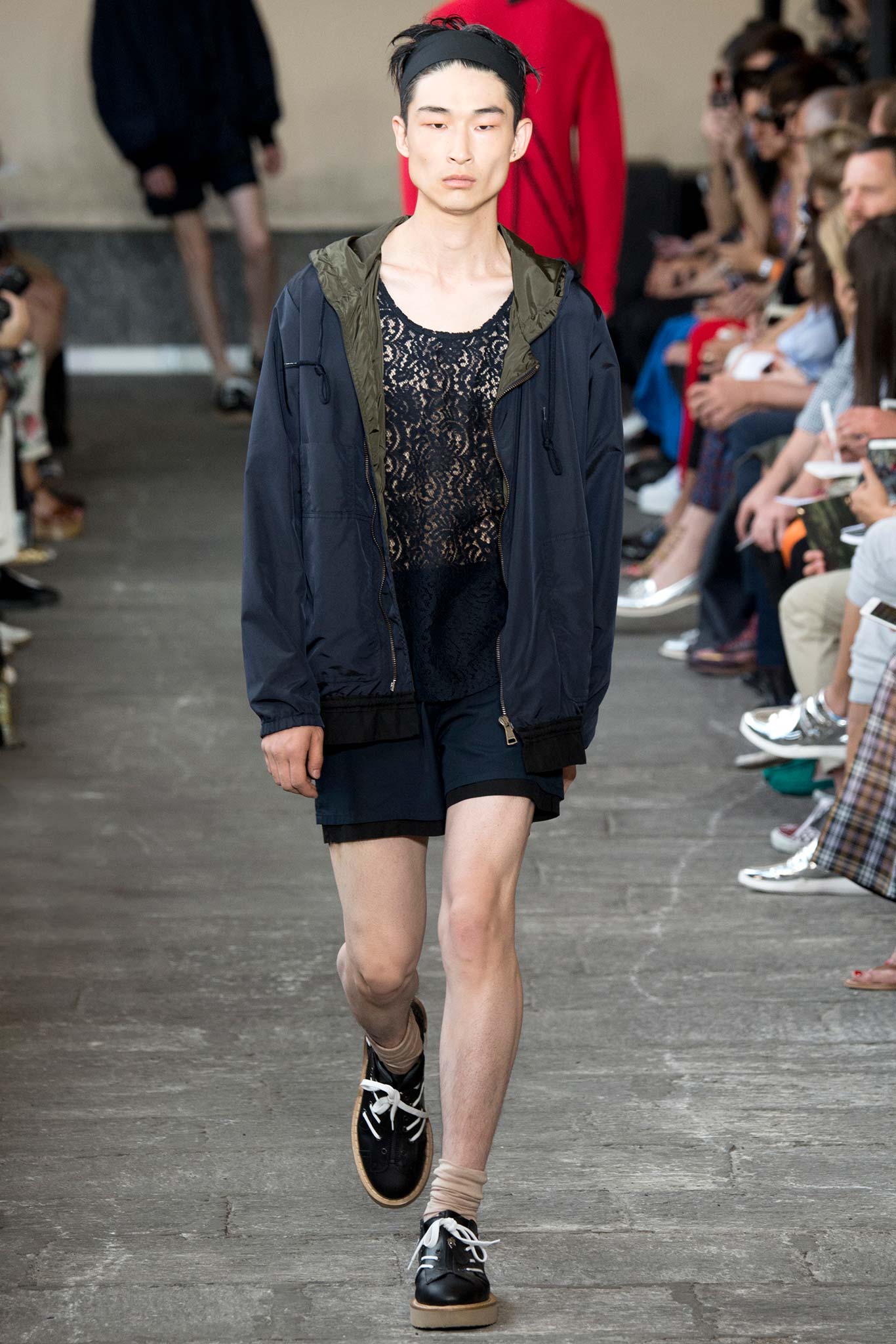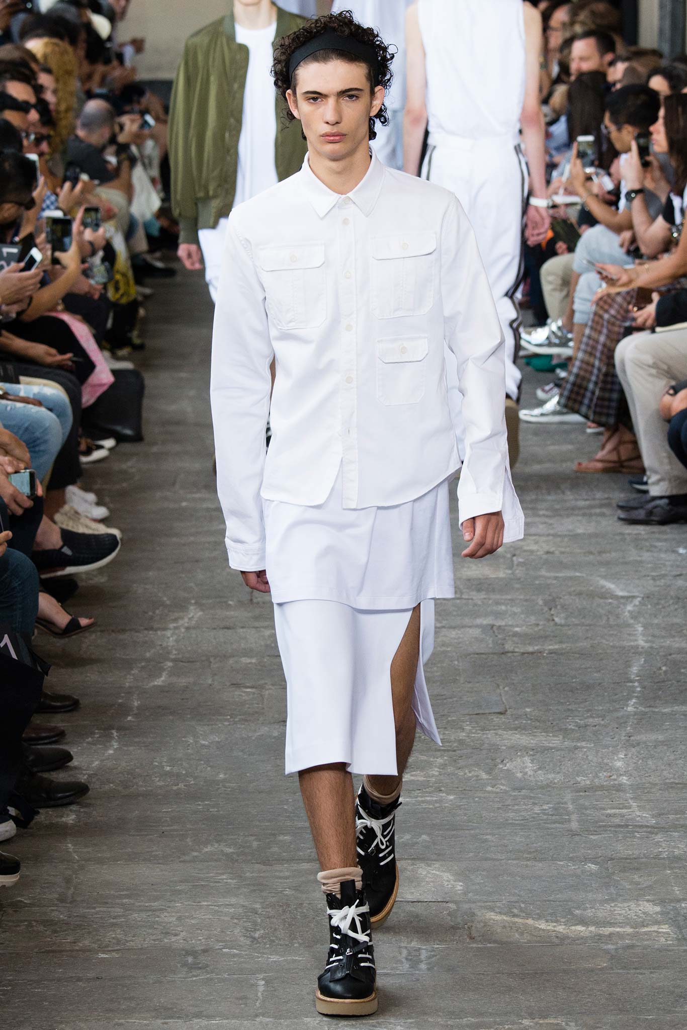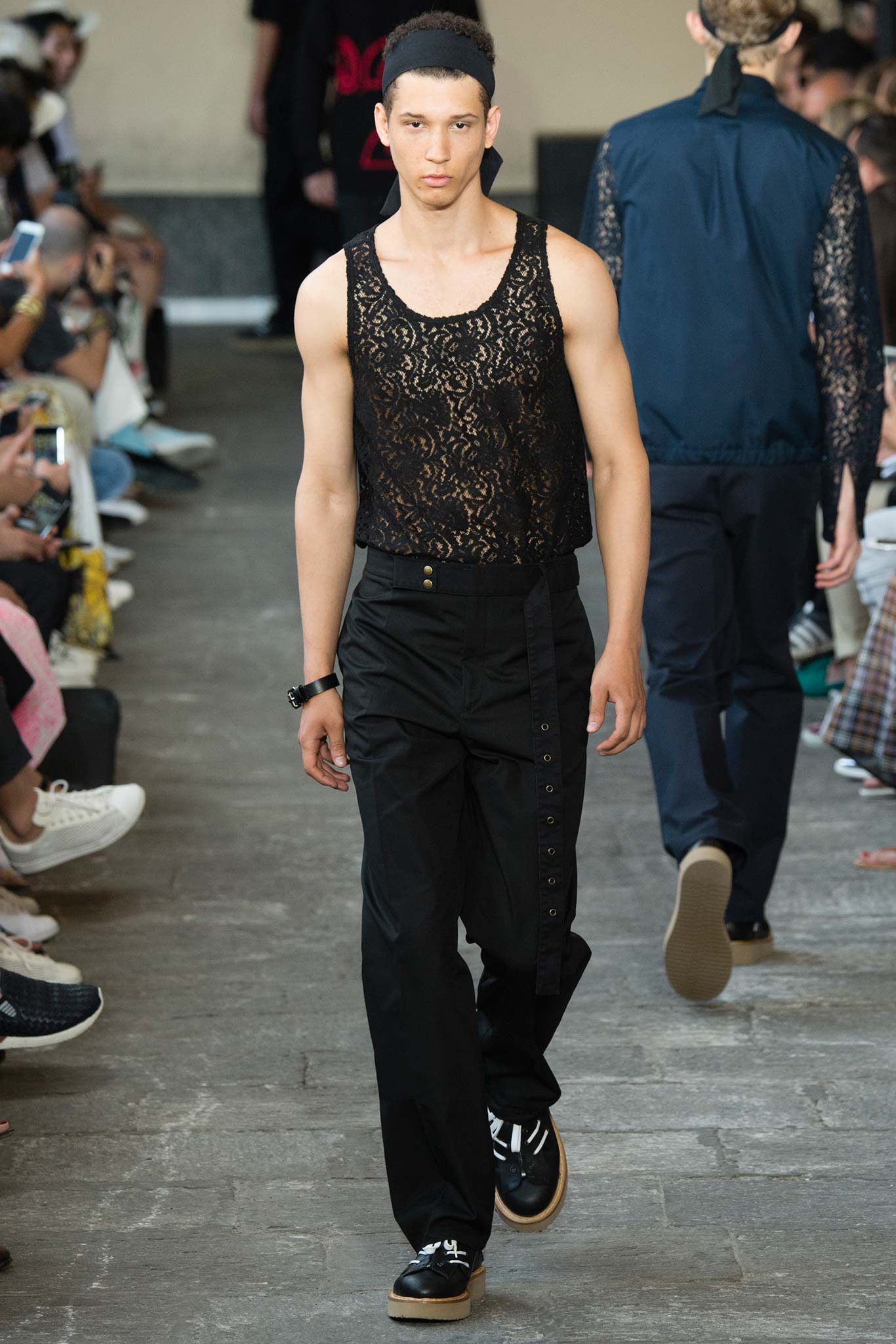 The collection was also an exercise in gender-bending, a key trend all over the London and Milan runways. The unisex theme was most apparent in a series of lace numbers, including tank tops and mix-media shirt-jackets, while on other occasions, slit skirts were worn under voluminous cardigans or were paired with elongated T-shirts and tone-on-tone workwear shirts. The layering provided a certain playfulness to the more minimalist No. 21 male.