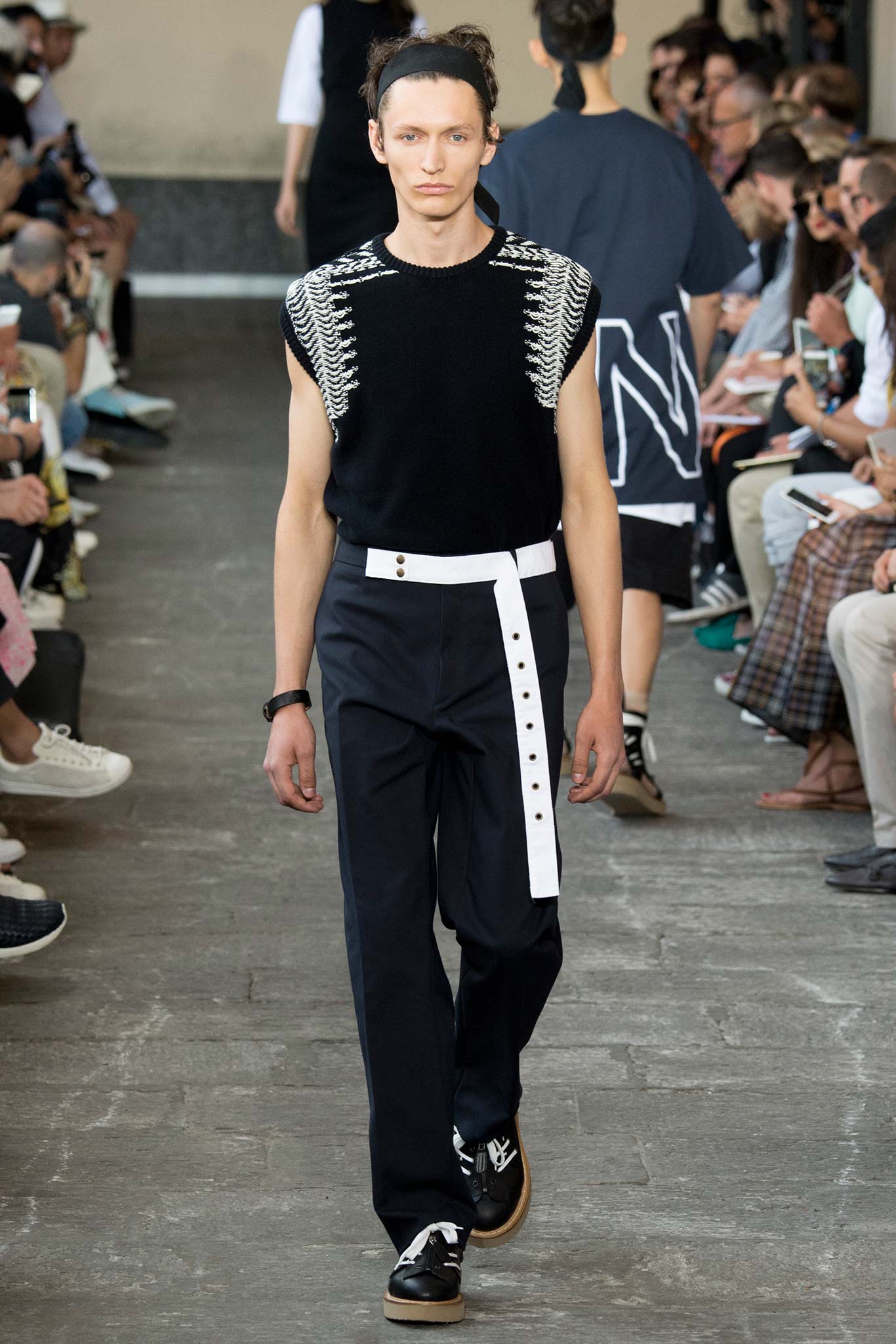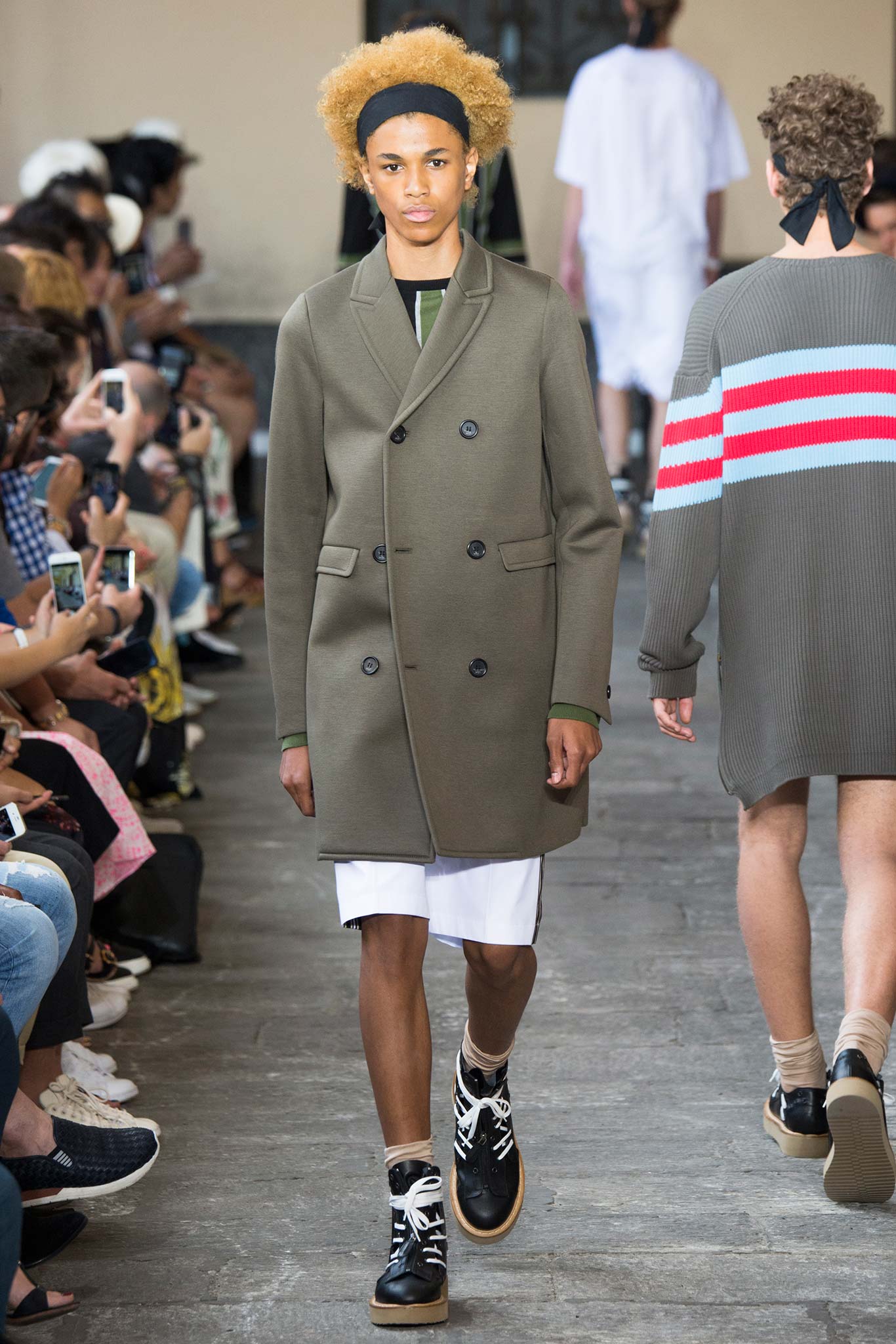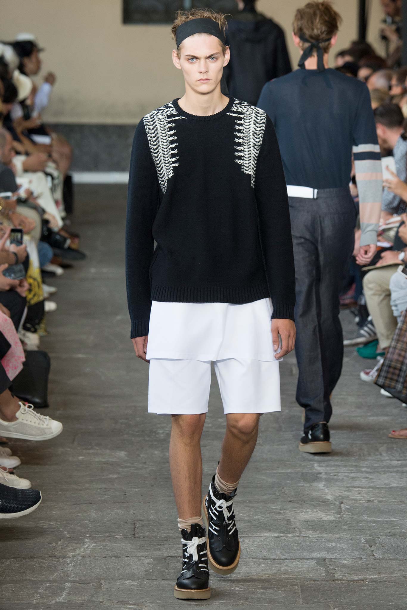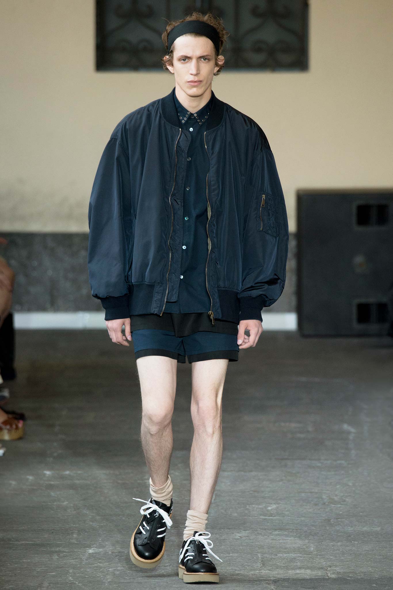 Long knitted sweaters came with a deliberately worn-out look. Belts hung down the sides of straight-leg, fuller pants, while oversize bombers were matched with baggy shorts, imbuing the lineup with a great deal of street appeal and an essentially youthful character.