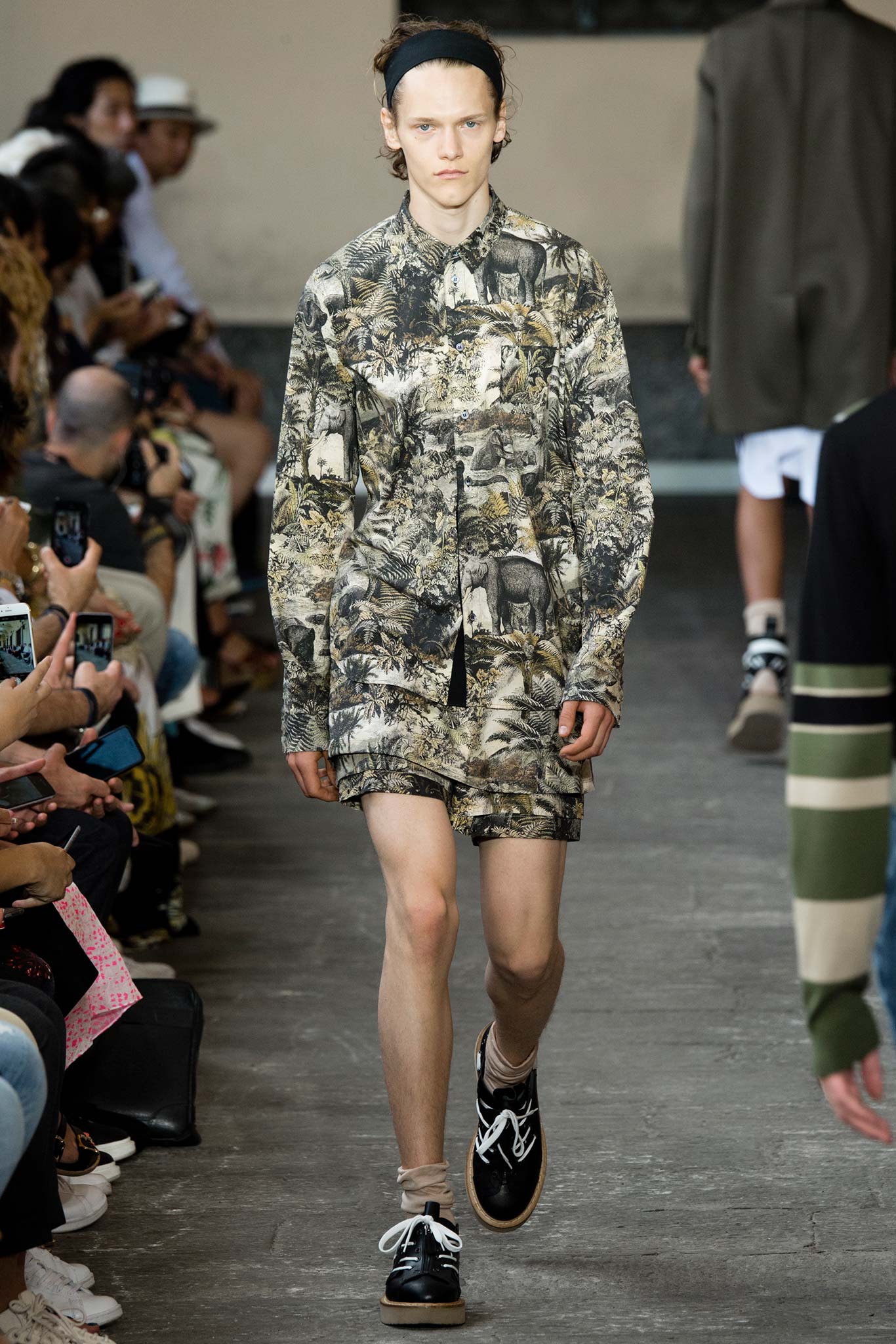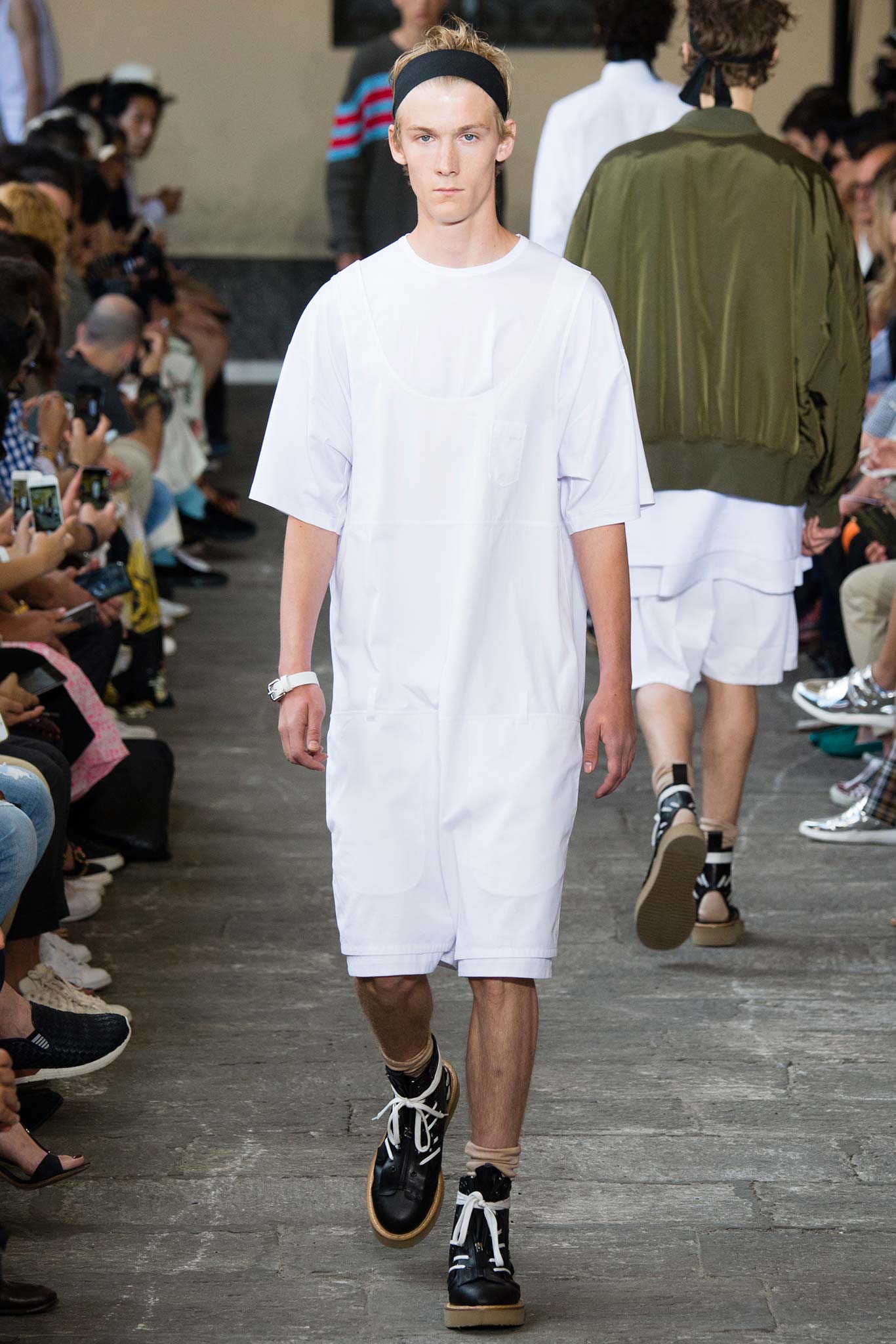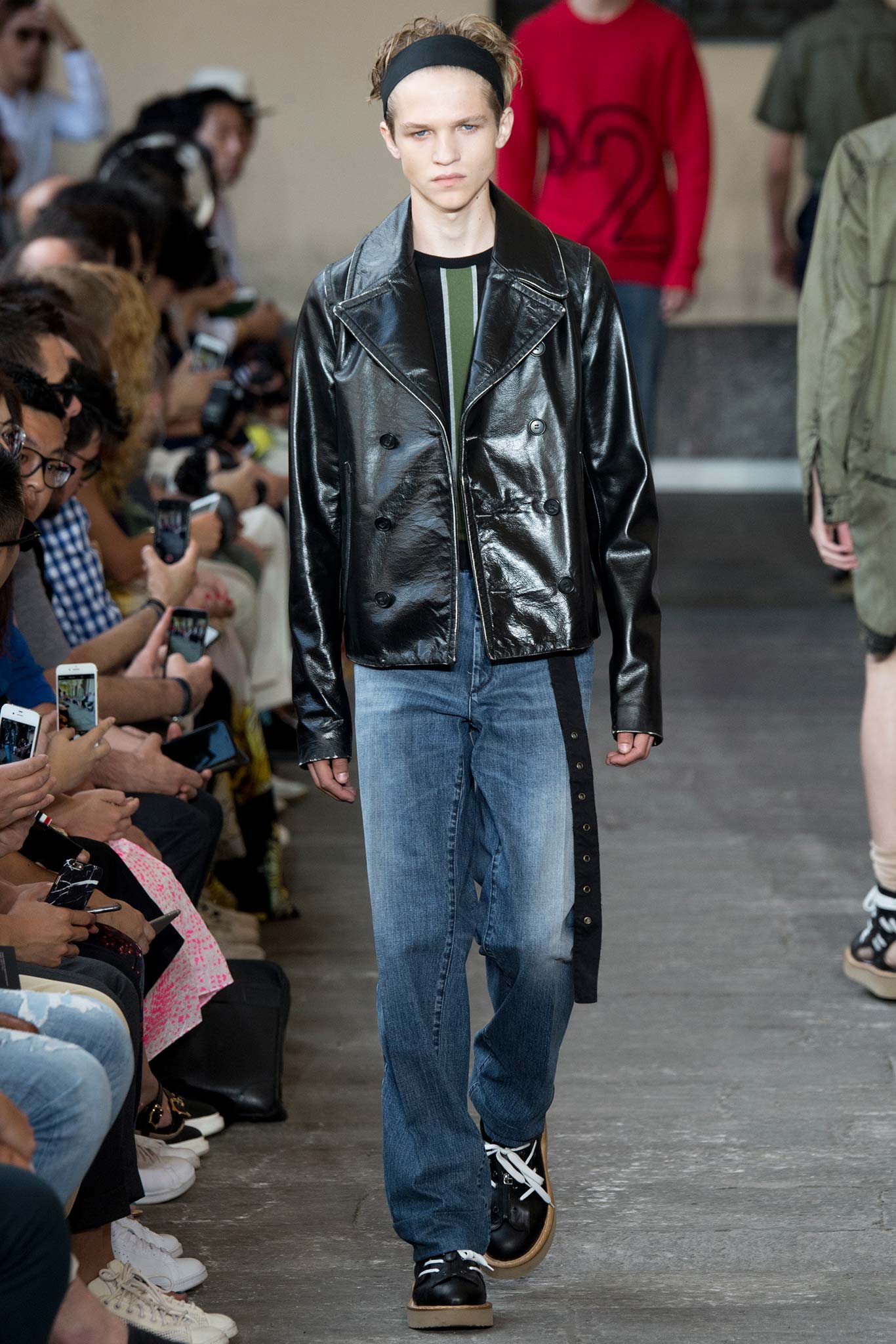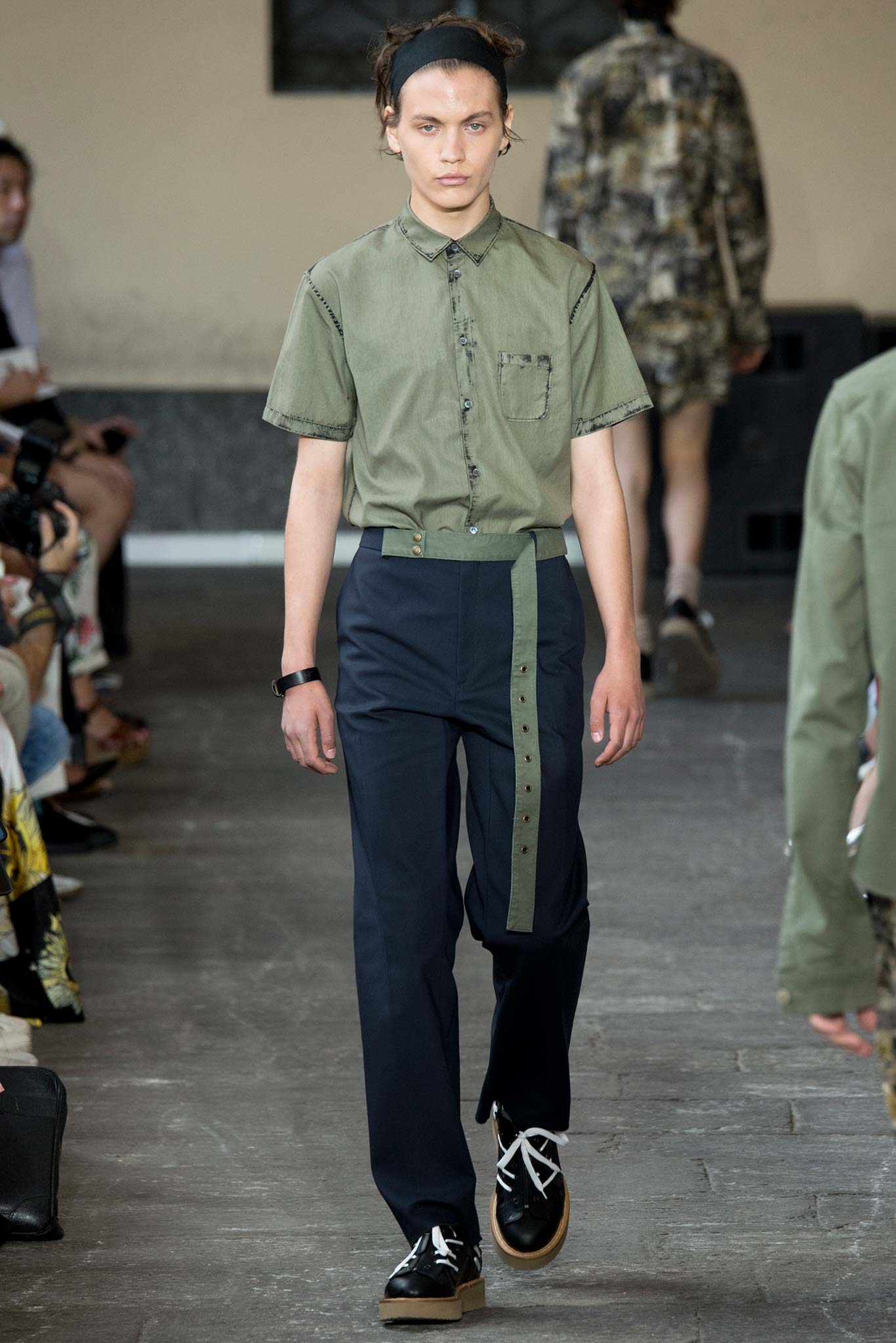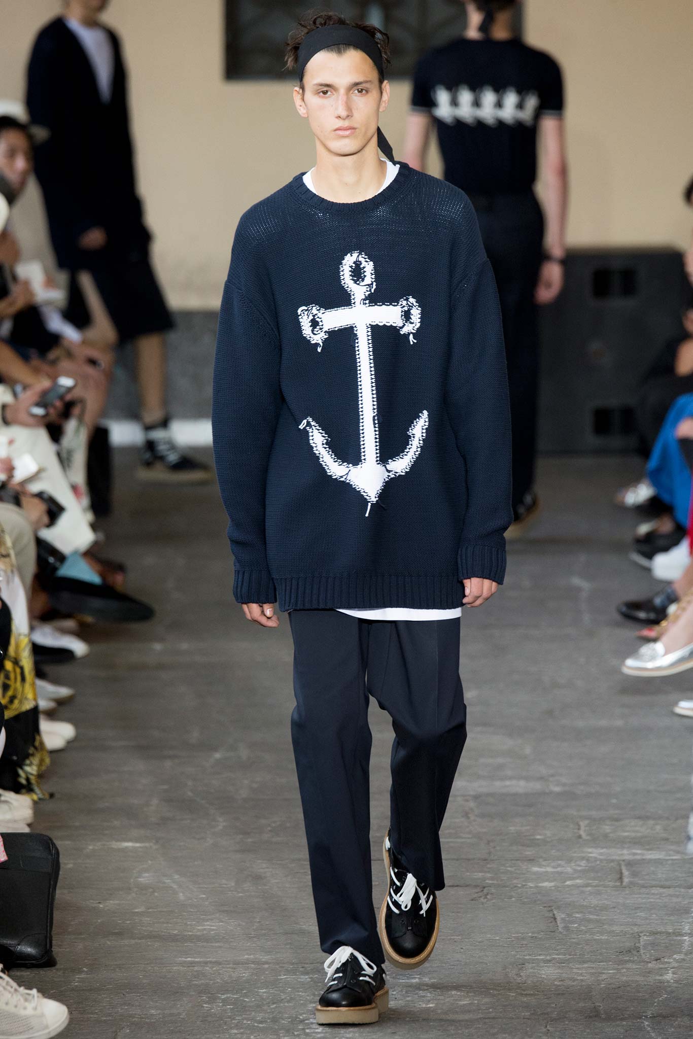 Long knitted sweaters came with a deliberately worn-out look. Belts hung down the sides of straight-leg, fuller pants, while oversize bombers were matched with baggy shorts, imbuing the lineup with a great deal of street appeal and an essentially youthful character.