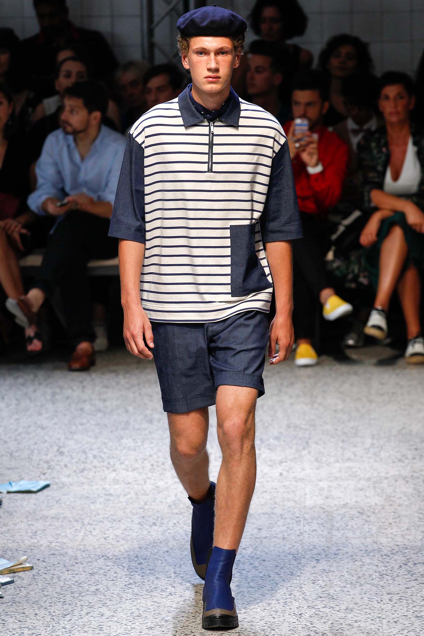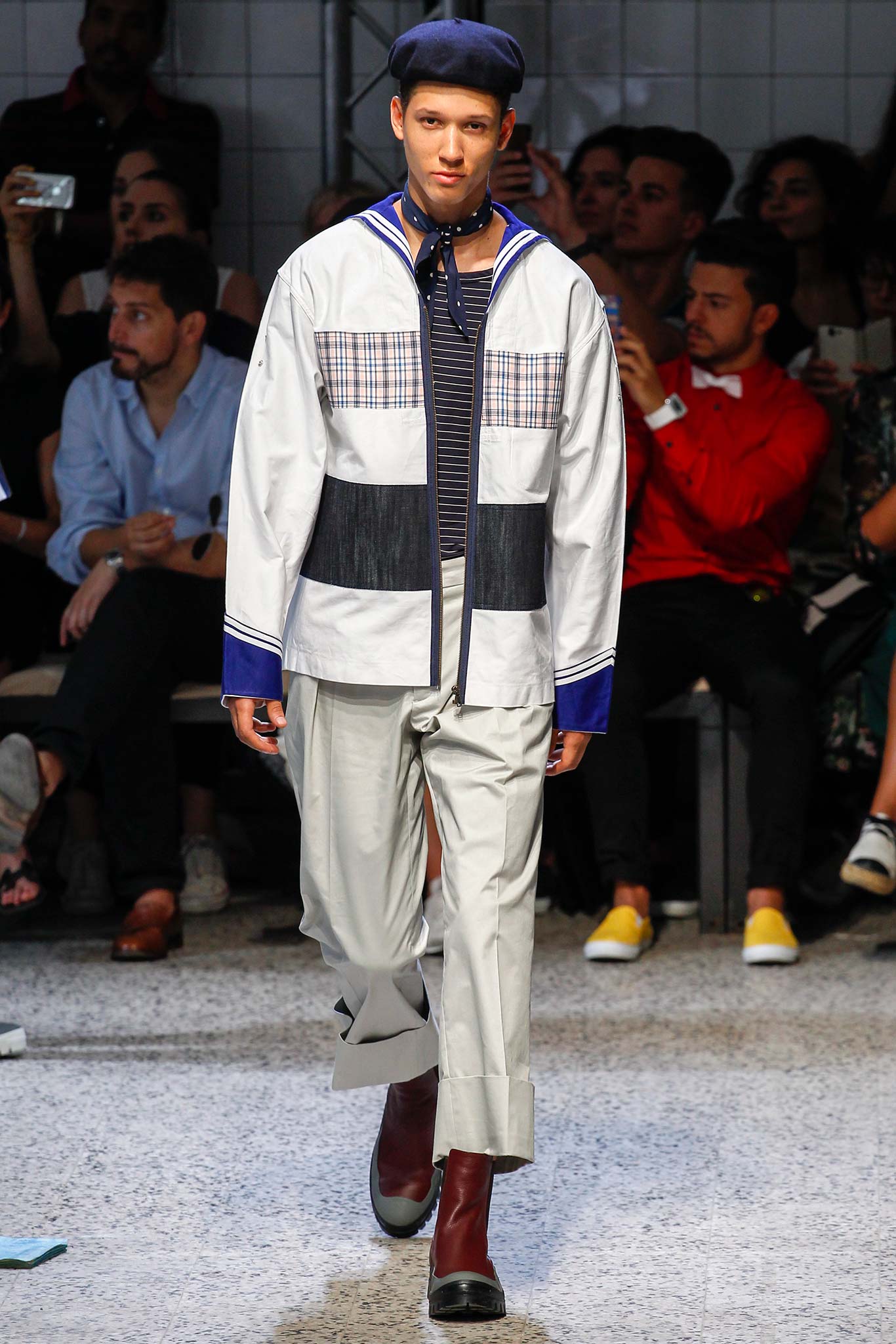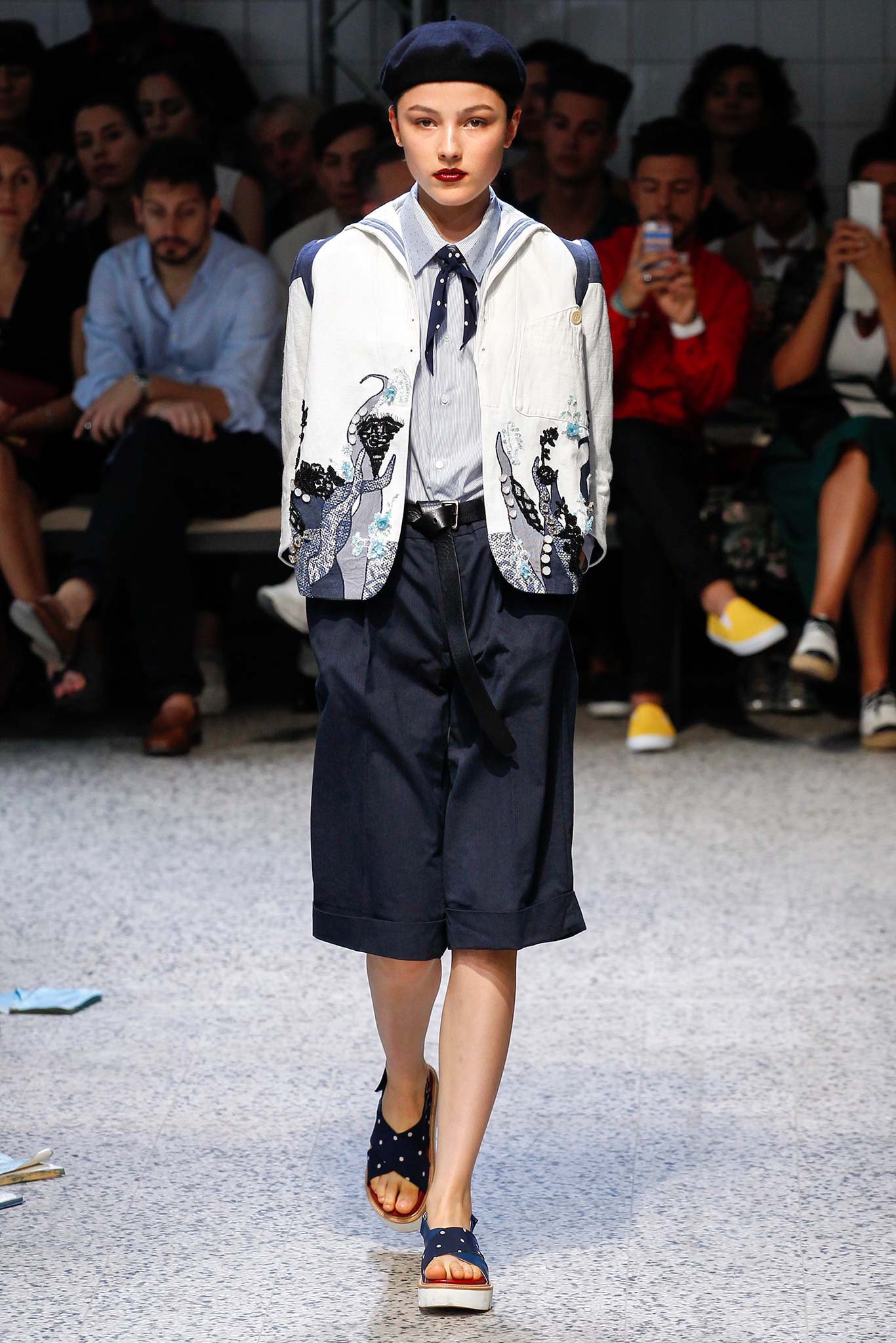 Sea waves were recreated on a range of pieces, including a peacoat and a tailored blazer, with a patchwork of different fabrics, while knitted sweaters cut in loose, relaxed silhouettes featured striped patterns. These were paired with knee-length shorts or slightly flared, cropped pants with cuffs.