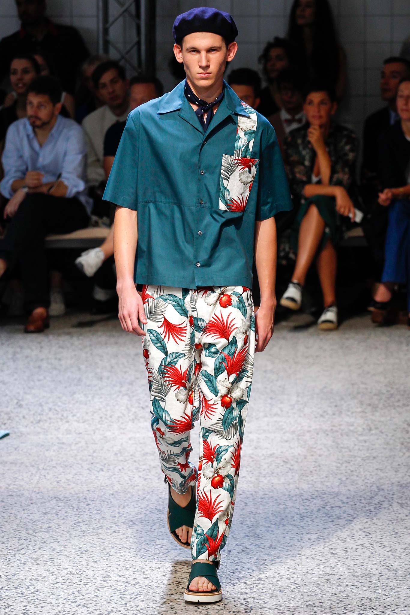 The nautical inspiration also met a military mood in a treated jersey jacket with utilitarian pockets, while an array of military green pieces were lightened up by inserts in a vibrant tropical pattern.