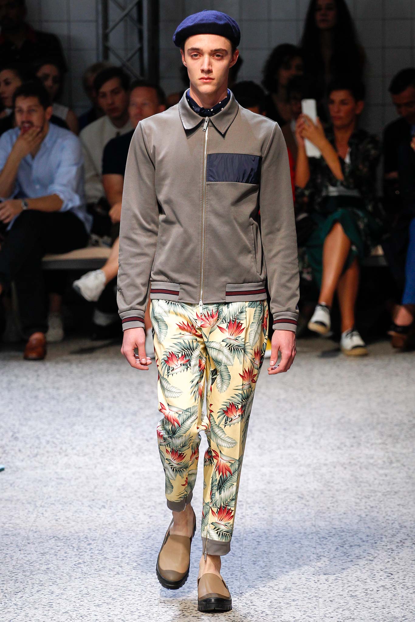 The nautical inspiration also met a military mood in a treated jersey jacket with utilitarian pockets, while an array of military green pieces were lightened up by inserts in a vibrant tropical pattern.
