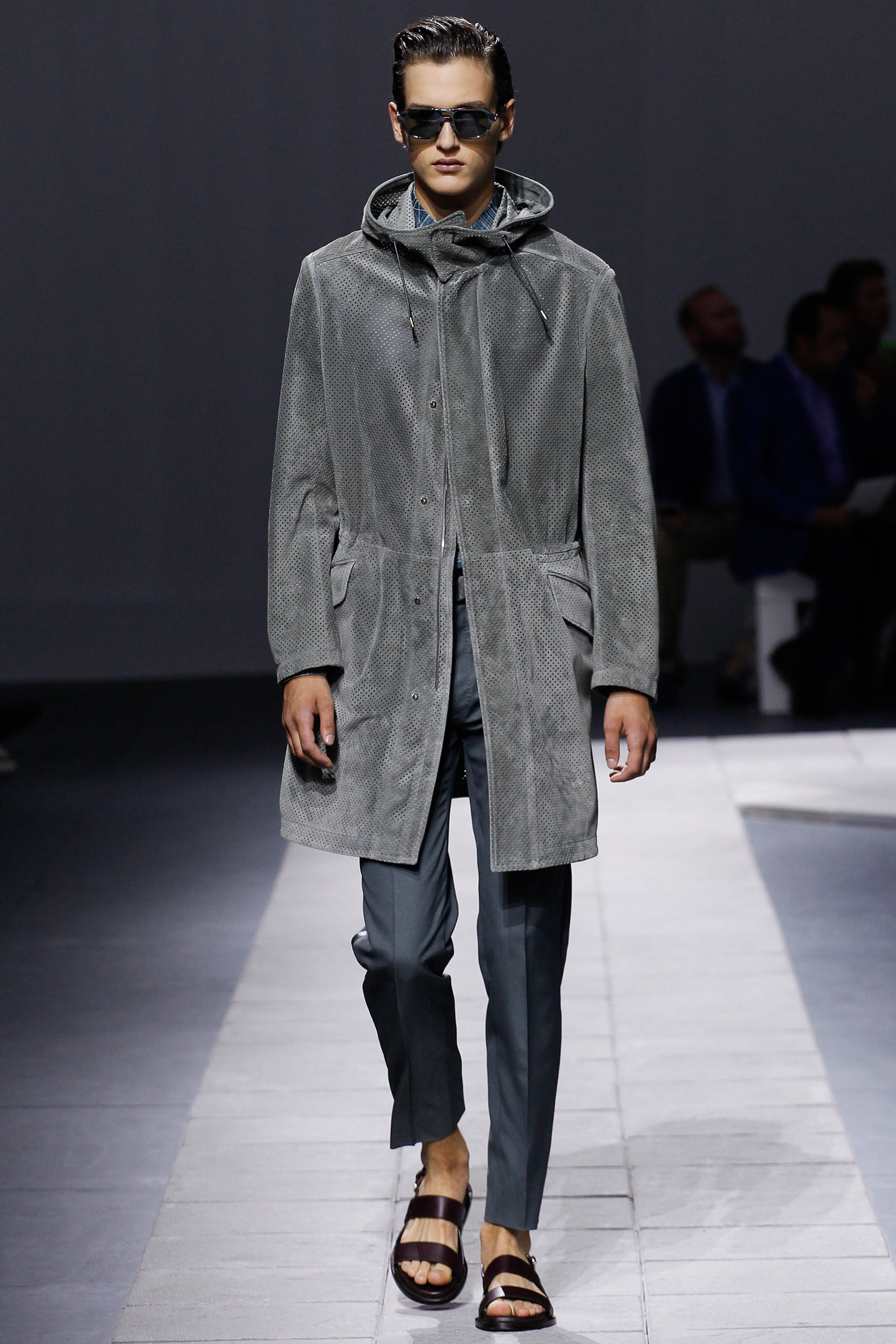 This Brioni guy would never risk ruining his impeccable gelled coiffure by getting stuck in the rain without an oversized parka of the same cubist motif as his evening wear.