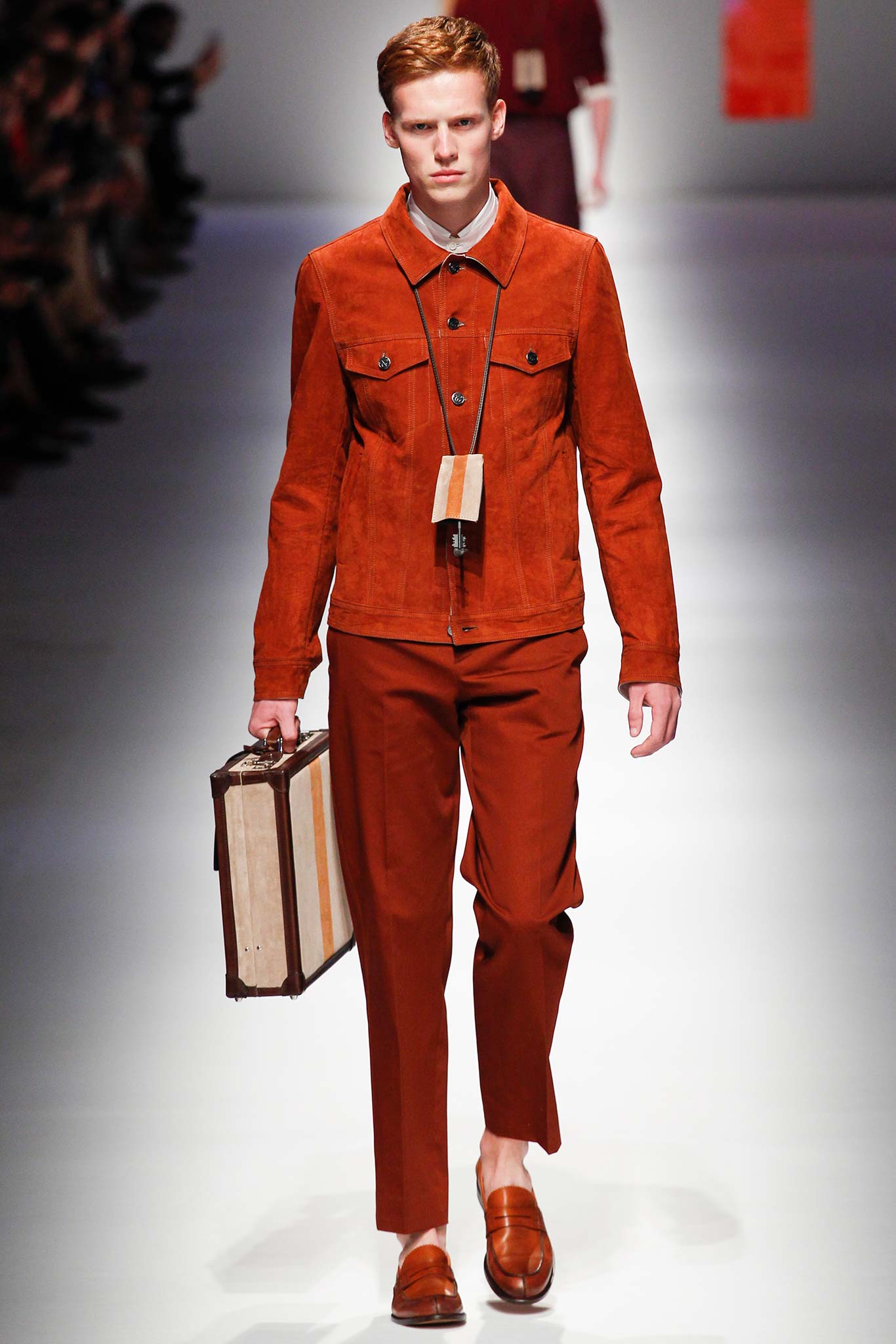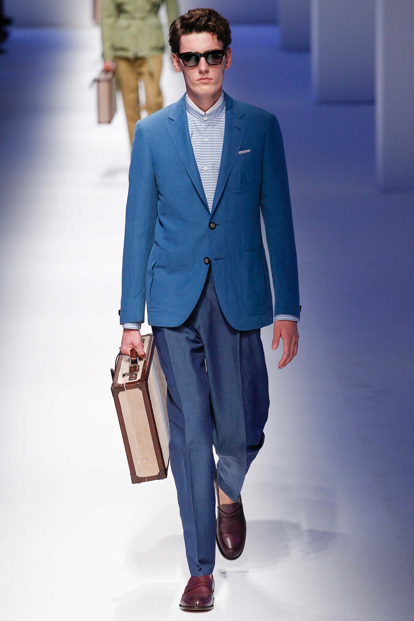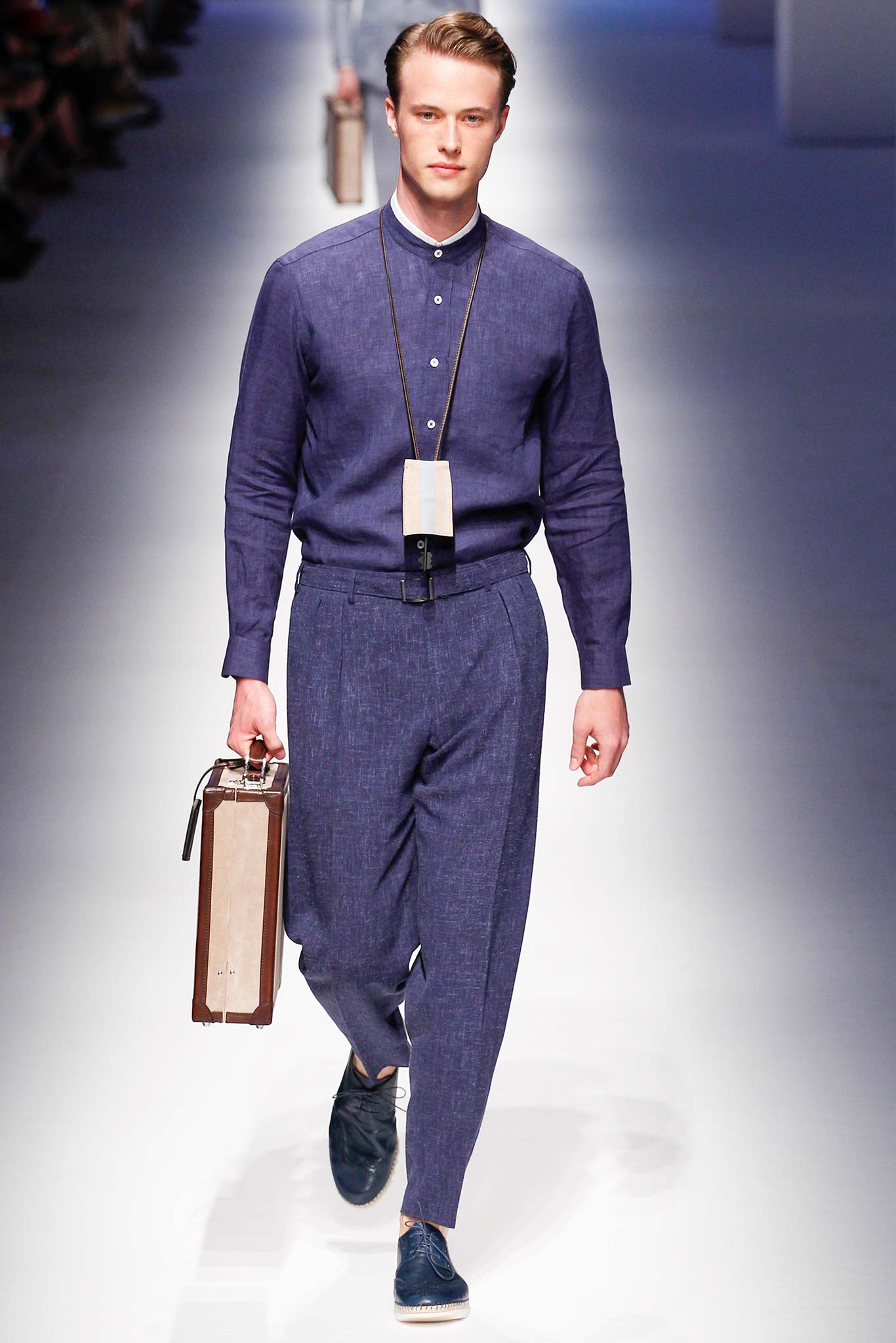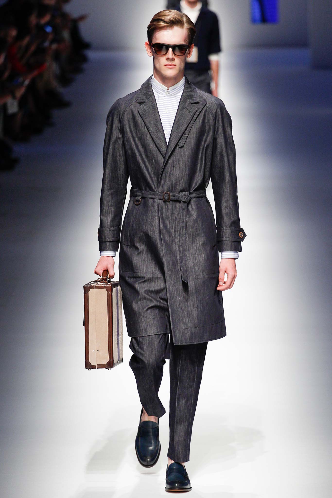 Pompilio also proved that he is plugged into what is trending in menswear. This was seen in his faux denim ensembles. A number of brands in Milan have been trying to trick their audiences by creating pieces that look like denim but are crafted out of jacquards or printed onto cotton. At Canali, the dark denim was crafted from a cool wool and linen blend, making it both urban and elegant.