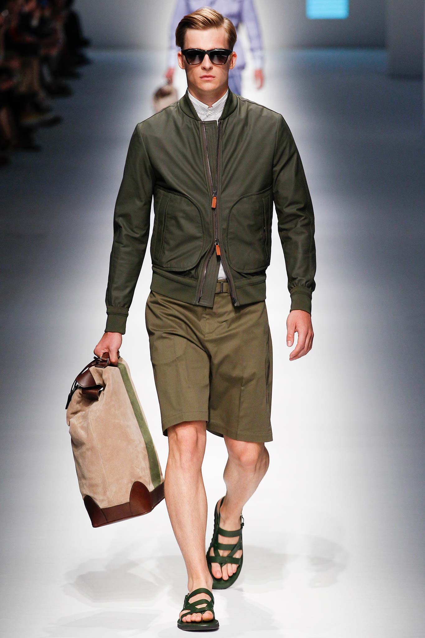 In that way, the audience was able to appreciate the crisp beauty of a lilac organza safari jacket and the precision folds of its pockets. They could almost touch the spongy cotton terry cloth textured fabric used to craft a horizontally striped brown jacket or a short sleeve cream top. And all the show’s luxe suede briefcases proved to have a strokeable decadence at the heart of their design.