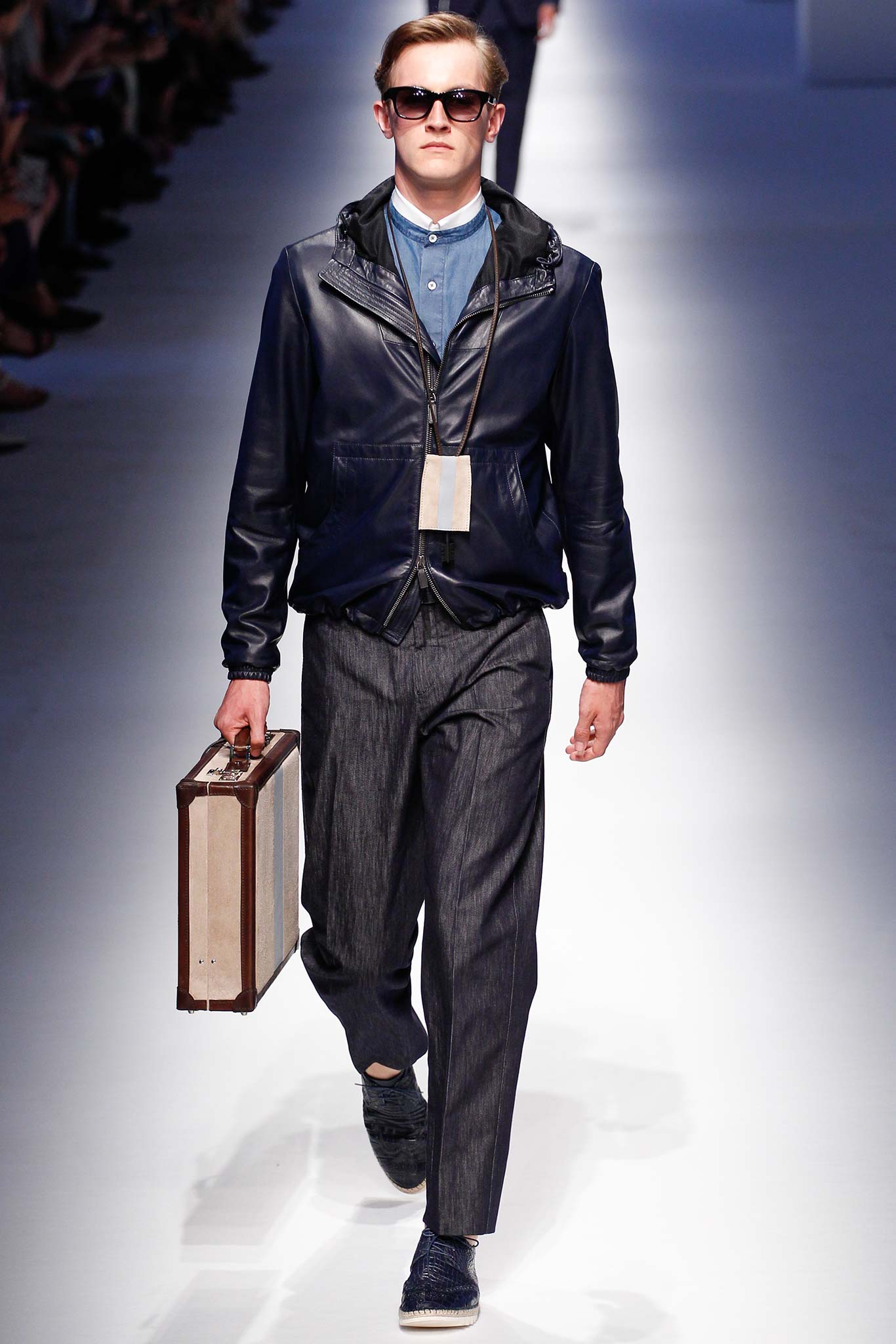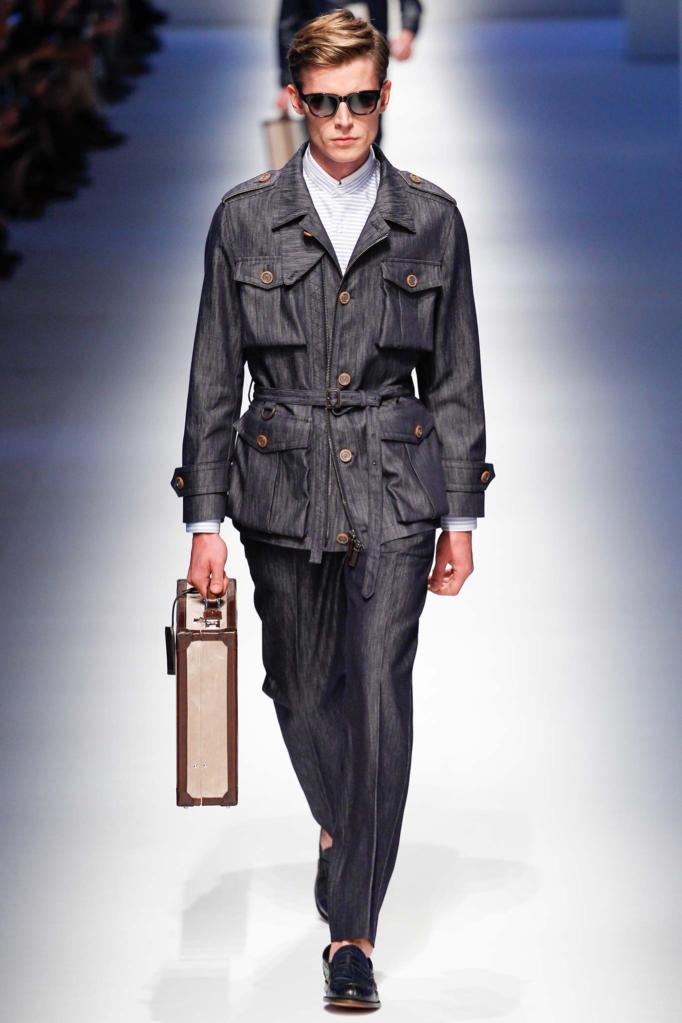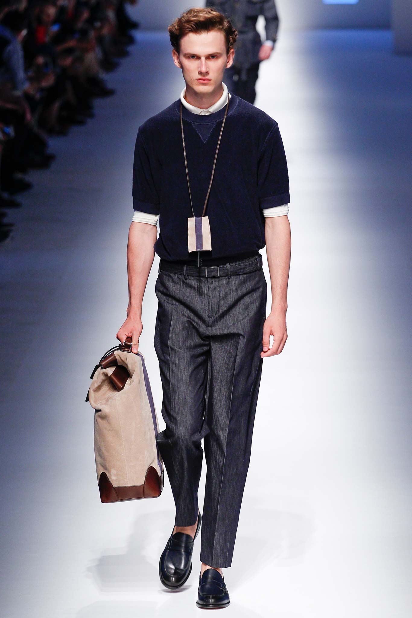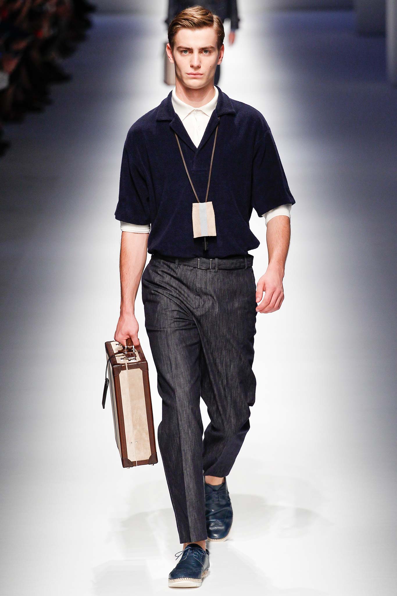 Pompilio also proved that he is plugged into what is trending in menswear. This was seen in his faux denim ensembles. A number of brands in Milan have been trying to trick their audiences by creating pieces that look like denim but are crafted out of jacquards or printed onto cotton. At Canali, the dark denim was crafted from a cool wool and linen blend, making it both urban and elegant.
