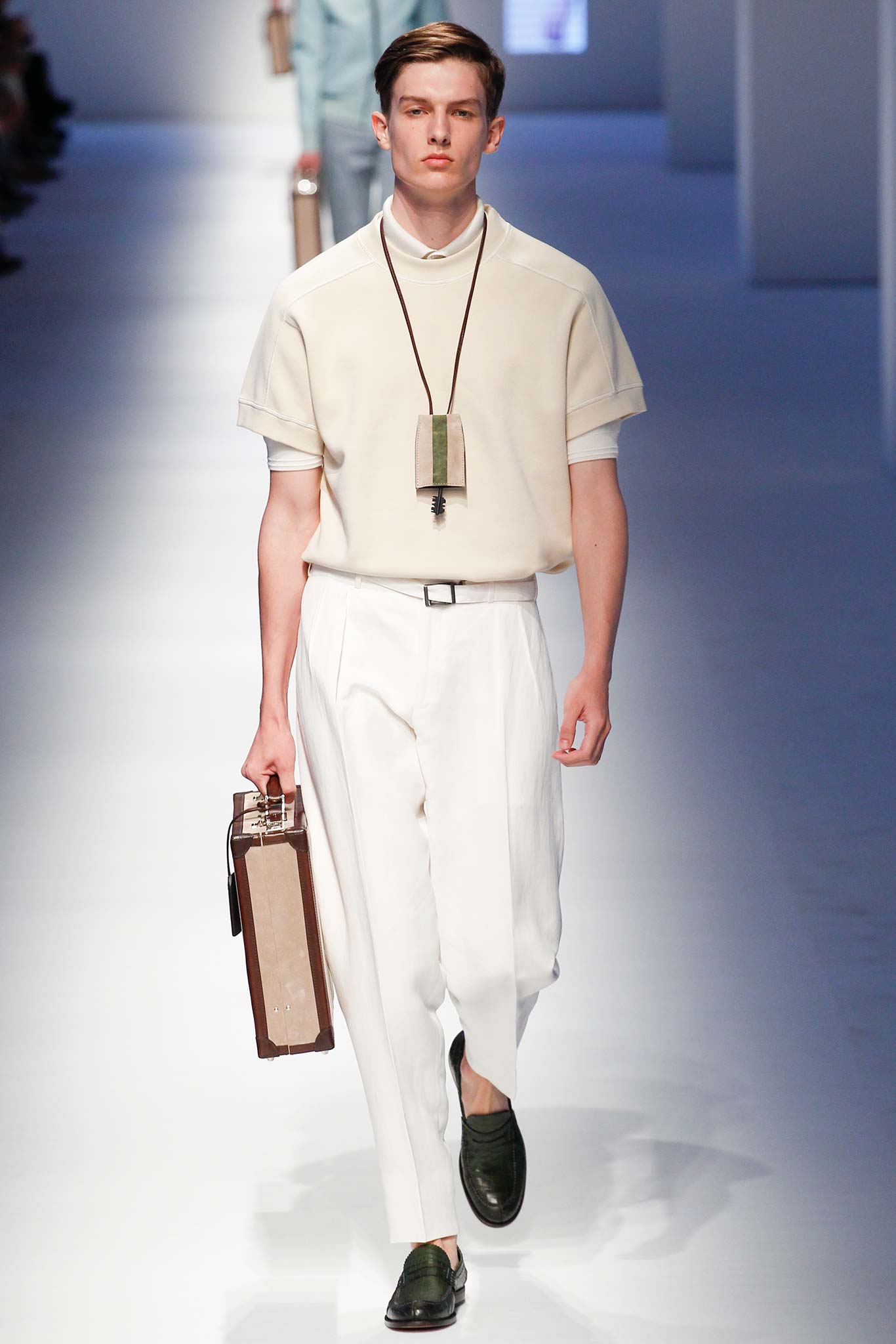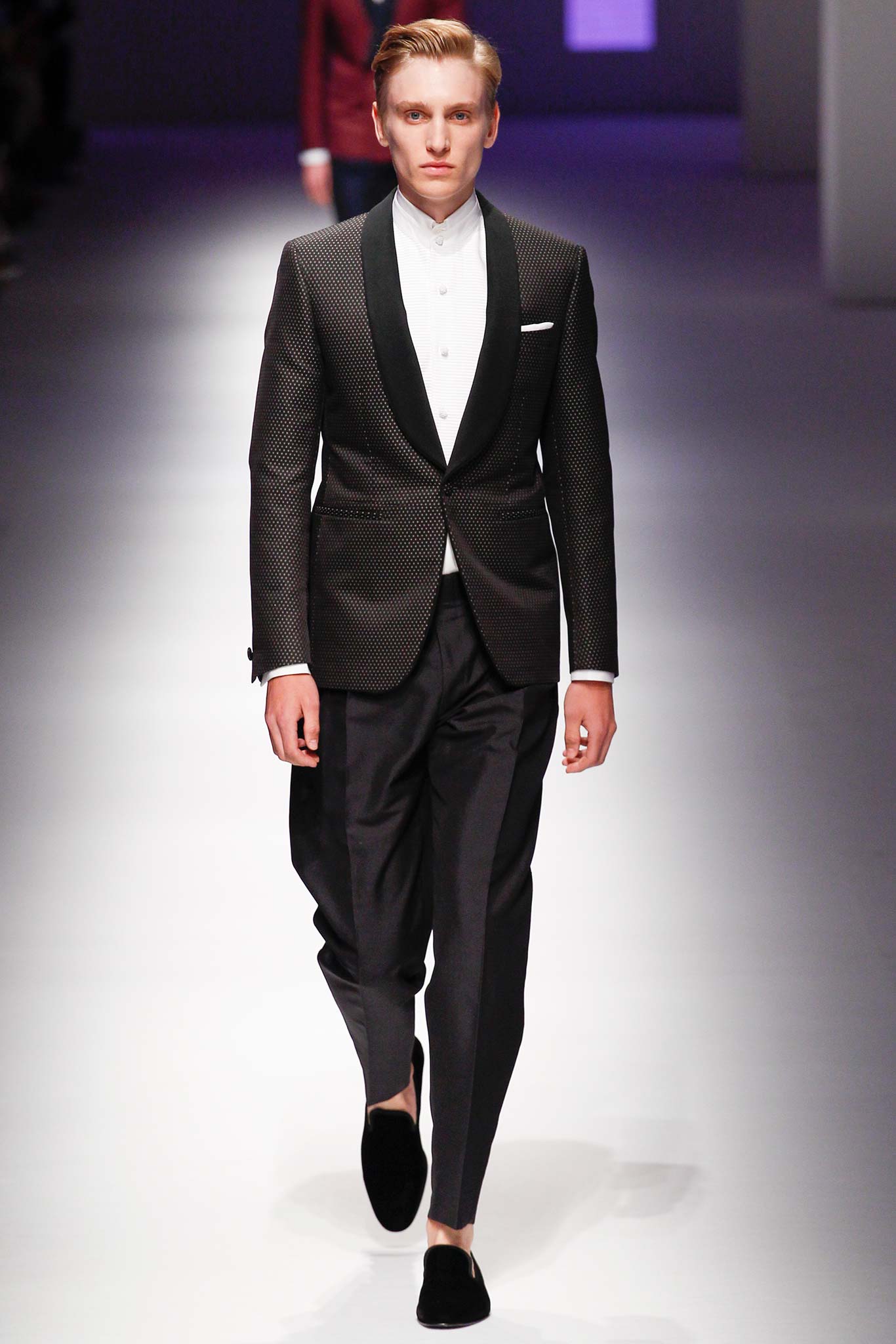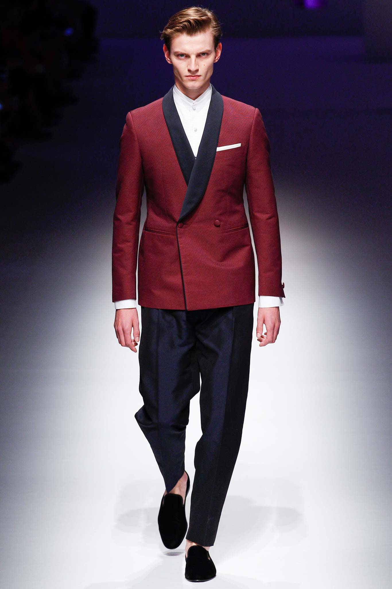 Pompilio also proved that he is plugged into what is trending in menswear. This was seen in his faux denim ensembles. A number of brands in Milan have been trying to trick their audiences by creating pieces that look like denim but are crafted out of jacquards or printed onto cotton. At Canali, the dark denim was crafted from a cool wool and linen blend, making it both urban and elegant.