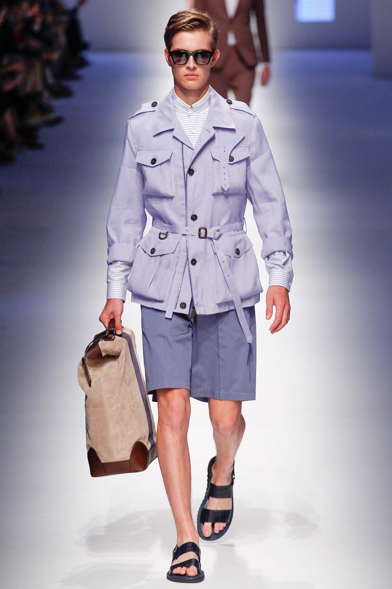 In that way, the audience was able to appreciate the crisp beauty of a lilac organza safari jacket and the precision folds of its pockets. They could almost touch the spongy cotton terry cloth textured fabric used to craft a horizontally striped brown jacket or a short sleeve cream top. And all the show’s luxe suede briefcases proved to have a strokeable decadence at the heart of their design.