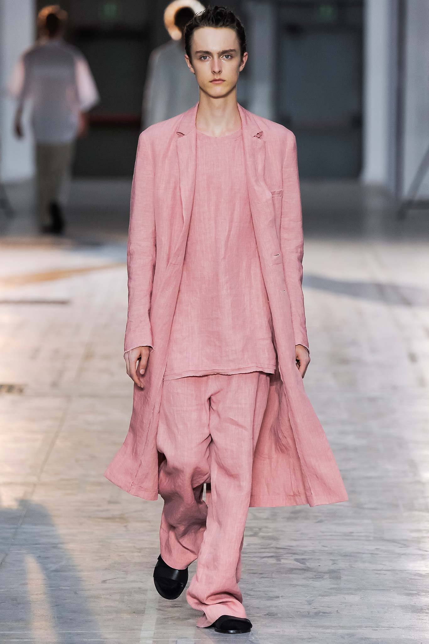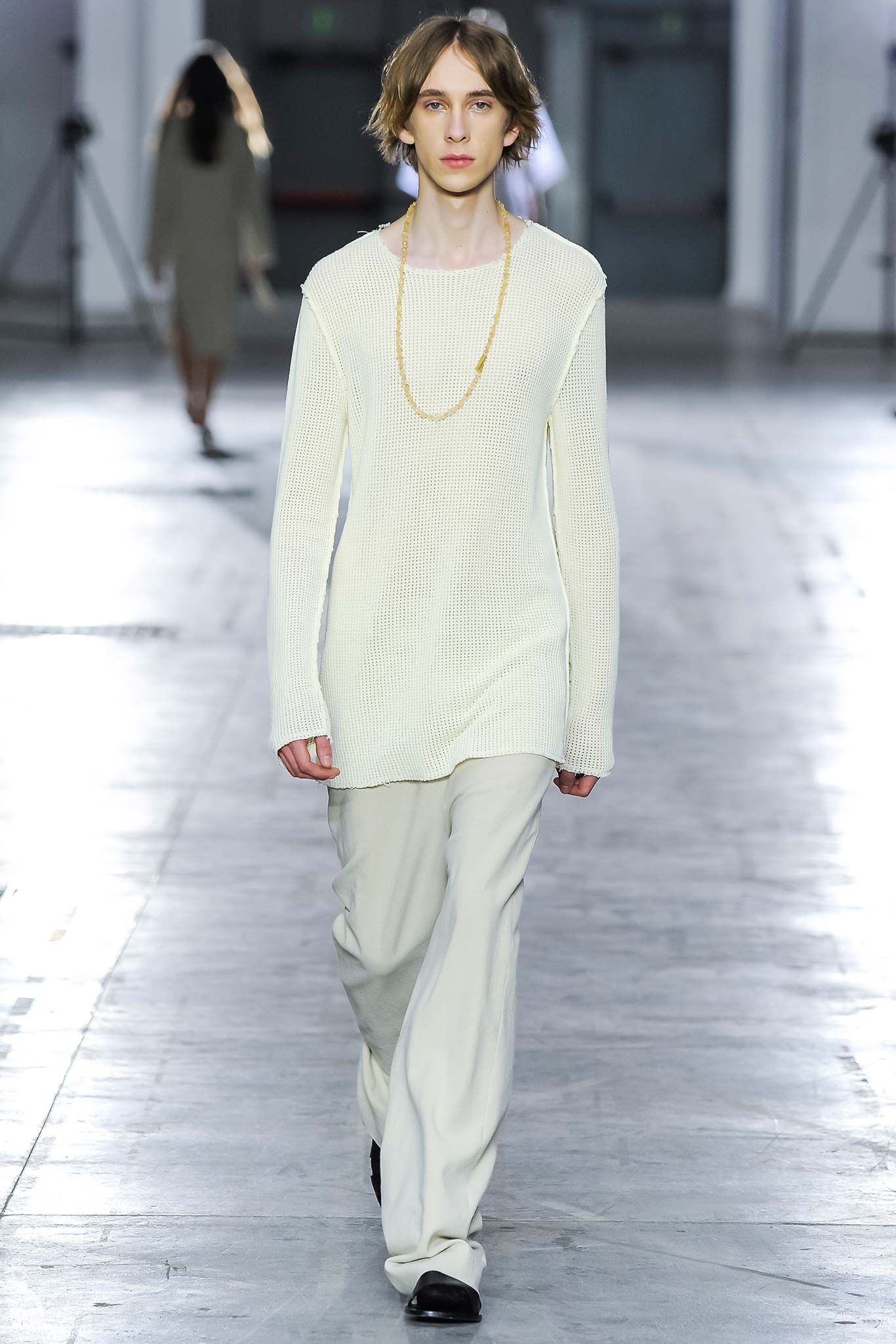 Linen and cotton floor-length looks slowly made their way down the runway. A-line tank top looks for men were fastened on the sides of the torso, lining the body with an architectural sense of structure.
