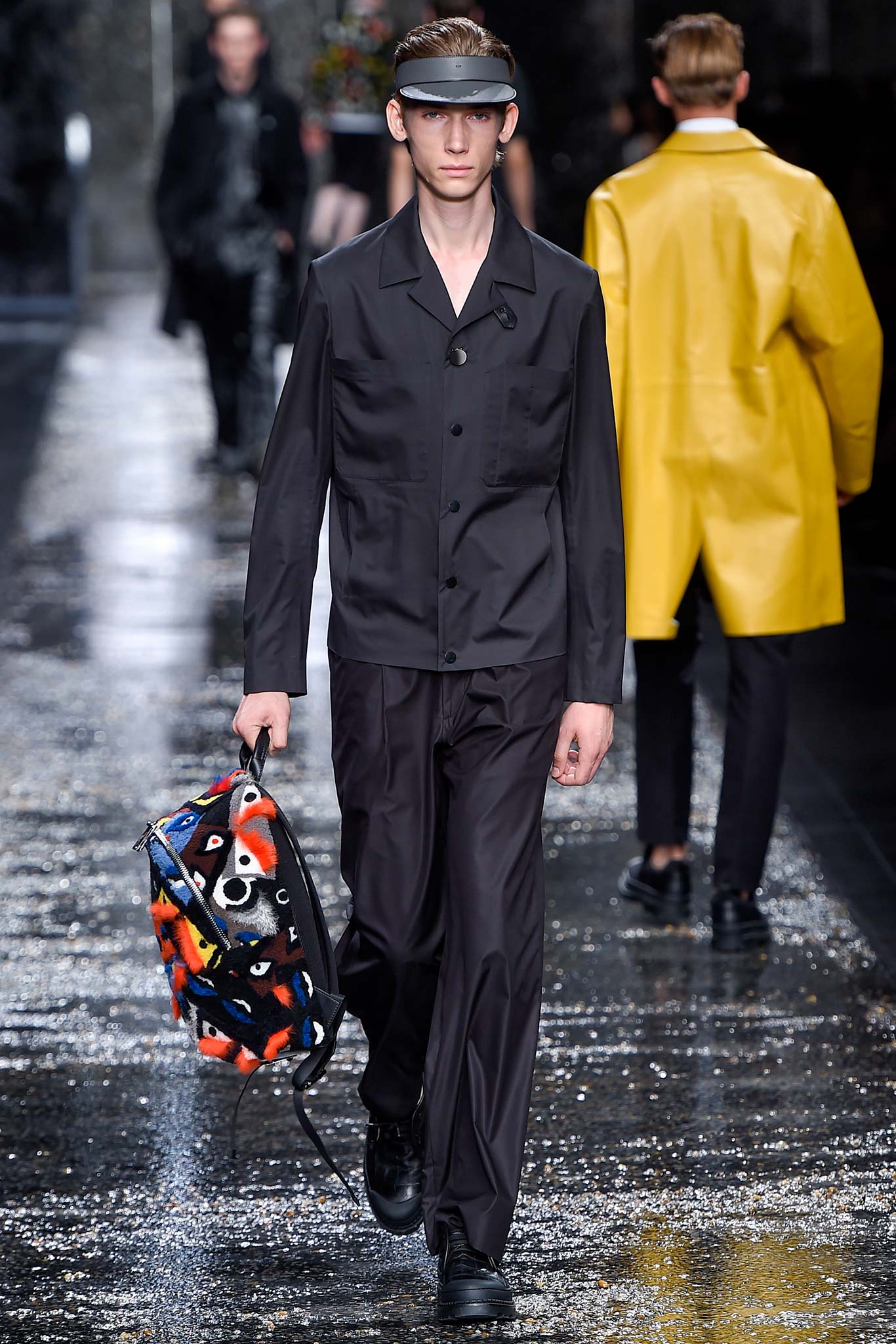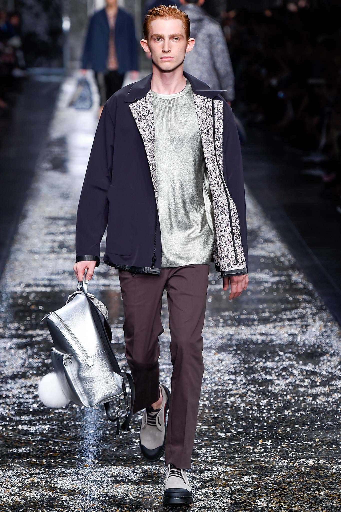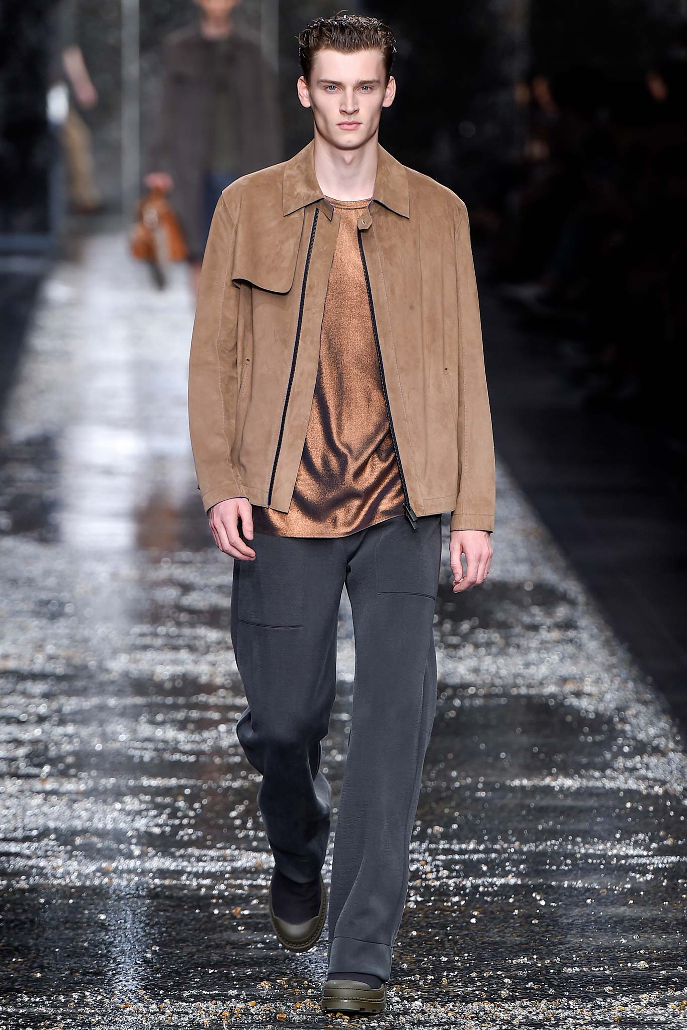 On what appeared to be a rain-slick gravel runway, designer Silvia Venturini Fendi sent out a menswear collection that was just as deceptively cool.