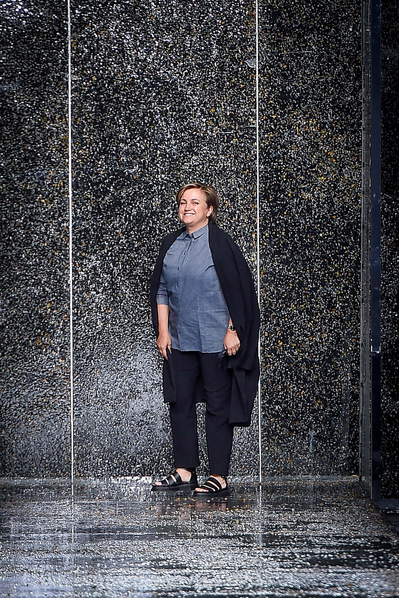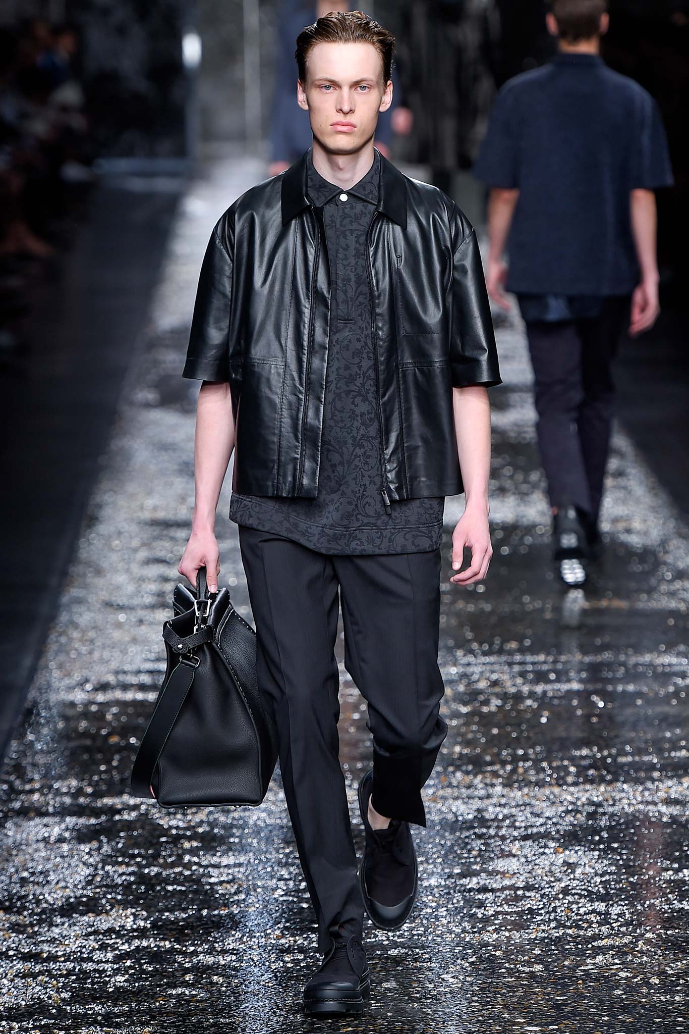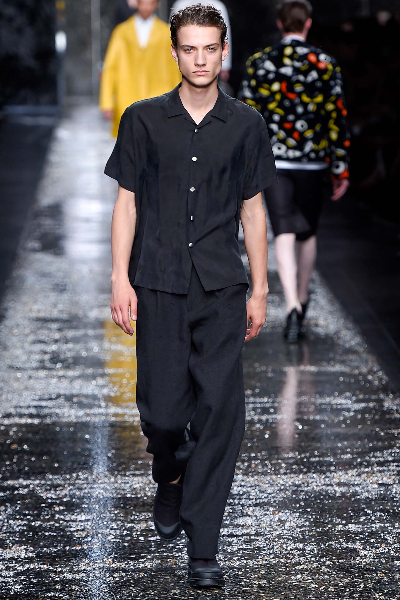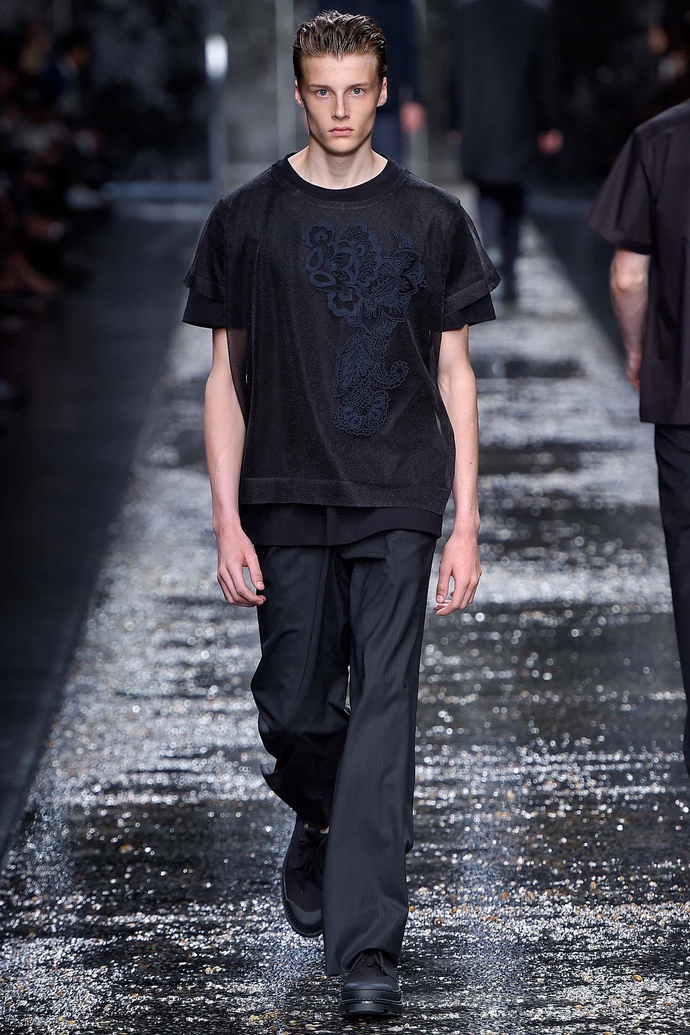 On what appeared to be a rain-slick gravel runway, designer Silvia Venturini Fendi sent out a menswear collection that was just as deceptively cool.